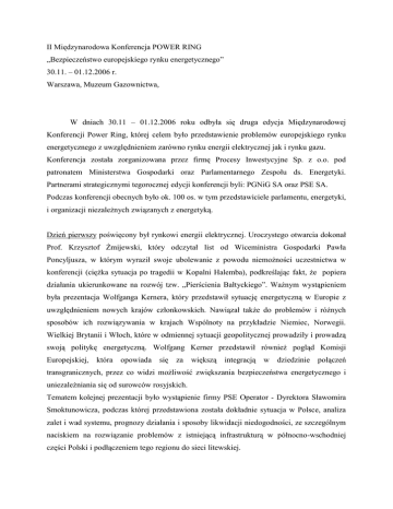 II Międzynarodowa Konferencja POWER RING „Bezpieczeństwo europejskiego rynku energetycznego” 30.11. – 01.12.2006 r. Warszawa, Muzeum Gazownictwa, W dniach 30.11 – 01.12.2006 roku odbyła się druga edycja Międzynarodowej Konferencji Power Ring, której celem było przedstawienie problemów europejskiego rynku energetycznego z uwzględnieniem zarówno rynku energii elektrycznej jak i rynku gazu. Konferencja została zorganizowana przez firmę Procesy Inwestycyjne Sp. z o.o. pod patronatem Ministerstwa Gospodarki oraz Parlamentarnego Zespołu ds. Energetyki. Partnerami strategicznymi tegorocznej edycji konferencji byli: PGNiG SA oraz PSE SA. Podczas konferencji obecnych było ok. 100 os. w tym przedstawiciele parlamentu, energetyki, i organizacji niezależnych związanych z energetyką. Dzień pierwszy poświęcony był rynkowi energii elektrycznej. Uroczystego otwarcia dokonał Prof. Krzysztof Żmijewski, który odczytał list od Wiceministra Gospodarki Pawła Poncyljusza, w którym wyraził swoje ubolewanie z powodu niemożności uczestnictwa w konferencji (ciężka sytuacja po tragedii w Kopalni Halemba), podkreślając fakt, że popiera działania ukierunkowane na rozwój tzw. „Pierścienia Bałtyckiego”. Ważnym wystąpieniem była prezentacja Wolfganga Kernera, który przedstawił sytuację energetyczną w Europie z uwzględnieniem nowych krajów członkowskich. Nawiązał także do problemów i różnych sposobów ich rozwiązywania w krajach Wspólnoty na przykładzie Niemiec, Norwegii. Wielkiej Brytanii i Włoch, które w odmiennej sytuacji geopolitycznej prowadziły i prowadzą swoją politykę energetyczną. Wolfgang Kerner przedstawił również pogląd Komisji Europejskiej, która opowiada się za większą integracją w dziedzinie połączeń transgranicznych, przez co widzi możliwość zwiększania bezpieczeństwa energetycznego i uniezależniania się od surowców rosyjskich. Tematem kolejnej prezentacji było wystąpienie firmy PSE Operator - Dyrektora Sławomira Smoktunowicza, podczas której przedstawiona została dokładnie sytuacja w Polsce, analiza zalet i wad systemu, prognozy działania i sposoby likwidacji niedogodności, ze szczególnym naciskiem na rozwiązanie problemów z istniejącą infrastrukturą w północno-wschodniej części Polski i podłączeniem tego regionu do sieci litewskiej. Przedstawiciel PGNiG Pan Sławomir Nestorowicz opowiedział się za wyraźna współpracą sektora gazowego i elektroenergetycznego na trzech poziomach systemowym, lokalnym i indywidualny. Ważnym elementem było omówienie „Porozumienia o Partnerstwie”. Prezentacja zakończona została stwierdzeniem, że dalsze funkcjonowanie naszego kraju oparte na wyłącznie na surowcach rosyjskich jest nieopłacalne, niebezpieczne i jedynym sensownym rozwiązaniem jest poszerzenie współpracy z krajami bałtyckimi, włączając je jednocześnie do struktur europejskich (poprzez połączenia Polski i Niemiec). Kolejnymi zagadnieniami wprowadzającymi szerszy aspekt rynku energii, było omówienie wyzwań technologicznych przez Krzysztofa Rogulski - HP Polska oraz Janusza Orłowskiego - Polkomtel. Stwierdzili oni, iż w ciągu 2-5 lat czekają nas rewolucyjne zmiany komputerowych systemów organizacyjnych i zarządzania, co w połączeniu z silnie rozbudowaną siecią teleinformatyczną daje możliwość stworzenia jednolitego systemu odpowiedzialnego za zarządzanie i bilingowanie w energetyce. Kwestią priorytetową tego dnia było przedstawienie zagadnień związanych z połączeniem Polska – Litwa. Temat szczególnie ważny w aspekcie wygaszania elektrowni jądrowych na Litwie. Prezentacje tych aspektów rozpoczął Dalius Sulga – Lietovus Energija wykazując, iż jego kraj będzie miał przejściowo problemy z mocą i bardzo potrzebne będzie wsparcie Polski w dostawach energii i w budowie kabla energetycznego biegnącego przez Polskę do Krajów Wspólnoty. Wsparcie tego projektu w obszarze inwestycyjno-technologicznym zaoferował Pan Peter Menke z firmy Siemens, przedstawiając możliwości firmy, jej potencjał, bazę naukowo-wykonawczą i wieloletnie doświadczenie w branży. Podczas wystąpienia zarówno strona litewska jak i firma SIEMENS zadeklarowały możliwość współpracy przy realizacji tak ważnego przedsięwzięcia. Kwestią istotną w realizowanych działaniach połączeń z Litwą, jest również aspekt środowiskowy, który w doskonały sposób został przedstawiony przez firmę EPC S.A, wskazując także złożone aspekty prawno-ekologiczne występujące na terenie przyszłej inwestycji. Ostatnim panelem dyskusyjnym było przedstawienie bałtyckiego rynku w aspekcie możliwości i wskazówek dla naszego kraju w realizacji działań „prorynkowych”. Wskazano mechanizm wzajemnych korzyści ze zbudowanego, zintegrowanego systemu energetycznego, w którym istnieje wiedza jest ile produkować energii, gdzie ją wysyłać i w jakiej cenie ją sprzedawać na jakich rynkach. Pierwszy dzień konferencji zamknięty został ogólną dyskusją na temat Narzędzi Politycznych i Rynkowych funkcjonujących na rynku energii i odpowiedzi zaproszonych gości na pytania słuchaczy. Dzień drugi konferencji poświęcony został rynkowi gazu. Wprowadzenie do zagadnień drugiego dnia dokonał prof. Krzysztof Żmijewski, następnie odbyła się niezwykle ciekawa prezentacja Jean-Marie Devosa – Eurogas, który zaprezentował bieżącą sytuację na rynku europejskim, realizację aktualnych projektów: rurociągów gazowych, m.in. z Libii do Włoch, z Turcji do Europy Zachodniej, z Rosji do Niemiec oraz sieci magazynów gazu w Wielkiej Brytanii, w Polsce i na terenie Niemiec. Przeprowadzona analiza wykazała, iż w Europie jest aktualnie za mało gazu i energii, dlatego przyszłość musi stać pod znakiem ogromnych inwestycji w tej dziedzinie. Kolejnym ważnym wnioskiem była kwestia możliwości ograniczenia, wiodącej roli Rosji i wypracowanie zasady utrzym