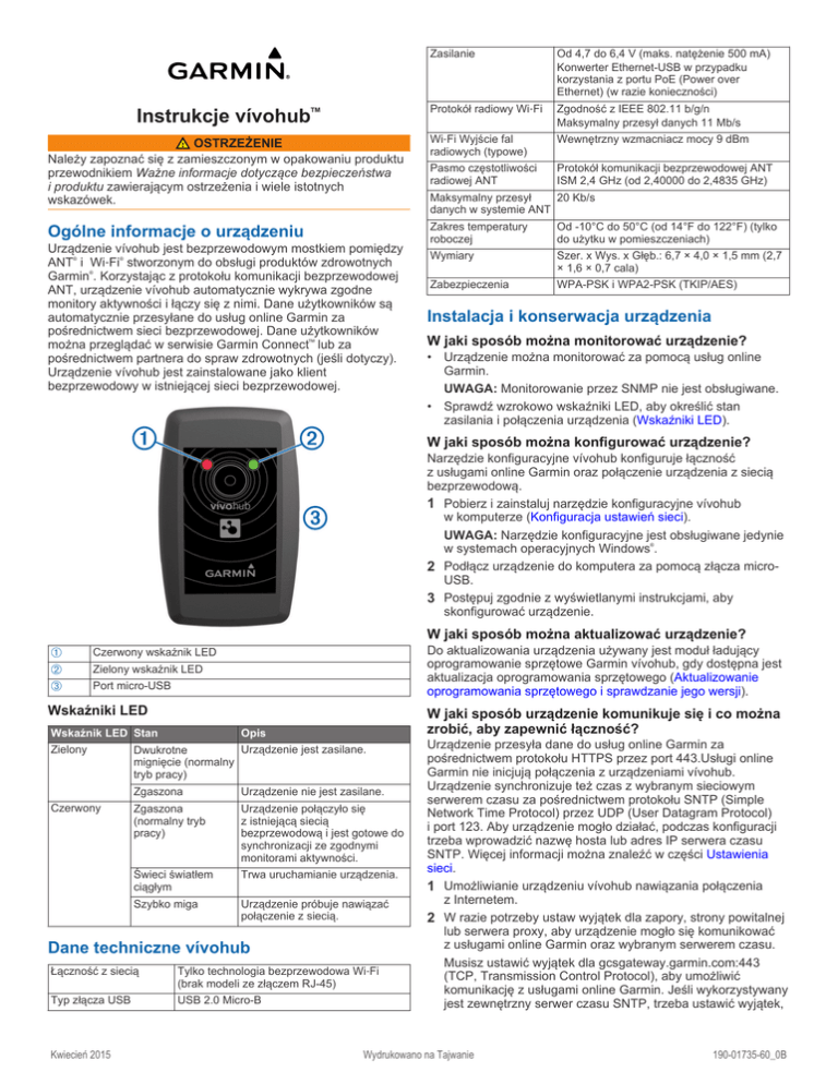 Zasilanie Od 4,7 do 6,4 V (maks. natężenie 500 mA) Konwerter Ethernet-USB w przypadku korzystania z portu PoE (Power over Ethernet) (w razie konieczności) Protokół radiowy Wi‑Fi Zgodność z IEEE 802.11 b/g/n Maksymalny przesył danych 11 Mb/s OSTRZEŻENIE Należy zapoznać się z zamieszczonym w opakowaniu produktu przewodnikiem Ważne informacje dotyczące bezpieczeństwa i produktu zawierającym ostrzeżenia i wiele istotnych wskazówek. Wi‑Fi Wyjście fal radiowych (typowe) Wewnętrzny wzmacniacz mocy 9 dBm Pasmo częstotliwości radiowej ANT Protokół komunikacji bezprzewodowej ANT ISM 2,4 GHz (od 2,40000 do 2,4835 GHz) Ogólne informacje o urządzeniu Zakres temperatury roboczej Od -10°C do 50°C (od 14°F do 122°F) (tylko do użytku w pomieszczeniach) Wymiary Szer. x Wys. x Głęb.: 6,7 × 4,0 × 1,5 mm (2,7 × 1,6 × 0,7 cala) Zabezpieczenia WPA-PSK i WPA2-PSK (TKIP/AES) Instrukcje vívohub™ Urządzenie vívohub jest bezprzewodowym mostkiem pomiędzy ANT i Wi‑Fi stworzonym do obsługi produktów zdrowotnych Garmin . Korzystając z protokołu komunikacji bezprzewodowej ANT, urządzenie vívohub automatycznie wykrywa zgodne monitory aktywności i łączy się z nimi. Dane użytkowników są automatycznie przesyłane do usług online Garmin za pośrednictwem sieci bezprzewodowej. Dane użytkowników można przeglądać w serwisie Garmin Connect™ lub za pośrednictwem partnera do spraw zdrowotnych (jeśli dotyczy). Urządzenie vívohub jest zainstalowane jako klient bezprzewodowy w istniejącej sieci bezprzewodowej. ® ® Maksymalny przesył 20 Kb/s danych w systemie ANT ® Instalacja i konserwacja urządzenia W jaki sposób można monitorować urządzenie? • Urządzenie można monitorować za pomocą usług online Garmin. UWAGA: Monitorowanie przez SNMP nie jest obsługiwane. • Sprawdź wzrokowo wskaźniki LED, aby określić stan zasilania i połączenia urządzenia (Wskaźniki LED). W jaki sposób można konfigurować urządzenie? Narzędzie konfiguracyjne vívohub konfiguruje łączność z usługami online Garmin oraz połączenie urządzenia z siecią bezprzewodową. 1 Pobierz i zainstaluj narzędzie konfiguracyjne vívohub w komputerze (Konfiguracja ustawień sieci). UWAGA: Narzędzie konfiguracyjne jest obsługiwane jedynie w systemach operacyjnych Windows . 2 Podłącz urządzenie do komputera za pomocą złącza microUSB. 3 Postępuj zgodnie z wyświetlanymi instrukcjami, aby skonfigurować urządzenie. ® W jaki sposób można aktualizować urządzenie? À Á Â Do aktualizowania urządzenia używany jest moduł ładujący oprogramowanie sprzętowe Garmin vívohub, gdy dostępna jest aktualizacja oprogramowania sprzętowego (Aktualizowanie oprogramowania sprzętowego i sprawdzanie jego wersji). Czerwony wskaźnik LED Zielony wskaźnik LED Port micro-USB Wskaźniki LED Wskaźnik LED Stan Zielony Czerwony W jaki sposób urządzenie komunikuje się i co można zrobić, aby zapewnić łączność? Opis Urządzenie jest zasilane. Dwukrotne mignięcie (normalny tryb pracy) Zgaszona Urządzenie nie jest zasilane. Zgaszona (normalny tryb pracy) Urządzenie połączyło się z istniejącą siecią bezprzewodową i jest gotowe do synchronizacji ze zgodnymi monitorami aktywności. Świeci światłem ciągłym Trwa uruchamianie urządzenia. Szybko miga Urządzenie próbuje nawiązać połączenie z siecią. Dane techniczne vívohub Łączność z siecią Tylko technologia bezprzewodowa Wi‑Fi (brak modeli ze złączem RJ-45) Typ złącza USB USB 2.0 Micro-B Kwiecień 2015 Urządzenie przesyła dane do usług online Garmin za pośrednictwem protokołu HTTPS przez port 443.Usługi online Garmin nie inicjują połączenia z urządzeniami vívohub. Urządzenie synchronizuje też czas z wybranym sieciowym serwerem czasu za pośrednictwem protokołu SNTP (Simple Network Time Protocol) przez UDP (User Datagram Protocol) i port 123. Aby urządzenie mogło działać, podczas konfiguracji trzeba wprowadzić nazwę hosta lub adres IP serwera czasu SNTP. Więcej informacji można znaleźć w części Ustawienia sieci. 1 Umożliwianie urządzeniu vívohub nawiązania połączenia z Internetem. 2 W razie potrzeby ustaw wyjątek dla zapory, strony powitalnej lub serwera proxy, aby urządzenie mogło się komunikować z usługami online Garmin oraz wybranym serwerem czasu. Musisz ustawić wyjątek dla gcsgateway.garmin.com:443 (TCP, Transmission Control Protocol), aby umożliwić komunikację z usługami online Garmin. Jeśli wykorzystywany jest zewnętrzny serwer czasu SNTP, trzeba ustawić wyjątek, Wydrukowano na Tajwanie 190-01735-60_0B aby łączyć się z wybranym serwerem czasu za pośrednictwem protokołu UDP przez port 123. Gdzie powinno być zainstalowane urządzenie? Umiejscowienie urządzenia zależy od liczby używanych urządzeń, wielkości budynku, wzorców ruchu i lokalizacji pracowników, a także częstotliwości gromadzenia danych. Więcej informacji można znaleźć w części Informacje dotyczące instalacji. • Urządzenie należy zainstalować w obszarze ogólnodostępnym. PORADA: W niektórych budynkach można zainstalować urządzenie we wspólnym korytarzu. W budynkach innego typu należy zainstalować wiele urządzeń, aby sprostać wymaganiom związanym z pracownikami. • Wszystkie urządzenia powinny zostać zainstalowane na ścianie lub na suficie. UWAGA: Każdy materiał znajdujący się pomiędzy urządzeniem i zgodnymi monitorami aktywności zmniejsza siłę sygnału radiowego. Niektóre materiały, takie jak metal, powodują zakłócenia. • Jeśli urządzenie jest zainstalowane we wnęce w suficie lub w szafie, należy przetestować skuteczność synchronizacji ze zgodnym monitorem aktywności. • Należy potwierdzić, że wszystkie urządzenia znajdują się w obszarze działania sieci bezprzewodowej. vívohubPomoc techniczna dotycząca urządzenia Jeśli urządzenie jest używane w ramach współpracy z partnerem do spraw zdrowotnych, s