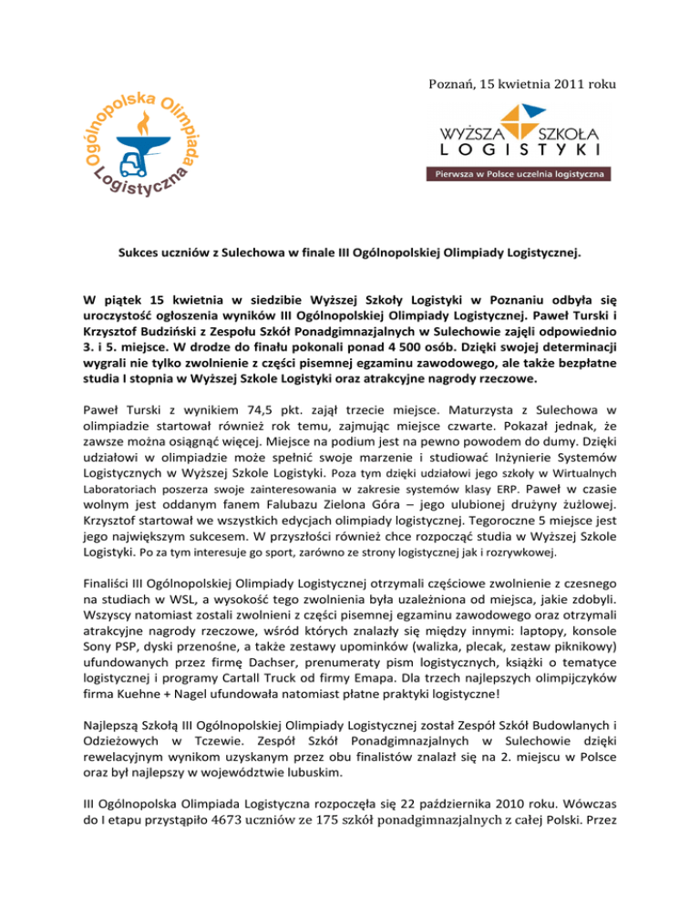Poznań, 15 kwietnia 2011 roku Sukces uczniów z Sulechowa w finale III Ogólnopolskiej Olimpiady Logistycznej. W piątek 15 kwietnia w siedzibie Wyższej Szkoły Logistyki w Poznaniu odbyła się uroczystość ogłoszenia wyników III Ogólnopolskiej Olimpiady Logistycznej. Paweł Turski i Krzysztof Budziński z Zespołu Szkół Ponadgimnazjalnych w Sulechowie zajęli odpowiednio 3. i 5. miejsce. W drodze do finału pokonali ponad 4 500 osób. Dzięki swojej determinacji wygrali nie tylko zwolnienie z części pisemnej egzaminu zawodowego, ale także bezpłatne studia I stopnia w Wyższej Szkole Logistyki oraz atrakcyjne nagrody rzeczowe. Paweł Turski z wynikiem 74,5 pkt. zajął trzecie miejsce. Maturzysta z Sulechowa w olimpiadzie startował również rok temu, zajmując miejsce czwarte. Pokazał jednak, że zawsze można osiągnąć więcej. Miejsce na podium jest na pewno powodem do dumy. Dzięki udziałowi w olimpiadzie może spełnić swoje marzenie i studiować Inżynierie Systemów Logistycznych w Wyższej Szkole Logistyki. Poza tym dzięki udziałowi jego szkoły w Wirtualnych Laboratoriach poszerza swoje zainteresowania w zakresie systemów klasy ERP. Paweł w czasie wolnym jest oddanym fanem Falubazu Zielona Góra – jego ulubionej drużyny żużlowej. Krzysztof startował we wszystkich edycjach olimpiady logistycznej. Tegoroczne 5 miejsce jest jego największym sukcesem. W przyszłości również chce rozpocząć studia w Wyższej Szkole Logistyki. Po za tym interesuje go sport, zarówno ze strony logistycznej jak i rozrywkowej. Finaliści III Ogólnopolskiej Olimpiady Logistycznej otrzymali częściowe zwolnienie z czesnego na studiach w WSL, a wysokość tego zwolnienia była uzależniona od miejsca, jakie zdobyli. Wszyscy natomiast zostali zwolnieni z części pisemnej egzaminu zawodowego oraz otrzymali atrakcyjne nagrody rzeczowe, wśród których znalazły się między innymi: laptopy, konsole Sony PSP, dyski przenośne, a także zestawy upominków (walizka, plecak, zestaw piknikowy) ufundowanych przez firmę Dachser, prenumeraty pism logistycznych, książki o tematyce logistycznej i programy Cartall Truck od firmy Emapa. Dla trzech najlepszych olimpijczyków firma Kuehne + Nagel ufundowała natomiast płatne praktyki logistyczne! Najlepszą Szkołą III Ogólnopolskiej Olimpiady Logistycznej został Zespół Szkół Budowlanych i Odzieżowych w Tczewie. Zespół Szkół Ponadgimnazjalnych w Sulechowie dzięki rewelacyjnym wynikom uzyskanym przez obu finalistów znalazł się na 2. miejscu w Polsce oraz był najlepszy w województwie lubuskim. III Ogólnopolska Olimpiada Logistyczna rozpoczęła się 22 października 2010 roku. Wówczas do I etapu przystąpiło 4673 uczniów ze 175 szkół ponadgimnazjalnych z całej Polski. Przez sześćdziesiąt minut odpowiadali na czterdzieści pytań, opracowanych przez Komitet Naukowy. Rozwiązując test jednokrotnego wyboru sprawdzali swoją wiedzę z zakresu terminologii logistycznej, umiejętności zarządzania zamówieniami, zakupami, dostawami oraz magazynami, a także z technik i technologii w procesach logistycznych. Do etapu okręgowego zakwalifikowało się 613 uczestników ze 100 szkół. Półfinał odbył się 10 grudnia 2010 roku w dwunastu miastach Polski. Ostateczna rozgrywka odbyła się 18 marca 2011 roku w siedzibie Wyższej Szkoły Logistyki. W finale startowało 53 uczniów. „W ciągu tych trzech lat olimpiada stała się jednym z najważniejszych wydarzeń z zakresu edukacji logistycznej w naszym kraju. Najlepiej świadczy o tym ciągle rosnąca liczba uczestników. Jesteśmy bardzo zadowoleni, że fakt ten doceniły też firmy z branży, które chętnie wspierają finansowo organizację tego wydarzenia.” – podsumował sukcesy olimpijczyków Wojciech Zalewski, rzecznik prasowy WSL. Organizatorem olimpiady jest Wyższa Szkoła Logistyki w Poznaniu. Patronat Honorowy nad konkursem objęło Ministerstwo Infrastruktury. Partnerami merytorycznymi olimpiady są: Instytut Logistyki i Magazynowania oraz Polskie Towarzystwo Logistyczne. Sponsorem Strategicznym została firma CHEP. Przedsięwzięcie wspierają również firmy: Agrobex, DPD, Emapa, Panopa, Dachser, VW Poznań, Omega-Pilzno (sponsoring złoty) oraz Still, TSLogistic, Epicor, Kuehne+Nagel, Raben, L-Systems, DHL Express, Kontenerowy.pl, (sponsoring srebrny). Patronat medialny: Czasopismo „Logistyka”, dziennik "Polska Głos Wielkopolski", "EuroLogistics", "TSL Biznes", „TopLogistyk”, „Logistyka a Jakość”, „Nowoczesny Magazyn”, „Transport i Spedycja”, Radio Planeta.fm, Perspektywy.pl, Logistyka.net.pl, Spedycje.pl, dlaStudenta.pl, Studentnews.pl, Forumtransportu.pl, Etransport.pl. Dodatkowe informacje: WOJCIECH ZALEWSKI KAROLINA ZIELIŃSKA Rzecznik Prasowy WSL Specjalista ds. PR tel. 061 850 47 88 tel. 061 850 47 82 [email protected] [email protected]