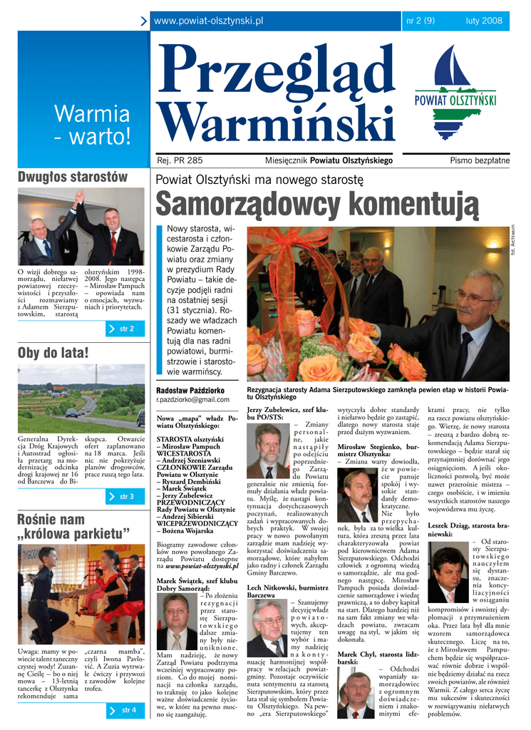 www.powiat-olsztynski.pl Rej. PR 285 O wizji dobrego samorządu, niełatwej powiatowej rzeczywistości i przyszłości rozmawiamy z Adamem Sierzputowskim, starostą olsztyńskim 19982008. Jego następca – Mirosław Pampuch – opowiada nam o emocjach, wyzwaniach i priorytetach. str 2 Oby do lata! Samorządowcy komentują Nowy starosta, wicestarosta i członkowie Zarządu Powiatu oraz zmiany w prezydium Rady Powiatu – takie decyzje podjęli radni na ostatniej sesji (31 stycznia). Roszady we władzach Powiatu komentują dla nas radni powiatowi, burmistrzowie i starostowie warmińscy. [email protected] Nowa „mapa” władz Powiatu Olsztyńskiego: skupca. Otwarcie ofert zaplanowano na 18 marca. Jeśli nic nie pokrzyżuje planów drogowców, prace ruszą tego lata. str 3 Rośnie nam „królowa parkietu” Uwaga: mamy w powiecie talent taneczny czystej wody! Zuzannę Cieślę – bo o niej mowa – 13-letnią tancerkę z Olsztynka rekomenduje sama „czarna mamba”, czyli Iwona Pavlović. A Zuzia wytrwale ćwiczy i przywozi z zawodów kolejne trofea. str 4 Pismo bezpłatne Powiat Olsztyński ma nowego starostę Radosław Paździorko Generalna Dyrekcja Dróg Krajowych i Autostrad ogłosiła przetarg na modernizację odcinka drogi krajowej nr 16 od Barczewa do Bi- Miesięcznik Powiatu Olsztyńskiego luty 2008 STAROSTA olsztyński – Mirosław Pampuch WICESTAROSTA – Andrzej Szeniawski CZŁONKOWIE Zarządu Powiatu w Olsztynie – Ryszard Dembiński – Marek Świątek – Jerzy Zubelewicz PRZEWODNICZĄCY Rady Powiatu w Olsztynie – Andrzej Sibierski WICEPRZEWODNICZĄCY – Bożena Wojarska Biogramy zawodowe członków nowo powołanego Zarządu Powiatu dostępne na www.powiat-olsztynski.pl Marek Świątek, szef klubu Dobry Samorząd: – Po złożeniu rezygnacji przez starostę Sierzputowskiego dalsze zmiany były nieuniknione. Mam nadzieję, że nowy Zarząd Powiatu podtrzyma wcześniej wypracowany poziom. Co do mojej nominacji na członka zarządu, to traktuję to jako kolejne ważne doświadczenie życiowe, w które na pewno mocno się zaangażuję. Rezygnacja starosty Adama Sierzputowskiego zamknęła pewien etap w historii Powiatu Olsztyńskiego Jerzy Zubelewicz, szef klubu PO/STS: – Zmiany personalne, jakie nastąpiły po odejściu poprzedniego Zarządu Powiatu generalnie nie zmienią formuły działania władz powiatu. Myślę, że nastąpi kontynuacja dotychczasowych poczynań, realizowanych zadań i wypracowanych dobrych praktyk. W swojej pracy w nowo powołanym zarządzie mam nadzieję wykorzystać doświadczenia samorządowe, które nabyłem jako radny i członek Zarządu Gminy Barczewo. Lech Nitkowski, burmistrz Barczewa – Szanujemy decyzję władz powiatowych, akceptujemy ten wybór i mamy nadzieję n a k o n t y nuację harmonijnej współpracy w relacjach powiatgminy. Pozostaje oczywiście nuta sentymentu za starostą Sierzputowskim, który przez lata stał się symbolem Powiatu Olsztyńskiego. Na pewno „era Sierzputowskiego” wytyczyła dobre standardy i niełatwo będzie go zastąpić, dlatego nowy starosta staje przed dużym wyzwaniem. Mirosław Stegienko, burmistrz Olsztynka: – Zmiana warty dowiodła, że w powiecie panuje spokój i wysokie standardy demokratyczne. Nie było p r z e p yc h a nek, była za to wielka kultura, która zresztą przez lata charakteryzowała powiat pod kierownictwem Adama Sierzputowskiego. Odchodzi człowiek z ogromną wiedzą o samorządzie, ale ma godnego następcę. Mirosław Pampuch posiada doświadczenie samorządowe i wiedzę prawniczą, a to dobry kapitał na start. Dlatego bardziej niż na sam fakt zmiany we władzach powiatu, zwracam uwagę na styl, w jakim się dokonała. Marek Chyl, starosta lidzbarski: – Odchodzi wspaniały samorządowiec z ogromnym doświadczeniem i znakomitymi efe- ktami pracy, nie tylko na rzecz powiatu olsztyńskiego. Wierzę, że nowy starosta – zresztą z bardzo dobrą rekomendacją Adama Sierzputowskiego – będzie starał się przynajmniej dorównać jego osiągnięciom. A jeśli okoliczności pozwolą, być może nawet przerośnie mistrza – czego osobiście, i w imieniu wszystkich starostów naszego województwa mu życzę. Leszek Dziąg, starosta braniewski: - Od starosty Sierzputowskiego nauczyłem się dystansu, znaczenia koncyliacyjności w osiąganiu kompromisów i swoistej dyplomacji z przymrużeniem oka. Przez lata był dla mnie wzorem samorządowca skutecznego. Liczę na to, że z Mirosławem Pampuchem będzie się współpracować równie dobrze i wspólnie będziemy działać na rzecz swoich powiatów, ale również Warmii. Z całego serca życzę mu sukcesów i skuteczności w rozwiązywaniu niełatwych problemów. fot. Archiwum Dwugłos starostów nr 2 (9) Chodź Pan na stronę Zmiana warty w Powiecie Olsztyńskim – dwugłos starostów Powiat Olsztyński będzie miał swój herb. Jego koncepcję autorstwa olsztyńskiego historyka Szymona Dreja przedstawiono radnym na ostatniej sesji Rady Powiatu w Olsztynie (31 stycznia). Jednak w związku z koniecznością przegłosowania kluczowych uchwał w sprawie zmian we władzach powiatu, zapadła decyzja, by kwestią herbu zająć się na następnej sesji. Do tego czasu radni zapoznają się ze szczegółami projektu. – Warto to zrobić, bo to historyczna decyzja – argumentował Zbigniew Szczypiński, szef klubu radnych LiD. – To sprawa, z którą warto się przespać – fot. Archiwum Przespać się z herbem Projekt herbu Powiatu Olsztyńskiego dodał Adam Kochanowski, radny klubu PO/STS. Dodajmy, że projekt herbu Powiatu Olsztyńskiego zyskał pozytywne opinie specjalistów: prof. Błażeja Śliwińskiego, heraldyka z Uniwersytetu Gdańskiego oraz olsztyńskich historyków ks. prof. Andrzeja Kopiczko i prof. Stanisława Achremczyka. R. P. fot. Radosław Paździorko Cesarz nadciąga Tak było w ubiegłym roku Przygotowania do drugiej rekonstrukcji bitwy napoleońskiej na „ruskim szańcu” w Jonkowie nabierają tempa. Organ