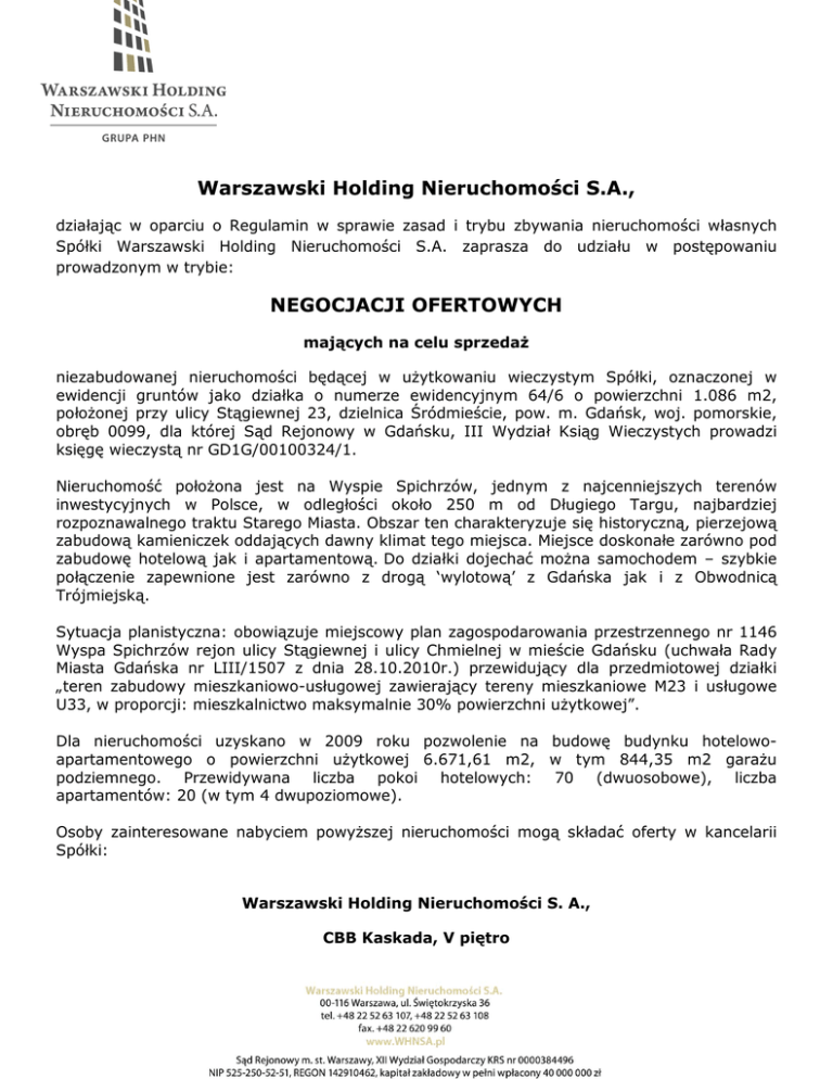 Warszawski Holding Nieruchomości S.A., działając w oparciu o Regulamin w sprawie zasad i trybu zbywania nieruchomości własnych Spółki Warszawski Holding Nieruchomości S.A. zaprasza do udziału w postępowaniu prowadzonym w trybie: NEGOCJACJI OFERTOWYCH mających na celu sprzedaŜ niezabudowanej nieruchomości będącej w uŜytkowaniu wieczystym Spółki, oznaczonej w ewidencji gruntów jako działka o numerze ewidencyjnym 64/6 o powierzchni 1.086 m2, połoŜonej przy ulicy Stągiewnej 23, dzielnica Śródmieście, pow. m. Gdańsk, woj. pomorskie, obręb 0099, dla której Sąd Rejonowy w Gdańsku, III Wydział Ksiąg Wieczystych prowadzi księgę wieczystą nr GD1G/00100324/1. Nieruchomość połoŜona jest na Wyspie Spichrzów, jednym z najcenniejszych terenów inwestycyjnych w Polsce, w odległości około 250 m od Długiego Targu, najbardziej rozpoznawalnego traktu Starego Miasta. Obszar ten charakteryzuje się historyczną, pierzejową zabudową kamieniczek oddających dawny klimat tego miejsca. Miejsce doskonałe zarówno pod zabudowę hotelową jak i apartamentową. Do działki dojechać moŜna samochodem – szybkie połączenie zapewnione jest zarówno z drogą ‘wylotową’ z Gdańska jak i z Obwodnicą Trójmiejską. Sytuacja planistyczna: obowiązuje miejscowy plan zagospodarowania przestrzennego nr 1146 Wyspa Spichrzów rejon ulicy Stągiewnej i ulicy Chmielnej w mieście Gdańsku (uchwała Rady Miasta Gdańska nr LIII/1507 z dnia 28.10.2010r.) przewidujący dla przedmiotowej działki „teren zabudowy mieszkaniowo-usługowej zawierający tereny mieszkaniowe M23 i usługowe U33, w proporcji: mieszkalnictwo maksymalnie 30% powierzchni uŜytkowej”. Dla nieruchomości uzyskano w 2009 roku pozwolenie na budowę budynku hotelowoapartamentowego o powierzchni uŜytkowej 6.671,61 m2, w tym 844,35 m2 garaŜu podziemnego. Przewidywana liczba pokoi hotelowych: 70 (dwuosobowe), liczba apartamentów: 20 (w tym 4 dwupoziomowe). Osoby zainteresowane nabyciem powyŜszej nieruchomości mogą składać oferty w kancelarii Spółki: Warszawski Holding Nieruchomości S. A., CBB Kaskada, V piętro Al. Jana Pawła II 12,00-124 WARSZAWA, z dopiskiem: Oferta na zakup nieruchomości, połoŜonej przy ulicy Stągiewnej 23 w Gdańsku. Ofertę naleŜy złoŜyć w nieprzejrzystej, trwale zamkniętej kopercie. Termin składania ofert upływa 25 lipca 2014r. Negocjacje rozpoczynają się po terminie składania ofert, o czym zostaną powiadomieni oferenci, którzy złoŜą oferty spełniające warunki formalne oraz zaproponują cenę równą lub wyŜszą od minimalnych oczekiwań Spółki Oferta winna być sporządzona w języku polskim, z zachowaniem formy pisemnej pod rygorem niewaŜności i zawierać informacje o proponowanej cenie oraz termin związania ofertą. Osoby przystępujące do udziału w negocjacjach zobowiązane są dołączyć do składanej oferty następujące dokumenty, które w przypadku kopii, powinny być potwierdzone za zgodność z oryginałem przez oferenta, jego pełnomocnika lub notariusza: 1. Pisemne oświadczenie o obowiązku zachowania tajemnicy handlowej, co do informacji dotyczących Spółki uzyskanych w trakcie negocjacji; 2. Osoby fizyczne – dokument potwierdzający toŜsamość (kserokopia dowodu osobistego lub paszportu); 3. Przedsiębiorcy wpisani do ewidencji działalności gospodarczej – dokument potwierdzający toŜsamość oraz aktualne zaświadczenie o wpisie do ewidencji działalności gospodarczej (wystawione nie wcześniej niŜ 3 miesiące przed upływem terminu składania ofert) lub wydruk z Centralnej Ewidencji i Informacji o Działalności Gospodarczej; 4. Reprezentanci spółki prawa handlowego – aktualny odpis z Krajowego Rejestru Sądowego (wystawiony nie wcześniej niŜ 3 miesiące przed upływem terminu składania ofert) lub wydruk z Centralnej Informacji Krajowego Rejestru Sądowego wykazujący umocowanie do reprezentowania danej spółki; 5. Pełnomocnicy – dokument potwierdzający toŜsamość i pisemne pełnomocnictwo oraz: - w przypadku osoby prawnej – oryginał aktualnego odpisu z Krajowego Rejestru Sądowego (wystawiony nie wcześniej niŜ 3 miesiące przed upływem terminu składania ofert) lub wydruk z Centralnej Informacji Krajowego Rejestru Sądowego, wskazujący umocowanie do reprezentowania danej osoby prawnej, - w przypadku przedsiębiorcy wpisanego do ewidencji działalności gospodarczej – oryginał aktualnego zaświadczenia o wpisie do ewidencji działalności gospodarczej (wystawione nie wcześniej niŜ 3 miesiące przed upływem terminu składania ofert) lub wydruk z Centralnej Ewidencji Działalności Gospodarczej aktualny w dacie wystawienia pełnomocnictwa, - w przypadku osób fizycznych – pełnomocnictwo w formie notarialnej; 6. Oświadczenie o zapoznaniu się ze stanem fizycznym i prawnym nieruchomości będącej przedmiotem postępowania; 7. Osoby fizyczne - oświadczenie o przetwarzaniu danych zawierające następującą klauzulę: [Imię i Nazwisko osoby biorącej udział w postępowaniu/reprezentującej Spółkę (firmę)] WyraŜam zgodę na przetwarzanie moich danych zawartych w ofercie w celach związanych z postępowaniem na sprzedaŜ nieruchomości połoŜonej przy ulicy Stągiewnej 23 w Gdańsku, zgodnie z ustawą z dnia 29.08.1997 o Ochronie Danych Osobowych 8. Cudzoziemcy mogą nabyć nieruchomość na zasadach określonych w ustawie z dnia 24 marca 1920 r. o nabywaniu nieruchomości przez cudzoziemców (Dz. U. z 2004 r. Nr 167 poz. 1758 z późn. zm.). Przed złoŜeniem oferty prosimy o zapoznanie się ze stanem faktycznym i prawnym nieruchomości. Informujemy, Ŝe granice nabywanej nieruchomości nie będą wznawiane na koszt WHN S.A. Koszt aktu notarialnego ponosi kupujący nieruchomość. Termin i miejsce podpisania umowy sprzedaŜy z osobą, która postępowanie wygrała, zostanie uzgodniony po zakończeniu postępowania. JeŜeli osoba, która wygrała postępowanie uchyla się od zawarcie u