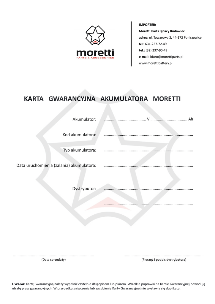 KARTA GWARANCYJNA AKUMULATORA MORETTI