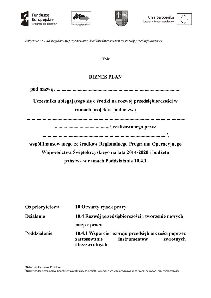 Załącznik nr 1 do Regulaminu przyznawania środków finansowych na rozwój przedsiębiorczości Wzór BIZNES PLAN pod nazwą ...................................................................................................... Uczestnika ubiegającego się o środki na rozwój przedsiębiorczości w ramach projektu pod nazwą ................................................................................................................................. ............................................1, realizowanego przez .....................................................................................................2, współfinansowanego ze środków Regionalnego Programu Operacyjnego Województwa Świętokrzyskiego na lata 2014-2020 i budżetu państwa w ramach Poddziałania 10.4.1 Oś priorytetowa 10 Otwarty rynek pracy Działanie 10.4 Rozwój przedsiębiorczości i tworzenie nowych miejsc pracy Poddziałanie 10.4.1 Wsparcie rozwoju przedsiębiorczości poprzez zastosowanie instrumentów zwrotnych i bezzwrotnych 1Należy podać nazwę Projektu. 2Należy podać pełną nazwę Beneficjenta realizującego projekt, w ramach którego przyznawane są środki na rozwój przedsiębiorczości SPIS TREŚCI 1. DANE WNIOSKODAWCY ............................................................................................ 3 1.1 PODSTAWOWE DANE ..................................................................................................... 3 1.2 DODSTAWOWE INFORMACJE ....................................................................................... 3 2. SKRÓCONY OPIS PRZEDSIĘWZIĘCIA ................................................................... 3 2.1 RODZAJ PROPONOWANEJ DZIAŁALNOŚCI ............................................................... 3 2.2 SKRÓCONE DANE DOTYCZĄCE PROPONOWANEJ INICJATYWY ........................ 4 3. PROJEKT PRZEDSIĘWZIĘCIA .................................................................................. 4 3.1 PRZEDSTAWIENIE PROJEKTU ...................................................................................... 4 3.2 OFERTA .............................................................................................................................. 5 3.3 RYNEK ................................................................................................................................ 5 3.4 KONKURENCJA ................................................................................................................ 5 3.5 CENA ................................................................................................................................... 6 3.6 SPRZEDAŻ I PRZYCHÓD ................................................................................................. 6 3.7 PROCES PRODUKCJI/DOSTARCZANIA ........................................................................ 6 3.8 ZAGROŻENIA I MOŻLIWOŚCI ....................................................................................... 7 4. PLAN INWESTYCYJNY.................................................................................................... 7 4.1 UZASADNIENIE INWESTYCJI ........................................................................................ 7 4.2 CHARAKTERYSTYKA INWESTYCJI ............................................................................. 7 4.3 ZAKRES INWESTYCJI ...................................................................................................... 8 4.4 ZASOBY LUDZKIE ............................................................................................................ 8 4.5 LOKALIZACJA I ZAPLECZE TECHNICZNE ................................................................. 8 5. PLAN EKONOMICZNO-FINANSOWY .......................................................................... 9 5.1 KALKULACJA KOSZTÓW PODJĘCIA DZIAŁALNOŚCI ............................................. 9 5.2 ŹRÓDŁA POKRYCIA WYDATKÓW ............................................................................. 10 5.3 PROGNOZA EKONOMICZNA PRZEDSIĘWZIĘCIA ................................................... 10 2 DANE WNIOSKODAWCY 1.1 PODSTAWOWE DANE Nazwisko i imiona PESEL, miejsce urodzenia NIP Adres zamieszkania Telefon E-mail 1.2 DODSTAWOWE INFORMACJE W tym miejscu należy opisać zdobyte wykształcenie, ewentualne odbyte kursy szkoleniowe i doskonalące, dotychczasowe doświadczenie zawodowe i wszelkie dodatkowe posiadane umiejętności oraz, jeśli to możliwe, wskazać i ocenić ich wagę i znaczenie w stosunku do zaproponowanego w niniejszym biznes planie przedsięwzięcia. Wykształcenie Kursy i szkolenia Doświadczenie zawodowe Dodatkowe umiejętności Stan przygotowań do podjęcia działalności gospodarczej 2. SKRÓCONY OPIS PRZEDSIĘWZIĘCIA 2.1 RODZAJ PROPONOWANEJ DZIAŁALNOŚCI Należy zaznaczyć tylko jeden, przeważający typ działalności prowadzonej w ramach proponowanego przedsięwzięcia. HANDLOWA USŁUGOWA 3 PRODUKCYJNA 2.2 SKRÓCONE DANE DOTYCZĄCE PROPONOWANEJ INICJATYWY Przedmiot inicjatywy (maksymalnie 200 znaków) Przedmiot i zakres planowanej działalności (według PKD lub EKD wraz z opisem) Lokalizacja przedsięwzięcia Powiat Gmina Obszar wiejski/miejski Czy wnioskodawca prowadził działalność gospodarczą? Jeśli tak, to kiedy i jaką, i czy korzystał z pomocy publicznej? Całkowity koszt przedsięwzięcia Kwota netto VAT Kwota brutto Wnioskowana kwota dotacji na rozpoczęcie działalności gospodarczej Źródła finansowania poza dotacją 3. PROJEKT PRZEDSIĘWZIĘCIA 3.1 PRZEDSTAWIENIE PROJEKTU Należy jak najdokładniej opisać działalność będącą przedmiotem inicjatywy, przyczyny, które skłoniły wnioskodawcę do takiego a nie innego wyboru oraz aspekty najlepiej charakteryzujące dany rynek. Poniższy opis powinien zawierać również określenie wielkości niezbędnych środków na rozpoczęcie działalności gospodarczej i plan ich wykorzystania, koncepcję prowadzenia i rozwoju