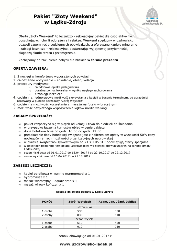 Pakiet "Złoty Weekend" w Lądku-Zdroju Oferta „Złoty Weekend” to leczniczo - rekreacyjny pakiet dla osób aktywnych poszukujących chwili odprężenia i relaksu. Weekend spędzony w uzdrowisku pozwoli zapomnieć o codziennych obowiązkach, a oferowane kąpiele mineralne i zabiegi leczniczo - relaksacyjne, dostarczając wyjątkowej przyjemności, złagodzą skutki stresu i przemęczenia. Zachęcamy do zakupienia pobytu dla bliskich w formie prezentu OFERTA ZAWIERA: 1. 2 noclegi w komfortowo wyposażonych pokojach 2. całodzienne wyżywienie – śniadanie, obiad, kolacja 3. procedury medyczne: o całodobowa opieka pielęgniarska o doraźna pomoc lekarska w wyniku nagłego zachorowania o 4 zabiegi lecznicze 4. codzienną, jednorazową możliwość skorzystania z kąpieli w basenie termalnym, po uprzedniej rezerwacji w punkcie sprzedaży "Zdrój Wojciech" 6. codzienną możliwość korzystania z masażu na fotelu wibracyjnym 7. możliwość bezpłatnego wypożyczenia kijków nordic walking ZASADY SPRZEDAŻY: • • • • • • • • pakiet rozpoczyna się w piątek od kolacji i trwa do niedzieli do śniadania w przypadku łączenia turnusów obiad w cenie pakietu doba hotelowa trwa od godz. 16:00 do godz. 12:00 przedłużenie doby hotelowej związane jest z naliczeniem opłaty w wysokości 50% ceny noclegu(w ramach możliwości organizacyjnych uzdrowiska) w okresie świąteczno–sylwestrowym od 21 XII do 01 I obowiązują oferty specjalne w obiektach pobierana jest opłata uzdrowiskowa wg stawek obowiązujących na terenie gminy Lądek-Zdrój sezon niski trwa od 01.01.2017 do 15.04.2017 i od 22.10.2017 do 22.12.2017 sezon wysoki trwa od 16.04.2017 do 21.10.2017 ZABIEGI LECZNICZE: • • • • kąpiel perełkowa w wannie marmurowej x 1 hydromasaż x 1 masaż wibracyjny – aquavibron x 1 masaż wirowy kończyn x 1 Koszt 3-dniowego pakietu w Lądku-Zdroju POKÓJ 1 osoba 2 osoby 1 osoba 2 osoby Zdrój Wojciech Adam, Jan, Józef, Jubilat sezon niski 530 830 sezon wysoki 610 910 cennik obowiązuje od 01.01.2017 r. 350 610 450 730