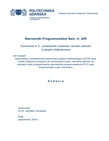 Katedra Inżynierii Systemów Sterowania Sterowniki Programowalne Sem. V, AiR Ćwiczenia nr 2 - przekaźniki czasowe i liczniki zdarzeń w języku drabinkowym Cel ćwiczeń: Zapoznanie z podstawowymi elementami języka drabinkowego LD/LAD (ang. Ladder Diagram) służącymi do odmierzania czasu i zliczania zdarzeń na potrzeby nauki programowania sterowników programowalnych PLC (ang. Programmable Logic Controller). Zadania Opracował: dr inż. Jarosław Tarnawski Data: październik, 2016 r. Przebieg ćwiczeń #2 SP - przekaźniki czasowe (timery), liczniki Zachęcenie Studentów do aktywnego uczestniczenia w zajęciach tj. do zgłaszania swoich uwag/pytań w dowolnym momencie zajęć. Podkreślenie, że zaproponowane rozwiązania nie są jedynymi możliwymi, a przemyślanymi i przejrzystymi propozycjami rozwiązań, Zachęcenie do weryfikowania na zajęciach laboratoryjnych wszystkich omawianych na Ć przykładów na ćwiczeniach obowiązuje zasada, że nie ma głupich pytań są tylko głupie odpowiedzi (proszę jej nie ekstrapolować na wszystkie dziedziny życia) 1. Zaprezentowanie różnicy pomiędzy timerami TMR i ONDTR 2. Podstawy czasowe TENTHS, HUNDS, THOUDS, (SEC - tylko PACS) i zakresu liczb 0-32767 jako PV 3. Wyjaśnienie zajęcia pamięci 3 rejestrów, CV, PV, CW i znaczenia (analiza rejestru CV) 3. Zakres stosowalności timerów 1ms (czas cyklu) ÷ 3276,7s, co zrobić jeśli potrzeba więcej czasu? 4. Konstrukcje z autoresetowaniem dla ONDTR i TMR - impuls co żądany okres przez jeden cykl 5. Program testowy z udziałem Studentów przy tablicy Po nieprzerwanym naciśnięciu przycisku przez 1,5 s, na czas 1 s ma zapalić się wyjście Q1, następnie ma zgasnąć, na 2 s ma zapalić się wyjście Q2, następnie ma zgasnąć i na 3 s ma zapalić się wyjście Q3. Jest to pierwsza ilustracja procesu sekwencyjnego. Dyskusja czy jest możliwość osiągnięcia tej funkcjonalności z jednym timerem 6. Zapoznanie z licznikiem UPCTR Wyjaśnienie zajęcia pamięci 3 rejestrów, CV, PV, CW i znaczenia (analiza rejestru CV) Konstrukcje z autoresetowaniem i automat skończony, licznik modulo X Podłączenie zmiennych systemowych z licznikami (%S5) Program testowy z udziałem Studentów przy tablicy Zegar GG:MM:SS Dyskusja czy jest możliwość osiągnięcia tej funkcjonalności z jednym licznikiem i operacjami relacji matematycznych Koniec pierwszej godziny zajęć -------------------------------------------------------------------------------------------Miniprojekt z sygnalizacją świetlną Rysunek sytuacyjny Oznaczenie adresów logicznych do fizycznych wyjść sygnalizatorów Zdefiniowanie tablicy procesu - określenie poszczególnych faz projektu, czasu ich trwania i zmiennych definiujących poszczególne fazy Program testowy z udziałem Studentów przy tablicy Zrealizowanie automatu przełączającego stany %M co określony w tablicy procesu czas poszczególnych faz Zrealizowanie fazy zainicjowania programu - jak poprawnie włączyć ten program (włączenie z ilustracją niewłaściwego włączenia z uzasadnieniem - dyskusja) Powiązanie stanów zawartych w tablicy procesu %M ze zmiennymi fizycznymi na sygnalizatorach %Q Zilustrowanie potencjalnego błędu polegającego na wielokrotnym użyciu jednego adresu przekaźnika Dyskusja czy da się ten program zrealizować z wykorzystaniem jednego timera i która wersja jest korzystniejsza wg różnych kryteriów oceny Pytania Studentów podczas zajęć warte odnotowania: - czy stosowanie licznika do zastosowań zegara nie wprowadza opóźnienia? - czy autoresetowanie nie wprowadza opóźnienia jednego cyklu?
