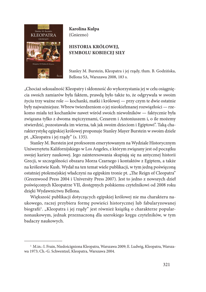 KAROLINA KULPA, HISTORIA KRÓLOWEJ Karolina Kulpa (Gniezno) HISTORIA KRÓLOWEJ, SYMBOLU KOBIECEJ SIŁY Stanley M. Burstein, Kleopatra i jej rządy, tłum. B. Godzińska, Bellona SA, Warszawa 2008, 183 s. „Chociaż seksualność Kleopatry i skłonność do wykorzystania jej w celu osiągnięcia swoich zamiarów była faktem, prawdą było także to, że odgrywała w swoim życiu trzy ważne role — kochanki, matki i królowej — przy czym te dwie ostatnie były najważniejsze. Wbrew twierdzeniom o jej nieokiełznanej rozwiązłości — rzekomo miała też kochanków nawet wśród swoich niewolników — faktycznie była związana tylko z dwoma mężczyznami, Cezarem i Antoniuszem i, o ile możemy stwierdzić, pozostawała im wierna, tak jak swoim dzieciom i Egiptowi”. Taką charakterystykę egipskiej królowej proponuje Stanley Mayer Burstein w swoim dziele pt. „Kleopatra i jej rządy” (s. 135). Stanley M. Burstein jest profesorem emerytowanym na Wydziale Historycznym Uniwersytetu Kalifornijskiego w Los Angeles, z którym związany jest od początku swojej kariery naukowej. Jego zainteresowania skupiają się na antycznej historii Grecji, w szczególności obszaru Morza Czarnego i kontaktów z Egiptem, a także na królestwie Kush. Wydał na ten temat wiele publikacji, w tym jedną poświęconą ostatniej ptolemejskiej władczyni na egipskim tronie pt. „The Reign of Cleopatra” (Greenwood Press 2004 i University Press 2007). Jest to jedno z nowszych dzieł poświęconych Kleopatrze VII, dostępnych polskiemu czytelnikowi od 2008 roku dzięki Wydawnictwu Bellona. Większość publikacji dotyczących egipskiej królowej nie ma charakteru naukowego, raczej przybiera formę powieści historycznej lub fabularyzowanej biografii1. „Kleopatra i jej rządy” jest również książką o charakterze popularnonaukowym, jednak przeznaczoną dla szerokiego kręgu czytelników, w tym badaczy naukowych. 1 M.in.: I. Frain, Niedościgniona Kleopatra, Warszawa 2009; E. Ludwig, Kleopatra, Warszawa 1973; Ch.-G. Schwentzel, Kleopatra, Warszawa 2004. 321 STUDIA EUROPAEA GNESNENSIA 5/2012 · RECENZJE Autor postawił sobie za zadanie ukazanie panowania Kleopatry VII, egipskiej królowej z I w. przed Chr., jako ostatniej sukcesorki Ptolemeuszy2, a także symbolu kobiecej siły, który trwa od ponad dwóch tysięcy lat w kulturze Zachodu. Burstein jest jednym z nielicznych historyków, który próbuje walczyć ze stereotypem królowej — „seksualnej drapieżnicy” (s. 7), chce także na nowo podjąć krytykę źródeł, głównie rzymskich, ukazujących władczynię. Książka została podzielona na sześć głównych rozdziałów z podrozdziałami, zawiera chronologię zdarzeń na początku tekstu, a także dodatki w formie krótkich biografii postaci wymienionych w publikacji, listy egipskich władców z dynastii ptolemejskiej, słowniczek, bibliografie i indeks. Przez umieszczoną chronologię zdarzeń od powstania Aleksandrii po śmierć Ptolemeusza z Mauretanii oraz pierwszy rozdział zatytułowany „Tło historyczne” autor wprowadza czytelnika w epokę hellenistyczną państwa Lagidów. Pozwala to zrozumieć przebieg rządów Kleopatry, a także uzmysłowić sobie proces przejmowania władzy w obrębie basenu Morza Śródziemnego przez Republikę Rzymską do okresu włączenia Egiptu w jej terytorium. W kolejnym rozdziale, „Życie Kleopatry”, historyk ukazuje biografię władczyni w ujęciu chronologicznym od przypuszczalnej daty urodzin aż do samobójczej śmierci. Autor próbuje sobie poradzić z rekonstrukcją nieznanych lat z życia królowej, przywołując fakty dotyczące jej najbliższej rodziny lub wpływowych Rzymian, z którymi miała kontakt — Juliusza Cezara oraz Marka Antoniusza. Prawie połowę treści rozdziału zajmują cytaty źródeł dotyczące omawianych wydarzeń, w tym z „Wojny domowej” Juliusza Cezara, „Wojny aleksandryjskiej” oraz „Żywotów sławnych mężów” Plutarcha (Gaius Iulius Caesar, Antonius). Trzeci rozdział, „Organizacja Egiptu Ptolemeuszów”, ukazuje funkcjonowanie państwa na podstawie zachowanych papirusów z dekretami i dokumentacją urzędową. Burstein opisuje złożony system administracyjny pod autokratycznym panowaniem dynastii uosabiającej zarówno sukcesorów faraonów, jak i macedońskich królów. Podkreśla przy tym wady ptolemejskiej administracji, która prowadziła do nadużyć ze strony urzędników, co odbijało się na sytuacji ekonomicznej państwa. Na uwagę zasługuje zamieszczenie treści dekretu wydanego przez Kleopatrę VII z przypuszczalnym jedynym zachowanym podpisem królowej (s. 95). Dwa następne rozdziały odzwierciedlają zainteresowania badawcze autora, który skupił się w nich na ukazaniu wielokulturowości w Egipcie, a szczególnie w Aleksandrii. 2 Zwanych także Lagidami od założyciela dynastii — Lagosa, ojca Ptolemeusza I. 322 KAROLINA KULPA, HISTORIA KRÓLOWEJ „Egipt Kleopatry: społeczność wielu kultur” poświęcono problematyce bycia nie-Egipcjaninem pod ptolemejskim panowaniem. Autor przedstawia państwo jako przykład wczesnej formy społeczności wielokulturowej, z jednej strony dokonującej akulturacji cudzoziemców, ale z drugiej jednocześnie ksenofobicznej. Koncentruje się na relacjach Greków i Żydów z ludnością egipską, przytaczając zachowane dekrety oraz pisma wspominające o stosunkach społecznych w państwie Ptolemeuszy, w tym kamień z Rosetty. Autor podkreśla wpływ religii na społeczność egipską, szczególnie w kontekście boga Serapisa, poświęcając problemowi krótki podrozdział. Piąty rozdział książki został zatytułowany „Aleksandria — miasto kultury i konfliktów”, przez co autor podkreślił wyjątkowe znaczenie stolicy Lagidów w świecie hellenistycznym. Po opisie geografii miasta, zawierającym obszerne cytaty z jednego z rozdziałów innego dzieła autora (s. 126)3, historyk przechodzi do przedstawienia Aleksandrii jako ko