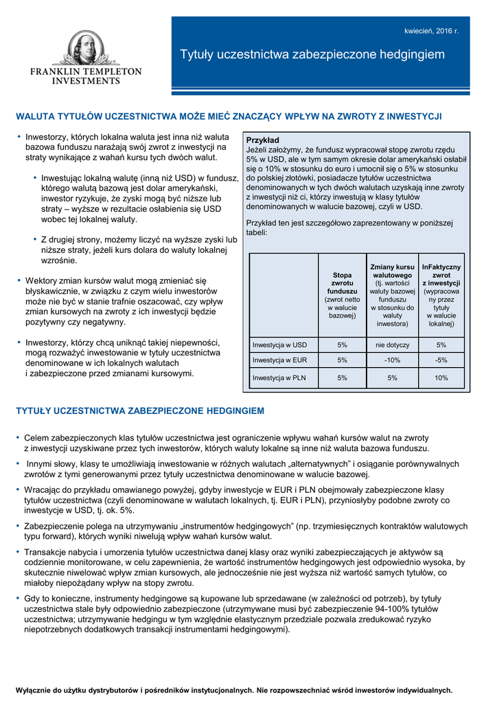 kwiecień, 2016 r. Tytuły uczestnictwa zabezpieczone hedgingiem WALUTA TYTUŁÓW UCZESTNICTWA MOŻE MIEĆ ZNACZĄCY WPŁYW NA ZWROTY Z INWESTYCJI • Inwestorzy, których lokalna waluta jest inna niż waluta Przykład Jeżeli założymy, że fundusz wypracował stopę zwrotu rzędu 5% w USD, ale w tym samym okresie dolar amerykański osłabił się o 10% w stosunku do euro i umocnił się o 5% w stosunku Inwestując lokalną walutę (inną niż USD) w fundusz, do polskiej złotówki, posiadacze tytułów uczestnictwa denominowanych w tych dwóch walutach uzyskają inne zwroty którego walutą bazową jest dolar amerykański, z inwestycji niż ci, którzy inwestują w klasy tytułów inwestor ryzykuje, że zyski mogą być niższe lub denominowanych w walucie bazowej, czyli w USD. straty – wyższe w rezultacie osłabienia się USD bazowa funduszu narażają swój zwrot z inwestycji na straty wynikające z wahań kursu tych dwóch walut. • wobec tej lokalnej waluty. • Z drugiej strony, możemy liczyć na wyższe zyski lub Przykład ten jest szczegółowo zaprezentowany w poniższej tabeli: niższe straty, jeżeli kurs dolara do waluty lokalnej wzrośnie. Stopa zwrotu funduszu (zwrot netto w walucie bazowej) Zmiany kursu walutowego (tj. wartości waluty bazowej funduszu w stosunku do waluty inwestora) InFaktyczny zwrot z inwestycji (wypracowa ny przez tytuły w walucie lokalnej) Inwestycja w USD 5% nie dotyczy 5% Inwestycja w EUR 5% -10% -5% Inwestycja w PLN 5% 5% 10% • Wektory zmian kursów walut mogą zmieniać się błyskawicznie, w związku z czym wielu inwestorów może nie być w stanie trafnie oszacować, czy wpływ zmian kursowych na zwroty z ich inwestycji będzie pozytywny czy negatywny. • Inwestorzy, którzy chcą uniknąć takiej niepewności, mogą rozważyć inwestowanie w tytuły uczestnictwa denominowane w ich lokalnych walutach i zabezpieczone przed zmianami kursowymi. TYTUŁY UCZESTNICTWA ZABEZPIECZONE HEDGINGIEM • Celem zabezpieczonych klas tytułów uczestnictwa jest ograniczenie wpływu wahań kursów walut na zwroty z inwestycji uzyskiwane przez tych inwestorów, których waluty lokalne są inne niż waluta bazowa funduszu. • Innymi słowy, klasy te umożliwiają inwestowanie w różnych walutach „alternatywnych” i osiąganie porównywalnych zwrotów z tymi generowanymi przez tytuły uczestnictwa denominowane w walucie bazowej. • Wracając do przykładu omawianego powyżej, gdyby inwestycje w EUR i PLN obejmowały zabezpieczone klasy tytułów uczestnictwa (czyli denominowane w walutach lokalnych, tj. EUR i PLN), przyniosłyby podobne zwroty co inwestycje w USD, tj. ok. 5%. • Zabezpieczenie polega na utrzymywaniu „instrumentów hedgingowych” (np. trzymiesięcznych kontraktów walutowych typu forward), których wyniki niwelują wpływ wahań kursów walut. • Transakcje nabycia i umorzenia tytułów uczestnictwa danej klasy oraz wyniki zabezpieczających je aktywów są codziennie monitorowane, w celu zapewnienia, że wartość instrumentów hedgingowych jest odpowiednio wysoka, by skutecznie niwelować wpływ zmian kursowych, ale jednocześnie nie jest wyższa niż wartość samych tytułów, co miałoby niepożądany wpływ na stopy zwrotu. • Gdy to konieczne, instrumenty hedgingowe są kupowane lub sprzedawane (w zależności od potrzeb), by tytuły uczestnictwa stale były odpowiednio zabezpieczone (utrzymywane musi być zabezpieczenie 94-100% tytułów uczestnictwa; utrzymywanie hedgingu w tym względnie elastycznym przedziale pozwala zredukować ryzyko niepotrzebnych dodatkowych transakcji instrumentami hedgingowymi). Wyłącznie do użytku dystrybutorów i pośredników instytucjonalnych. Nie rozpowszechniać wśród inwestorów indywidualnych. Tytuły uczestnictwa zabezpieczone hedgingiem O CZYM TRZEBA PAMIĘTAĆ INWESTUJĄC W ZABEZPIECZONE TYTUŁY UCZESTNICTWA • Nie ma zabezpieczeń doskonałych. Choć celem zabezpieczonych klas tytułów uczestnictwa jest zapewnienie inwestycjom w różnych walutach porównywalnych zwrotów, wyniki tych klas tytułów mogą nieco odbiegać od wyników klas tytułów denominowanych w walucie bazowej (lub w innych walutach lokalnych) z kilku powodów, takich jak: • Różnice pomiędzy stopami procentowymi mającymi zastosowanie dla waluty bazowej funduszu i waluty, w jakiej denominowane są zabezpieczone klasy tytułów uczestnictwa. • Rzeczywiste koszty zakupu kontraktów walutowych na rynku. • Dodatkowe koszty generowane przez duży wolumen transakcji kupna lub umorzenia tytułów uczestnictwa danej klasy. • Wykonanie kontraktów walutowych forward może trwać nawet cztery dni, a więc zmiany kursów walut nie są odzwierciedlane ze stuprocentową dokładnością. • Ryzyko utraty dodatkowych zysków – jak widać na przykładzie, klasy tytułów uczestnictwa, które nie wykorzystują hedgingu, mogą czasem zyskiwać na wahaniach kursów walut, a inwestorzy utrzymujący tytuły zabezpieczone hedgingiem tracą ekspozycję na te dodatkowe zyski. • Należy uwzględnić także fakt, że choć zabezpieczone tytuły uczestnictwa mogą redukować wpływ wahań kursu waluty inwestora do waluty bazowej funduszu, nie eliminują całkowicie ryzyka walutowego, na jakie narażony jest portfel funduszu. KLASY ZABEZPIECZONYCH TYTUŁÓW UCZESTNICTWA OFEROWANE PRZEZ FRANKLIN TEMPLETON INVESTMENTS • Franklin Templeton była jedną z pierwszych organizacji zarządzających funduszami, która wprowadziła klasy zabezpieczonych hedgingiem tytułów uczestnictwa, a obecnie oferuje jedną z najszerszych ofert takich klas i walut. • Oferujemy zabezpieczone tytuły uczestnictwa denominowane w takich walutach, jak euro, funt szterling, frank szwajcarski, korona szwedzka, korona norweska, złoty polski, dolar amerykański, dolar kanadyjski, dolar australijski, dolar singapurski, chińskie renminbi czy japoński jen. • Klasy zabezpieczonych tytułów uczestnictwa funduszy Franklin Templeton wyróżnione 