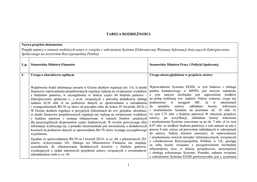 TABELA ROZBIEŻNOŚCI Nazwa projektu dokumentu: Projekt ustawy o zmianie niektórych ustaw w związku z wdrożeniem Systemu Elektronicznej Wymiany Informacji dotyczących Zabezpieczenia Społecznego na terytorium Rzeczypospolitej Polskiej L.p. Stanowisko Ministra Finansów Stanowisko Ministra Pracy i Polityki Społecznej I. Uwaga o charakterze ogólnym Uwaga nieuwzględniona w projekcie ustawy Wątpliwości budzi informacja zawarta w Ocenie skutków regulacji (str. 13), iż skutki finansowe wprowadzenia projektowanych regulacji wpłyną na zwiększenie wydatków z budżetów państwa, w szczególności w limicie części 44 budżetu państwa – Zabezpieczenie społeczne (…) m.in. związanych z potrzebą dodatkowej obsługi zadania (0,36 mln zł na podstawie danych ze sprawozdania o zatrudnieniu i wynagrodzeniach Rb-70 za okres od początku roku do końca IV kwartału 2012r.). W Ocenie skutków regulacji w przyjętych Założeniach do ww. projektu, określono, iż skutki finansowe projektowanych regulacji nie wpłyną na zwiększenie wydatków z budżetu państwa i zostaną sfinansowane w ramach limitów ustalonych dla poszczególnych dysponentów części budżetowych. W świetle powyższego obie informacje wykluczają się, a ponadto niezrozumiałe jest stwierdzenie o dodatkowych kosztach na podstawie danych ze sprawozdania Rb-70, które wymaga szczegółowego wyjaśnienia. Wprowadzenie Systemu EESSI, w tym budowa i obsługa punktu kontaktowego w MPiPS, jest nowym zadaniem, a tym samym niezbędne jest zapewnienie środków na pełną realizację ww. zadania. Należy wskazać, czego nie podniesiono w uwagach MF, że w założeniach do projektu ustawy zakładano koszty wdrożenia i uruchomienia Systemu na poziomie ok. 18 mln zł. (w tym 1,75 mln. z budżetu państwa) W obecnym projekcie ustawy, po weryfikacji, zakładane koszty wdrożenia i uruchomienia Systemu szacowane są na ok. 7 mln. zł (w tym 0,97 mln. ze środków budżetu państwa), a tym samym są one o prawie 9 mln. niższe od pierwotnie zakładanych w założeniach do ustawy. Należy również zauważyć, że wprowadzenie i uruchomienie nowych narzędzi informatycznych, związanych z członkostwem Rzeczypospolitej Polskiej w UE, pociąga za sobą koszty związane z przygotowaniem niezbędnej infrastruktury oraz, w dalszej perspektywie, utrzymaniem i obsługą wdrożonego Systemu. Ponadto, zadania związane z wdrożeniem Systemu EESSI porównywalne jest z systemem Zgodnie ze sprawozdaniem Rb-70 za I kwartał 2013r. w cz. 44, z planowanych 285 etatów, wykorzystano 241. Dlatego też Ministerstwo Finansów nie znajduje uzasadnienia do sfinansowania dodatkowych kosztów z budżetu państwa, wynikających z zadań nałożonych projektem ustawy związanych z ewentualnym zatrudnieniem osób w cz. 44. 1 Należy jasno i jednoznacznie podać, że proponowane rozwiązania wynikające z przepisów ww. ustawy będą finansowane w ramach wydatków cz. 44 Zabezpieczenie społeczne, planowanych na kolejne lata w ustawach budżetowych. Należy zaznaczyć, iż uwaga powyższa dotycząca zwiększonych kosztów dla cz. 44 budżetu państwa związanych z potrzebą dodatkowej obsługi zadania była zgłaszana przez Ministra Finansów w trakcie uzgodnień międzyresortowych w marcu br. SIS II, co oznacza konieczność zapewnienia ciągłości i trwałości wdrożonych narzędzi. Przyczyni się to również, na co nie zwrócono uwagi w uwagach MF, do szybszego i efektywniejszego wykrywania ewentualnych nadużyć w dostępie do świadczeń z zabezpieczenia społecznego poprzez szybszą i skuteczniejszą wymianę informacji pomiędzy instytucjami państw członkowskich. Jednocześnie, w ramach zmniejszonych limitów w cz. 44 – Zabezpieczenie społeczne na bieżące funkcjonowanie resortu, w tym na utrzymanie bieżących systemów informatycznych, nie ma możliwości sfinansowania nowego zadania, jakim jest budowa punktu kontaktowego oraz jego dalsza eksploatacja. Tym samym w projekcie ustawy zapisano wzrost wydatków ściśle związanych z realizacja nowego zadania związanego z Systemem EESSI prze ministra właściwego ds. zabezpieczenia społecznego. Odnoszą się do wskazanych w uzasadnieniu kosztów ze sprawozdania RB-70 oraz wykorzystania etatów w cz. 44 należy wskazać, że kwota 0,36 mln. obejmuje koszty związane ze sfinansowaniem zatrudnienia dodatkowych 4 osób do obsługi przedmiotowego zadania, w tym do obsługi informatycznej i obsługi modułu komunikacyjnego. Ponadto wskazany w piśmie MF stan zatrudnienia na koniec okresu sprawozdawczego w wysokości 241 etatów, nie jest stanem rzeczywistym, gdyż zgodnie z zapisami § 20 pkt 9 lit. b oraz pkt 10 instrukcji sporządzania sprawozdań budżetowych w zakresie budżetu państwa stanowiącej załącznik nr 37 do rozporządzenia Ministra Finansów z dnia 3 lutego 2010 r. w sprawie sprawozdawczości budżetowej (Dz. U. Nr 20, poz. 103) w sprawozdaniu Rb-70 kwartalnym o zatrudnieniu i wynagrodzeniach w kolumnie 10 – „Przeciętne wykonanie w okresie sprawozdawczym” oraz kolumnie 11 – „Stan na koniec okresu sprawozdawczego” do stanu zatrudnionych 2 nie wlicza się osób, które nie otrzymują za dany okres wynagrodzenia od zakładu pracy, tj. np. osób będących na urlopach bezpłatnych, wychowawczych i macierzyńskich oraz zasiłkach chorobowych. Stąd wynika konieczność zwiększenia środków na obsługę nowego zadania. II Uwagi szczegółowe Uwaga uwzględniona w projekcie ustawy po przedstawieniu wyjaśnień Narodowego Funduszu Zdrowia 1. Zgodnie z przedstawioną informacją koszty związane z wdrożeniem Systemu EESSI i uruchomieniem na terytorium RP punktów kontaktowych w zakresie NFZ w 2014r. wyniosą 4,772 mln zł. Jak podano w uzasadnieniu projektu koszty te w większości dotyczyć będą rozbudowania zasobów informatycznych, przy czym analogiczne koszty ponoszone przez ZUS wyniosą 3,65 mln zł. Zgodnie z wyjaśnieniami NFZ, zawarte w uzasadnieniu koszty opart