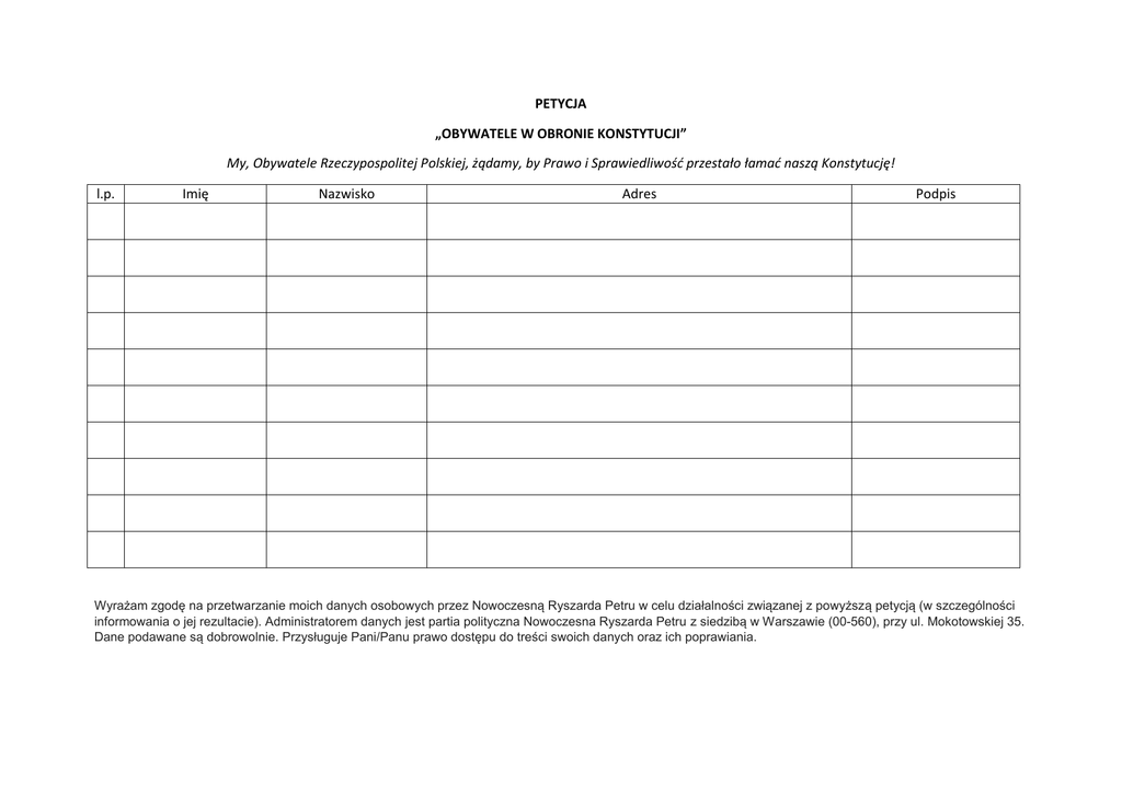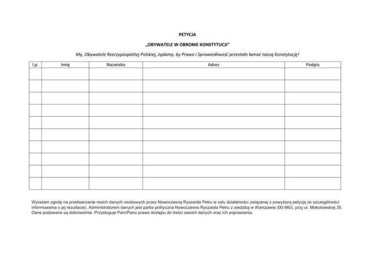 PETYCJA „OBYWATELE W OBRONIE KONSTYTUCJI” My, Obywatele Rzeczypospolitej Polskiej, żądamy, by Prawo i Sprawiedliwość przestało łamać naszą Konstytucję! l.p. Imię Nazwisko Adres Podpis Wyrażam zgodę na przetwarzanie moich danych osobowych przez Nowoczesną Ryszarda Petru w celu działalności związanej z powyższą petycją (w szczególności informowania o jej rezultacie). Administratorem danych jest partia polityczna Nowoczesna Ryszarda Petru z siedzibą w Warszawie (00-560), przy ul. Mokotowskiej 35. Dane podawane są dobrowolnie. Przysługuje Pani/Panu prawo dostępu do treści swoich danych oraz ich poprawiania.