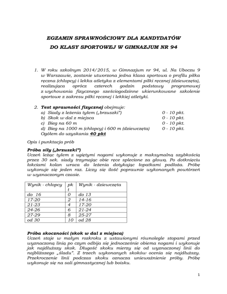EGZAMIN SPRAWNOŚCIOWY DLA KANDYDATÓW DO KLASY SPORTOWEJ W GIMNAZJUM NR 94 1. W roku szkolnym 2014/2015, w Gimnazjum nr 94, ul. Na Uboczu 9 w Warszawie, zostanie utworzona jedna klasa sportowa o profilu piłka ręczna (chłopcy) i lekka atletyka z elementami piłki ręcznej (dziewczęta), realizująca oprócz czterech godzin podstawy programowej z wychowania fizycznego sześciogodzinne ukierunkowane szkolenie sportowe z zakresu piłki ręcznej i lekkiej atletyki. 2. Test sprawności fizycznej obejmuje: a) Siady z leżenia tyłem („brzuszki”) b) Skok w dal z miejsca c) Bieg na 60 m d) Bieg na 1000 m (chłopcy) i 600 m (dziewczęta) Ogółem do uzyskania 40 pkt 0000- 10 10 10 10 pkt. pkt. pkt. pkt. Opis i punktacja prób Próba siły („brzuszki”) Uczeń leżąc tyłem z ugiętymi nogami wykonuje z maksymalną szybkością przez 30 sek. siady trzymając obie ręce splecione za głową. Po dotknięciu łokciami kolan wraca do leżenia dotykając łopatkami podłoża. Próbę wykonuje się jeden raz. Liczy się ilość poprawnie wykonanych powtórzeń w wyznaczonym czasie. Wynik - chłopcy do 16 17-20 21-23 24-26 27-29 od 30 pk t 0 2 4 6 8 10 Wynik - dziewczęta do 13 14-16 17-20 21-24 25-27 od 28 Próba skoczności (skok w dal z miejsca) Uczeń staje w małym rozkroku z ustawionymi równolegle stopami przed wyznaczoną linią po czym odbija się jednocześnie obiema nogami i wykonuje jak najdłuższy skok. Długość skoku mierzy się od wyznaczonej linii do najbliższego „śladu”. Z trzech wykonanych skoków ocenia się najdłuższy. Przekroczenie linii podczas skoku oznacza unieważnienie próby. Próbę wykonuje się na sali gimnastycznej lub boisku. 1 Wynik (cm) chłopcy do 128 129-147 148-173 174-192 193-211 od 212 - pk t 0 2 4 6 8 10 Wynik (cm) dziewczęta do 110 111-130 131-166 167-183 184-201 od 202 - Próba szybkości (bieg na 60 m) Bieg odbywa się w obuwiu sportowym (bez kolców) na bieżni LA, pojedynczo lub w parach. Start z pozycji niskiej. Z dwóch biegów mierzonych z dokładnością do 0,1 sek. liczy się lepszy czas. Wynik (sek.) chłopcy do 12,0 11,9-11,3 11,2-10,5 10,4-9,7 9,6-9,1 do 9,0 - pk t 0 2 4 6 8 10 Wynik (sek.) dziewczęta do 12,2 12,1-11,5 11,4-10,9 10,8-10,3 10,2-9,5 do 9,4 - Próba wytrzymałości (bieg na 1000 m. chłopcy/600 m. dziewczęta) 1000 m Bieg odbywa się w obuwiu sportowym (bez kolców), w grupach. Start z pozycji wysokiej. Jedna próba biegowa mierzona z dokładnością do 1 sek. Wynik - chłopcy do 5,10 5,09-4,45 4,44-4,25 4,24-4,00 3,59-3,30 od 3,29 pk t 0 2 4 6 8 10 Wynik - dziewczęta do 3,50 3,49-3,20 3,19-3,00 2,59-2,30 2,29-2,11 od 2,10 3. Test umiejętności kierunkowych obejmuje: a) Kozłowanie piłki slalomem zakończone rzutem do bramki w wyskoku (technika wykonania poszczególnych elementów obejmująca: prawidłowe kozłowanie, umiejętność zmiany kierunku kozłowania i ręki kozłującej, poprawne wykonanie rzutu w wyskoku tj. sposób odbicia, prowadzenie ręki, kontrola kierunku piłki.) 2 Opis i punktacja próby Indywidualne umiejętności techniczne Uczeń poruszając się krokiem odstawno-dostawnym kozłuje piłkę kolejno prawą i lewą ręką, następnie przechodzi do kozłowania slalomem w biegu zmieniając rękę kozłującą na dalszą od mijanej tyczki, następnie kozłuje piłkę dowolną ręką w kierunku bramki. (0-30 pkt.) Uczeń po kozłowaniu wykonuje rzut w wyskoku po trzech krokach z piłką odbijając się z nogi przeciwstawnej do ręki rzutnej nie przekraczając linii pola bramkowego. Rzut jest wykonany dynamicznie i celnie. W bramce ustawiona jest skrzynia gimnastyczna ograniczająca światło bramki. (0-30 pkt.) Ogółem do uzyskania 60 pkt Liczba punktów możliwych do zdobycia – 100 Liczba punktów kwalifikująca kandydata – 70 3