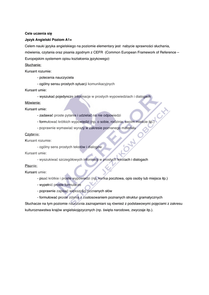 Cele uczenia się Język Angielski Poziom A1+ Celem nauki języka angielskiego na poziomie elementary jest nabycie sprawności słuchania, mówienia, czytania oraz pisania zgodnym z CEFR (Common European Framework of Reference – Europejskim systemem opisu kształcenia językowego) Słuchanie: Kursant rozumie: - polecenia nauczyciela - ogólny sensu prostych sytuacji komunikacyjnych Kursant umie: - wyszukać pojedyncze informacje w prostych wypowiedziach i dialogach Mówienie: Kursant umie: - zadawać proste pytania i udzielać na nie odpowiedzi - formułować krótkich wypowiedzi (np. o sobie, rodzinie, swoim mieście itp.) - poprawnie wymawiać wyrazy w zakresie poznanego materiału Czytanie: Kursant rozumie: - ogólny sens prostych tekstów i dialogów Kursant umie: - wyszukiwać szczegółowych informacji w prostych tekstach i dialogach Pisanie: Kursant umie: - pisać krótkie i proste wypowiedzi (np. kartka pocztowa, opis osoby lub miejsca itp.) - wypełnić proste formularze - poprawnie zapisać większości poznanych słów - formułować proste zdania z zastosowaniem poznanych struktur gramatycznych Słuchacze na tym poziomie nauczania zaznajamiani są również z podstawowymi pojęciami z zakresu kulturoznawstwa krajów angielskojęzycznych (np. święta narodowe, zwyczaje itp.). 1. ZAKRES TEMATYCZNY Zakres tematyczny programu obejmuje 13 bloków tematycznych, będących odzwierciedleniem różnych sfer życia: 1. Dane personalne 2. Czynności codzienne 3. Praca 4. Rodzina 5. Dom 6. Żywienie 7. Podróżowanie 8. Wygląd zewnętrzny 9. Transport 10. Plany na przyszłość 11. Pogoda 12. Zdrowie 13. Życie rodzinne i towarzyskie 14. Uczucia Kolejność realizacji powyższych bloków tematycznych jest dowolna. 2. TREŚCI NAUCZANIA 2.1. GRAMATYKA • Czasy ( zdania twierdzące, pytające i przeczące) o Present simple o Present continuous o Past simple ( czasownik „be”;czasowniki regularne i nieregularne) o Be going to / would like o Present perfect • Tryb rozkazujący • Konstrukcje bezokolicznikowe i gerundialne • Czasownik: o ‘Be” (zdania twierdzące, przeczące i pytające) o „have got” o There is /there are o Czasownik modalny „can/can’t , have to / don’t have to, will / won’t , might , should / shouldn’t • • • • Rzeczownik: o Liczba mnoga rzeczowników (formy regularne i nieregularne) o Possessive ‘s o Policzalne i niepoliczalne Przymiotnik o Miejsce w zdaniu o Stopniowanie Zaimki: o Zaimki osobowe i przymiotniki dzierżawcze o Zaimki wskazujące o Zaimki w funkcji dopełnienia o Nieokreślone: some, any Przedimki o a/an / the o miejsca i czasu • Przysłówki częstotliwości • Liczebniki porządkowe • Pytania szczegółowe z użyciem słów: where/when/who/why/how much/how 2.2. SŁOWNICTWO • Kolory • Alfabet • Literowanie • Dni tygodnia • Kraje i narodowości • Cyfry 1-100 • Numery telefonów • Zawody • Przymiotniki określające wiek, wygląd, rozmiar przedmiotu/miejsca, nastrój • Rodzina • Godziny • Dom i wyposażenie • Rozkład dnia • Zajęcia w czasie wolnym • Miesiące i daty • Przysłówki częstotliwości • Upodobania – czasowniki z końcówką ing • Jedzenie i napoje • Sklepy i towary • Ważne wydarzenia w życiu • Film • Muzyka • Kolokacje odczasownikowe • Praca • Środki transportu • Sporty • Zdrowie • Opisywanie ludzi – wygląd i charakter • Zdrowie 3. FUNKCJE JĘZYKOWE 3.1 MÓWIENIE Uczniowie potrafią: • Podejmować różne role w procesie komunikacji używając odpowiedniego języka • Formułować kilkuzdaniową wypowiedź na temat życia codziennego • Stosować środki językowo do wyrażenia intencji, uczuć i emocji związanych z życiem codziennym • Stosować struktury leksykalno – gramatyczne oraz właściwą wymowę tak aby wypowiedź była zrozumiała • Stosować umiejętności: • uzyskiwania i udzielania wskazówek i informacji • wyrażania: prośby, polecenia, podziękowanie itp. • opisywanie : osób ,przedmiotów ,miejsc, zjawisk i czynności • relacjonowanie wydarzeń • prowadzenie negocjacji w życiu codziennym • przedstawianie i uzgadnianie swoich oraz innych opinii. 3.2 SŁUCHANIE Uczniowie potrafią: • Wybrać i zrozumieć określone informacje z tekstu, który nie jest dla nich w pełni zrozumiały • Zrozumieć autentyczny materiał np.: wywiad, reklamę , ogłoszenie, dialog itp. w stopniu który pozwoli im: o na określenie głównej myśli tekstu o wychwycenie określonych informacji o stwierdzenie iż tekst zwiera określone informacje o wyselekcjonowanie określonej informacji o określenie intencji autora, funkcji lub / i rodzaju tekstu 3.3 CZYTANIE Uczniowie potrafią: • • Czytać w celu określenia: o głównej myśli tekstu o wychwycenia określonych informacji Czytać różnego rodzaju teksty np.: ogłoszenia, menu, listy oraz Proste teksty narracyjne 3.4 PISANIE Uczniowie potrafią: • Wypełniać formularze • Napisać krótki tekst użytkowy stosując odpowiednie środki stylistyczno – gramatyczne takie jak np.: • o Krótki artykuł o Opis wydarzenia o Krótkie opowiadanie o ogłoszenie o notatka o list nieformalny o mail o pocztówka o zaproszenie Poprawnie stosować interpunkcje i zasady pisowni