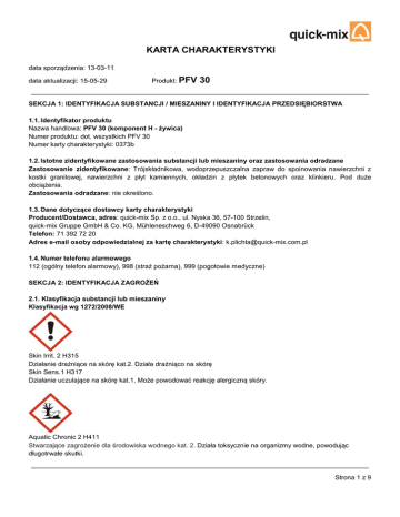 KARTA CHARAKTERYSTYKI data sporządzenia: 13-03-11 data aktualizacji: 15-05-29 Produkt: PFV 30 SEKCJA 1: IDENTYFIKACJA SUBSTANCJI / MIESZANINY I IDENTYFIKACJA PRZEDSIĘBIORSTWA 1.1. Identyfikator produktu Nazwa handlowa: PFV 30 (komponent H - żywica) Numer produktu: dot. wszystkich PFV 30 Numer karty charakterystyki: 0373b 1.2. Istotne zidentyfikowane zastosowania substancji lub mieszaniny oraz zastosowania odradzane Zastosowanie zidentyfikowane: Trójskładnikowa, wodoprzepuszczalna zapraw do spoinowania nawierzchni z kostki granitowej, nawierzchni z płyt kamiennych, okładzin z płytek betonowych oraz klinkieru. Pod duże obciążenia. Zastosowania odradzane: nie określono. 1.3. Dane dotyczące dostawcy karty charakterystyki Producent/Dostawca, adres: quick-mix Sp. z o.o., ul. Nyska 36, 57-100 Strzelin, quick-mix Gruppe GmbH & Co. KG, Mühleneschweg 6, D-49090 Osnabrück Telefon: 71 392 72 20 Adres e-mail osoby odpowiedzialnej za kartę charakterystyki: [email protected] 1.4. Numer telefonu alarmowego 112 (ogólny telefon alarmowy), 998 (straż pożarna), 999 (pogotowie medyczne) SEKCJA 2: IDENTYFIKACJA ZAGROŻEŃ 2.1. Klasyfikacja substancji lub mieszaniny Klasyfikacja wg 1272/2008/WE Skin Irrit. 2 H315 Działanie drażniące na skórę kat.2. Działa drażniąco na skórę Skin Sens.1 H317 Działanie uczulające na skórę kat.1. Może powodować reakcję alergiczną skóry. Aquatic Chronic 2 H411 Stwarzające zagrożenie dla środowiska wodnego kat. 2. Działa toksycznie na organizmy wodne, powodując długotrwałe skutki. Strona 1 z 9 KARTA CHARAKTERYSTYKI data sporządzenia: 13-03-11 Produkt: PFV data aktualizacji: 15-05-29 30 2.2. Elementy oznakowania Piktogramy określające rodzaj zagrożenia i hasło ostrzegawcze Uwaga Nazwy niebezpiecznych składników umieszczonych na etykiecie Zawiera: LIEPOX Pflasterfugenmörtel PFM BM 520 Komponent A Określenia rodzaju zagrożenia H315 - działa drażniąco na skórę H317 - może powodować reakcję alergiczną skóry H411 - działa toksycznie na organizmy wodne, powodując długotrwałe skutki Określenia dotyczące prawidłowego postępowania z mieszaniną P101 - w razie konieczności zasięgnięcia porady lekarza należy pokazać pojemnik lub etykietę P102 - chronić przed dziećmi P103 - przed użyciem przeczytać etykietę P261 - unikać wdychania pyłu/dymu/gazu/mgły/par/rozpylonej cieczy P280 - stosować rękawice ochronne/odzież ochronną/ochronę oczu/ochronę twarzy P302+P352 - w przypadku kontaktu ze skórą: umyć dużą ilością wody z mydłem P332+P313 - w przypadku wystąpienia podrażnienia skóry: zasięgnąć porady/ zgłosić się pod opiekę lekarza P362 - zanieczyszczoną odzież zdjąć i wyprać przed ponownym użyciem P501 - zawartość/pojemnik usuwać zgodnie z lokalnymi/regionalnymi/narodowymi/międzynarodowymi przepisami 2.3. Inne zagrożenia Zawarte w produkcie substancje nie spełniają kryteriów PBT lub vPvB zgodnie z załącznikiem XIII Rozporządzenia REACH. SEKCJA 3: SKŁAD / INFORMACJA O SKŁADNIKACH 3.1. Substancje Nie dotyczy. 3.2. Mieszaniny Produkt reakcji bisfenolu A z epichlorohydryną, (śr. masa cząsteczkowa ≤700) Klasyfikacja wg 1272/2008/WE Zakres stężeń Eye Irrit.2 H319 Skin Irrit.2 H315 Skin Sens.1 317 Aquatic Chronic 2, H411 50 – 90% Strona 2 z 9 KARTA CHARAKTERYSTYKI data sporządzenia: 13-03-11 data aktualizacji: 15-05-29 Produkt reakcji bisfenolu F, żywica epoksydowa Produkt: PFV 30 Nr CAS 55492-52-9 Eye Irrit.2 H319 Skin Irrit.2 H315 Skin Sens.1 317 Aquatic Chronic 2, H411 Eter glicydylowy alkoholi C12-14 1,1,1trihydroksymetylpropyltriakrylat Skin Irrit.2 H315 Skin Sens.1 317 Nr WE EINECS 239-701-3 Nr CAS 15625-89-5 Eye Irrit.2 H319 Skin Irrit.2 H315 Skin Sens.1 317 30 – 50% 5 – 10% <5% Substancja z określoną na poziomie wspólnotowym i krajowym wartością najwyższego dopuszczalnego stężenia w środowisku pracy. Pełen tekst zwrotów H przytoczony został w sekcji 16 karty. SEKCJA 4: ŚRODKI PIERWSZEJ POMOCY 4.1. Opis środków pierwszej pomocy W kontakcie ze skórą: zdjąć natychmiast części garderoby zabrudzone produktem. Skórę natychmiast spłukać wodą i mydłem. W wypadku przedłużającego się podrażnienia skóry skonsultować się z lekarzem. W kontakcie z oczami: Przez kilka minut płukać oczy z odchyloną powieką pod bieżącą wodą. Skonsultować się z lekarzem. W przypadku spożycia: Nie wywoływać wymiotów. Wypłukać usta wodą. Natychmiast skontaktować się z lekarzem – pokazać opakowanie lub etykietę. Po narażeniu drogą oddechową: Zapewnić dostęp świeżego powietrza. Skontaktować się z lekarzem. 4.2. Najważniejsze ostre i opóźnione objawy oraz skutki narażenia W kontakcie ze skórą: zaczerwienienie, pieczenie, podrażnienie skóry oraz błon śluzowych. Powtarzający się kontakt może spowodować wysuszenie i pękanie skóry. W kontakcie z oczami: zaczerwienienie, łzawienie, obrzęk, ból. Po połknięciu: nudności, wymioty. Po narażeniu drogą oddechową: kaszel, niewielkie podrażnienie błon śluzowych i dróg oddechowych, uczucie senności i zawroty głowy. 4.3. Wskazania dotyczące wszelkiej natychmiastowej pomocy lekarskiej i szczególnego postępowania z poszkodowanym Decyzję o sposobie postępowania ratunkowego podejmuje lekarz po dokładnej ocenie stanu poszkodowanego. SEKCJA 5: POSTĘPOWANIE W PRZYPADKU POŻARU 5.1. Środki gaśnicze Odpowiednie środki gaśnicze: CO2, proszek gaśniczy, woda Strona 3 z 9 KARTA CHARAKTERYSTYKI data sporządzenia: 13-03-11 data aktualizacji: 15-05-29 Produkt: PFV 30 Niewłaściwe środki gaśnicze: pełny strumień wody 5.2. Szczególne zagrożenia związane z substancją lub mieszaniną Podczas spalania mogą powstać trujące gazy. 5.3. Informacje dla straży pożarnej Strażak powinien być zaopatrzony w aparat chroniący drogi oddechowe. SEKCJA 6: POSTĘPOWANIE W PRZYPADKU NIEZAMIERZONEGO UWOLNIENIA DO ŚRODOWISKA 6.1. Indywidualne środki ostrożności, wyposa