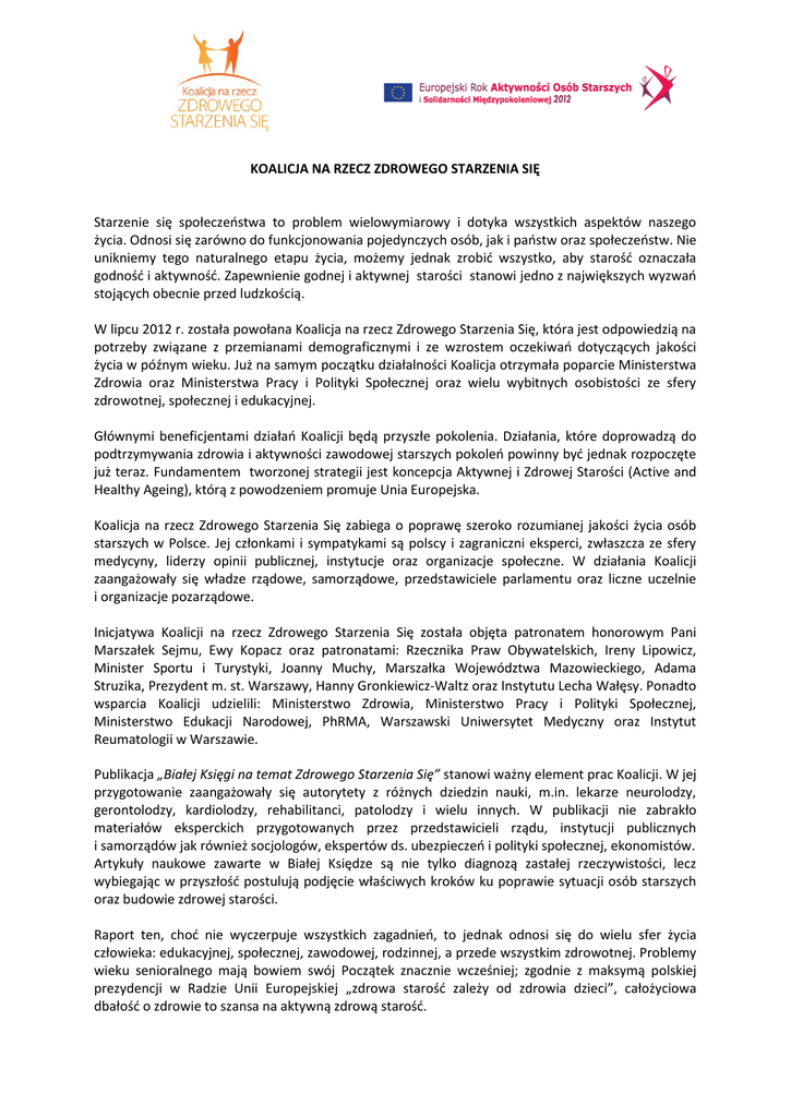 KOALICJA NA RZECZ ZDROWEGO STARZENIA SIĘ Starzenie się społeczeństwa to problem wielowymiarowy i dotyka wszystkich aspektów naszego życia. Odnosi się zarówno do funkcjonowania pojedynczych osób, jak i państw oraz społeczeństw. Nie unikniemy tego naturalnego etapu życia, możemy jednak zrobić wszystko, aby starość oznaczała godność i aktywność. Zapewnienie godnej i aktywnej starości stanowi jedno z największych wyzwań stojących obecnie przed ludzkością. W lipcu 2012 r. została powołana Koalicja na rzecz Zdrowego Starzenia Się, która jest odpowiedzią na potrzeby związane z przemianami demograficznymi i ze wzrostem oczekiwań dotyczących jakości życia w późnym wieku. Już na samym początku działalności Koalicja otrzymała poparcie Ministerstwa Zdrowia oraz Ministerstwa Pracy i Polityki Społecznej oraz wielu wybitnych osobistości ze sfery zdrowotnej, społecznej i edukacyjnej. Głównymi beneficjentami działań Koalicji będą przyszłe pokolenia. Działania, które doprowadzą do podtrzymywania zdrowia i aktywności zawodowej starszych pokoleń powinny być jednak rozpoczęte już teraz. Fundamentem tworzonej strategii jest koncepcja Aktywnej i Zdrowej Starości (Active and Healthy Ageing), którą z powodzeniem promuje Unia Europejska. Koalicja na rzecz Zdrowego Starzenia Się zabiega o poprawę szeroko rozumianej jakości życia osób starszych w Polsce. Jej członkami i sympatykami są polscy i zagraniczni eksperci, zwłaszcza ze sfery medycyny, liderzy opinii publicznej, instytucje oraz organizacje społeczne. W działania Koalicji zaangażowały się władze rządowe, samorządowe, przedstawiciele parlamentu oraz liczne uczelnie i organizacje pozarządowe. Inicjatywa Koalicji na rzecz Zdrowego Starzenia Się została objęta patronatem honorowym Pani Marszałek Sejmu, Ewy Kopacz oraz patronatami: Rzecznika Praw Obywatelskich, Ireny Lipowicz, Minister Sportu i Turystyki, Joanny Muchy, Marszałka Województwa Mazowieckiego, Adama Struzika, Prezydent m. st. Warszawy, Hanny Gronkiewicz-Waltz oraz Instytutu Lecha Wałęsy. Ponadto wsparcia Koalicji udzielili: Ministerstwo Zdrowia, Ministerstwo Pracy i Polityki Społecznej, Ministerstwo Edukacji Narodowej, PhRMA, Warszawski Uniwersytet Medyczny oraz Instytut Reumatologii w Warszawie. Publikacja „Białej Księgi na temat Zdrowego Starzenia Się” stanowi ważny element prac Koalicji. W jej przygotowanie zaangażowały się autorytety z różnych dziedzin nauki, m.in. lekarze neurolodzy, gerontolodzy, kardiolodzy, rehabilitanci, patolodzy i wielu innych. W publikacji nie zabrakło materiałów eksperckich przygotowanych przez przedstawicieli rządu, instytucji publicznych i samorządów jak również socjologów, ekspertów ds. ubezpieczeń i polityki społecznej, ekonomistów. Artykuły naukowe zawarte w Białej Księdze są nie tylko diagnozą zastałej rzeczywistości, lecz wybiegając w przyszłość postulują podjęcie właściwych kroków ku poprawie sytuacji osób starszych oraz budowie zdrowej starości. Raport ten, choć nie wyczerpuje wszystkich zagadnień, to jednak odnosi się do wielu sfer życia człowieka: edukacyjnej, społecznej, zawodowej, rodzinnej, a przede wszystkim zdrowotnej. Problemy wieku senioralnego mają bowiem swój Początek znacznie wcześniej; zgodnie z maksymą polskiej prezydencji w Radzie Unii Europejskiej „zdrowa starość zależy od zdrowia dzieci”, całożyciowa dbałość o zdrowie to szansa na aktywną zdrową starość. „Społeczeństwo winno otwarcie mówić o problemie wieku podeszłego, o zrozumieniu dla upośledzenia płynącego z dysfunkcji różnych narządów starego organizmu, z ubóstwa tej grupy społecznej, samotności, strachu przed jutrem i niepokoju lub rezygnacji spowodowanych zbliżaniem się ostatnich chwil życia. Głośno afirmujmy człowieka przez całe jego życie, również w okresie zniedołężnienia. Budujmy pozytywny obraz wieku podeszłego. Starość spotka nas wszystkich, myślmy więc o seniorach tak, jak w przyszłości będziemy chcieli, aby o nas myślano” – mówi Prof. Bolesław Samoliński, Krajowy Konsultant w dziedzinie Zdrowia Publicznego oraz Przewodniczący Koalicji na Rzecz Zdrowego Starzenia Się. ZDROWE STARZENIE SIĘ: BIAŁA KSIĘGA WNIOSKI I REKOMENDACJE 1. W polityce państwa problem aktywnej, zdrowej starości winien stanowić priorytet na najbliższe dziesięciolecia, obejmujący edukację prozdrowotną i budowanie systemowych rozwiązań sprzyjających kształtowaniu postaw prozdrowotnych od najmłodszych lat. 2. Program ten powinien dotyczyć dbałości o sprawność fizyczną, sferę żywieniową i obyczajową oraz podejmowania walki z nałogami. 3. W okresie wieku średniego polityka ta winna być kontynuowana, rozszerzona jednak na zakłady pracy z włączeniem pracodawców do polityki prewencji i profilaktyki. Należy rozważyć zbudowanie instrumentów promujących takie zachowania w zakładach pracy. 4. Dla osób w wieku starszym, poza kontynuowaniem powyższej polityki, konieczne jest: a) tworzenie innowacyjnych rozwiązań w sferze farmakoterapii i technicznego wsparcia oraz programów prozdrowotnych i aktywizujących takie osoby; b) podejmowanie działań niwelujących skutki ubóstwa, poprawa zabezpieczenia socjalnego, chroniącego przed skutkami niepełnosprawności i inwalidztwa, a także budowanie właściwych relacji społecznych i więzi pokoleniowych oraz walka z wykluczeniem społecznym; c) przygotowanie systemu opieki zdrowotnej do rozwiązań niezbędnych dla wzrastającej w tej grupie wiekowej wielochorobowości i inwalidztwa, ze szczególnym zwróceniem uwagi na rozwój geriatrii i wprowadzenie jej do praktyki lekarzy podstawowej opieki zdrowotnej; d) wczesne wykrywanie i prewencja chorób przewlekłych dzięki badaniom skriningowym i programom profilaktycznym. 5. Należy uwzględnić wielosektorowy charakter polityki prozdrowotnej, włączyć do niej wszystkie resorty, a szcze