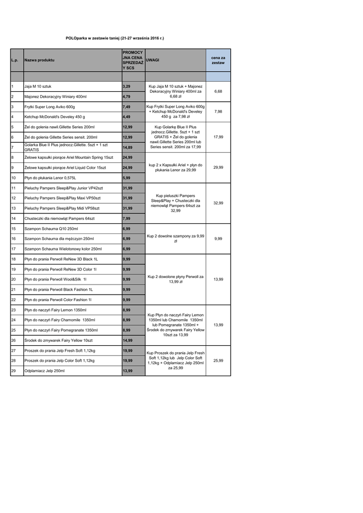 POLOparka w zestawie taniej (21-27 września 2016 r.) L.p. Nazwa produktu PROMOCY JNA CENA UWAGI SPRZEDAŻ Y SCS 1 Jaja M 10 sztuk 3,29 2 Majonez Dekoracyjny Winiary 400ml 4,79 3 Frytki Super Long Aviko 600g 7,49 4 Ketchup McDonald's Develey 450 g 4,49 5 Żel do golenia nawil.Gillette Series 200ml 12,99 6 Żel do golenia Gillette Series sensit. 200ml 12,99 7 Golarka Blue II Plus jednocz.Gillette. 5szt + 1 szt GRATIS 14,89 8 Żelowe kapsułki piorące Ariel Mountain Spring 15szt 24,99 9 Żelowe kapsułki piorące Ariel Liquid Color 15szt 24,99 10 Płyn do płukania Lenor 0,575L 5,99 11 Pieluchy Pampers Sleep&Play Junior VP42szt 31,99 12 Pieluchy Pampers Sleep&Play Maxi VP50szt 31,99 13 Pieluchy Pampers Sleep&Play Midi VP58szt 31,99 14 Chusteczki dla niemowląt Pampers 64szt 7,99 15 Szampon Schauma Q10 250ml 6,99 16 Szampon Schauma dla mężczyzn 250ml 6,99 17 Szampon Schauma Wielotonowy kolor 250ml 6,99 18 Płyn do prania Perwoll ReNew 3D Black 1L 9,99 19 Płyn do prania Perwoll ReNew 3D Color 1l 9,99 20 Płyn do prania Perwoll Wool&Silk 1l 9,99 21 Płyn do prania Perwoll Black Fashion 1L 9,99 22 Płyn do prania Perwoll Color Fashion 1l 9,99 23 Płyn do naczyń Fairy Lemon 1350ml 8,99 24 Płyn do naczyń Fairy Chamomile 1350ml 8,99 25 Płyn do naczyń Fairy Pomegranate 1350ml 8,99 26 Środek do zmywarek Fairy Yellow 10szt 14,99 27 Proszek do prania Jelp Fresh Soft 1,12kg 19,99 28 Proszek do prania Jelp Color Soft 1,12kg 19,99 29 Odplamiacz Jelp 250ml 13,99 cena za zestaw Kup Jaja M 10 sztuk + Majonez Dekoracyjny Winiary 400ml za 6,68 zł 6,68 Kup Frytki Super Long Aviko 600g + Ketchup McDonald's Develey 450 g za 7,98 zł 7,98 Kup Golarkę Blue II Plus jednocz.Gillette. 5szt + 1 szt GRATIS + Żel do golenia nawil.Gillette Series 200ml lub Series sensit. 200ml za 17,99 17,99 kup 2 x Kapsułki Ariel + płyn do płukania Lenor za 29,99 29,99 Kup pieluszki Pampers Sleep&Play + Chusteczki dla niemowląt Pampers 64szt za 32,99 32,99 Kup 2 dowolne szampony za 9,99 zł 9,99 Kup 2 dowolone płyny Perwoll za 13,99 zł 13,99 Kup Płyn do naczyń Fairy Lemon 1350ml lub Chamomile 1350ml lub Pomegranate 1350ml + Środek do zmywarek Fairy Yellow 10szt za 13,99 13,99 Kup Proszek do prania Jelp Fresh Soft 1,12kg lub Jelp Color Soft 1,12kg + Odplamiacz Jelp 250ml za 25,99 25,99