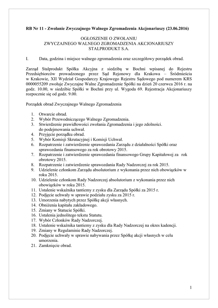 RB Nr 11 - Zwołanie Zwyczajnego Walnego Zgromadzenia Akcjonariuszy (23.06.2016) OGŁOSZENIE O ZWOŁANIU ZWYCZAJNEGO WALNEGO ZGROMADZENIA AKCJONARIUSZY STALPRODUKT S.A. Data, godzina i miejsce walnego zgromadzenia oraz szczegółowy porządek obrad. I. Zarząd Stalprodukt Spółka Akcyjna z siedzibą w Bochni wpisanej do Rejestru Przedsiębiorców prowadzonego przez Sąd Rejonowy dla Krakowa – Śródmieścia w Krakowie, XII Wydział Gospodarczy Krajowego Rejestru Sądowego pod numerem KRS 0000055209 zwołuje Zwyczajne Walne Zgromadzenie Spółki na dzień 20 czerwca 2016 r. na godz. 10.00, w siedzibie Spółki w Bochni przy ul. Wygoda 69. Rejestracja Akcjonariuszy rozpocznie się od godz. 9.00. Porządek obrad Zwyczajnego Walnego Zgromadzenia 1. 2. 3. 4. 5. 6. 7. 8. 9. 10. 11. 12. 13. 14. 15. 16. 17. 18. 19. 20. 21. Otwarcie obrad. Wybór Przewodniczącego Walnego Zgromadzenia. Stwierdzenie prawidłowości zwołania Zgromadzenia i jego zdolności. do podejmowania uchwał. Przyjęcie porządku obrad. Wybór Komisji Skrutacyjnej i Komisji Uchwał. Rozpatrzenie i zatwierdzenie sprawozdania Zarządu z działalności Spółki oraz sprawozdania finansowego za rok obrotowy 2015. Rozpatrzenie i zatwierdzenie sprawozdania finansowego Grupy Kapitałowej za rok obrotowy 2015. Rozpatrzenie i zatwierdzenie sprawozdania Rady Nadzorczej za rok 2015. Udzielenie członkom Zarządu absolutorium z wykonania przez nich obowiązków w roku 2015. Udzielenie członkom Rady Nadzorczej absolutorium z wykonania przez nich obowiązków w roku 2015. Ustalenie wskaźnika tantiemy z zysku dla Zarządu Spółki za 2015 r. Podjęcie uchwały w sprawie podziału zysku za 2015 r. Umorzenia nabytych przez Spółkę akcji własnych. Obniżenia kapitału zakładowego. Zmiany w Statucie Spółki. Ustalenia jednolitego tekstu Statutu. Wybór Członków Rady Nadzorczej. Ustalenie wskaźnika tantiemy z zysku dla Rady Nadzorczej na okres kadencji. Zmiany w Regulaminie Rady Nadzorczej. Podjęcie uchwały w sprawie nabywania przez Spółkę akcji własnych w celu umorzenia. Zamknięcie obrad. 1 II. Precyzyjny opis procedur dotyczących uczestniczenia w walnym zgromadzeniu i wykonywania prawa głosu: a) prawo Akcjonariusza do żądania umieszczenia określonych spraw w porządku obrad walnego zgromadzenia. Akcjonariuszowi lub Akcjonariuszom reprezentującym co najmniej 1/20 kapitału zakładowego przysługuje prawo żądania umieszczenia określonych spraw w porządku obrad Walnego Zgromadzenia. Żądanie powinno zostać zgłoszone Zarządowi Spółki nie później niż na 21 dni przed terminem Walnego Zgromadzenia, tj. do dnia 29 maja 2016 roku. Żądanie powinno zawierać uzasadnienie lub projekt uchwały dotyczącej proponowanego punktu porządku obrad. Żądanie może zostać złożone na piśmie w siedzibie Spółki pod adresem ul. Wygoda 69, 32-700 Bochnia z dopiskiem „Walne Zgromadzenie” lub w postaci elektronicznej i przesłane na następujący adres poczty elektronicznej Spółki: [email protected]. Akcjonariusz powinien wykazać posiadanie odpowiedniej liczby akcji na dzień złożenia żądania załączając do żądania świadectwo depozytowe, a w przypadku akcjonariuszy będących osobami prawnymi i spółkami osobowymi potwierdzić również uprawnienie do działania w imieniu tego podmiotu załączając aktualny odpis z KRS. b) prawo Akcjonariusza do zgłaszania projektów uchwał dotyczących spraw wprowadzonych do porządku obrad walnego zgromadzenia lub spraw, które mają zostać wprowadzone do porządku obrad przed terminem walnego zgromadzenia. Akcjonariusz bądź akcjonariusze reprezentujący co najmniej 1/20 kapitału zakładowego mogą przed terminem Walnego Zgromadzenia zgłaszać na piśmie w siedzibie Spółki pod adresem ul. Wygoda 69, 32-700 Bochnia z dopiskiem „Walne Zgromadzenie” lub przy wykorzystaniu środków komunikacji elektronicznej (na adres poczty elektronicznej [email protected]) projekty uchwał dotyczące spraw wprowadzonych do porządku obrad Walnego Zgromadzenia lub spraw, które mają zostać wprowadzone do porządku obrad. Podobnie jak w pkt. 2a akcjonariusz lub akcjonariusze powinni udokumentować swe uprawnienie do wykonywania tego prawa, przedstawiając odpowiednie dokumenty w formie pisemnej. c) prawo Akcjonariusza do zgłaszania projektów uchwał dotyczących spraw wprowadzonych do porządku obrad podczas walnego zgromadzenia. Każdy akcjonariusz może podczas obrad Walnego Zgromadzenia zgłaszać projekty uchwał dotyczące spraw wprowadzonych do porządku obrad. d) sposób wykonywania prawa głosu przez pełnomocnika, w tym w szczególności o formularzach stosowanych podczas głosowania przez pełnomocnika, oraz sposobie zawiadamiania spółki przy wykorzystaniu środków komunikacji elektronicznej o ustanowieniu pełnomocnika. Akcjonariusz może uczestniczyć w Walnym Zgromadzeniu oraz wykonywać prawo głosu osobiście lub przez pełnomocnika. Spółka w dniu dzisiejszym udostępnia na swojej stronie internetowej wzór formularza pozwalającego na wykonywanie prawa głosu przez pełnomocnika (www.stalprodukt.com.pl/relacje-inwestorskie/walne-zgromadzenia). Pełnomocnictwo do głosowania przez pełnomocnika powinno być udzielone na piśmie lub 2 w postaci elektronicznej. Udzielenie pełnomocnictwa w postaci elektronicznej nie wymaga opatrzenia bezpiecznym podpisem elektronicznym weryfikowanym przy pomocy ważnego kwalifikowanego certyfikatu. O udzieleniu pełnomocnictwa w postaci elektronicznej należy zawiadomić Spółkę przy wykorzystaniu środków komunikacji elektronicznej, w postaci wypełnionego formularza pełnomocnictwa, przesłanego pocztą elektroniczną na adres mailowy: [email protected]. W zawiadomieniu o udzieleniu pełnomocnictwa w postaci elektronicznej akcjonariusz Spółki podaje swój numer telefonu oraz adres e-mail, a także numer telefonu i adres e-mail pełnomocnika, za pośrednictwem których Spółka będzie mogła komunikować się z akcj