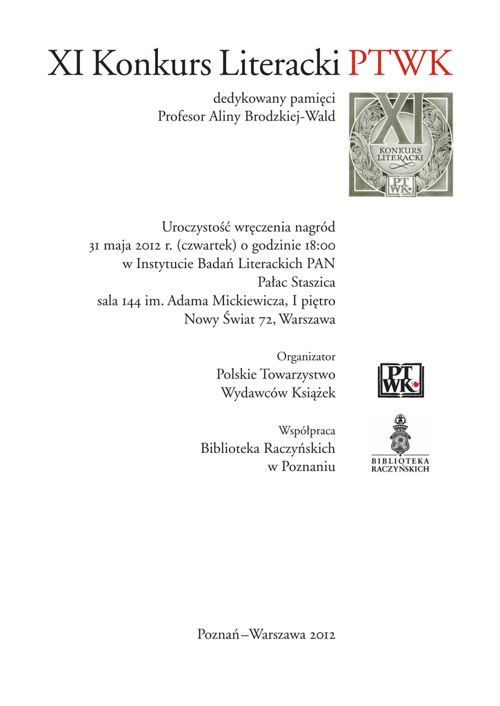 XI Konkurs Literacki PTWK dedykowany pamięci Profesor Aliny Brodzkiej-Wald Uroczystość wręczenia nagród 31 maja 2012 r. (czwartek) o godzinie 18:00 w Instytucie Badań Literackich PAN Pałac Staszica sala 144 im. Adama Mickiewicza, I piętro Nowy Świat 72, Warszawa Organizator Polskie Towarzystwo Wydawców Książek Współpraca Biblioteka Raczyńskich w Poznaniu Poznań –Warszawa 2012 W dniu 30 kwietnia 2012 roku na posiedzeniu Jury, odbywającym się w Warszawie w Klubie Księgarza, rozstrzygnięta została XI edycja promocyjnego Konkursu Literackiego Polskiego Towarzystwa Wydawców Książek w czterech kategoriach twórczości: poezja, proza, esej, literatura dla dzieci i młodzieży. W konkursie brały udział książki wydane w latach 2010–2011 autorów mających w swoim dorobku nie więcej niż trzy publikacje w danej kategorii. Zgłoszono 136 książek. W obradach uczestniczyli członkowie Jury w składzie: Grażyna Borkowska (przewodnicząca), Przemysław Czapliński, Grzegorz Leszczyński, Bronisław Maj, Andrzej Rostocki, Piotr Śliwiński oraz przedstawiciele organizatorów (z głosem doradczym): PTWK – Olcha Sikorska (komisarz Konkursu), Barbara Petrozolin-Skowrońska i Lidia Sadowska, Biblioteki Raczyńskich – Anna Kozłowska. Jury nominowało do nagród następujące książki: poezja proza esej literatura dla dzieci i młodzieży Patronat Honorowy W kategorii poezji Przemysław Dakowicz, Place zabaw ostatecznych (Towarzystwo Przyjaciół Sopotu, 2011) Łukasz Jarosz, Mimikra (Biuro Literackie, Wrocław 2010) Maciej Robert, Collegium Anatomicum (Wydawnictwo Wojewódzkiej Biblioteki Publicznej i Centrum Animacji Kultury, Poznań 2011) Konkurs dofinansował Fundusz Popierania Twórczości przy Stowarzyszeniu Autorów ZAiKS W kategorii prozy Justyna Bargielska, Obsoletki (Wydawnictwo Czarne, Wołowiec 2010) Julia Fiedorczuk, Poranek Marii i inne opowiadania (Biuro Literackie, Wrocław 2010) Mikołaj Łoziński, Książka (Wydawnictwo Literackie, Kraków 2011) W kategorii eseju Joanna Krakowska, Mikołajska. Teatr i PRL (Wydawnictwo W.A.B., Warszawa 2011) Wojciech Nowicki, Dno oka. Eseje o fotografii. (Wydawnictwo Czarne, Wołowiec 2010) Filip Springer, Miedzianka. Historia znikania (Wydawnictwo Czarne, Wołowiec 2011) W kategorii literatury dla dzieci i młodzieży Iwona Chmielewska, Pamiętnik Blumki (Media Rodzina, Poznań 2011) Tina Oziewicz, Powidoki (Wydawnictwo Dwie Siostry, Warszawa 2010) Ida Pierelotkin, Pepa, nie świruj! (Wydawnictwo Nasza Księgarnia, Warszawa 2010) Instytut Badań Literackich Polskiej Akademii Nauk W wyniku głosowania Jury przyznało następujące równorzędne nagrody Maciejowi Robertowi za tom wierszy Collegium Anatomicum w kategorii poezji (Wydawnictwo Wojewódzkiej Biblioteki Publicznej i Centrum Animacji Kultury, Poznań 2011). Poetycka pomysłowość Autora wyraża się przede wszystkim w umiejętności widzenia i słuchania świata, uzgadniania z nim formy i języka utworów, w powściągliwości. Dojrzałość to nie tylko zrozumienie, że wiersz nie musi, nie powinien być wszystkim, czym chciałaby go uczynić artystyczna świadomość, ale i w przekonaniu, że wiersz może być i bywa językiem najtrudniejszych ludzkich przeżyć. „Przez lata pielęgnował w sobie ból – precyzyjny/ niczym wskazówka metronomu. Nocami spowiadał się/ z niego krzykiem, spoconą pościelą” – te słowa z wiersza Historia choroby wydają się sednem sztuki Macieja Roberta. Jej aksjomaty to: dostrzec, współczuć, wyrazić uczciwie i czule. Piotr Śliwiński Justynie Bargielskiej, autorce tomu nowel i opowiadań Obsoletki (Wydawnictwo Czarne, Wołowiec 2010). Ten zbiór miniaturowych opowiadań, nowelek (chciałoby się powiedzieć obsoletek) intryguje czytelnika jak dziki kwiat zniewalający siłą dziwnego zapachu, nieoczekiwanego kształtu, zaskakującej barwy. Justyna Bargielska opowiada o zdarzeniach drobniejszych niż ziarenka piasku i lżejszych od puchu kwitnącej topoli; albo przeciwnie – sięga, zwyczajnie i bez patosu, po tematy niewiarygodne i wstrząsające, od których uciekamy w milczenie, korzystając z tego, że nie znaleziono dla nich języka. Te skrajne sytuacje łączy osoba narratorki – dziewczyny cudownie niezależnej, otwartej na świat, inteligentnej i zarazem naiwnej, bezwstydnie pewnej, że jedyną racją pisania o dziwności świata jest jego istnienie. I że hierarchię ważności wyznacza autor – miarą swego talentu. A reszta – nie, reszta nie jest milczeniem. To próba ocalenia życia, którego ubywa z każdą chwilą. Próba rozwiązania zagadki na miarę tej, jaką Sfinks zadał Edypowi: jak to się dzieje, że mimo nieuchronności śmierci kochamy, rodzimy dzieci, budujemy na wyspie, pragniemy szczęścia i spalamy się w jego ulotnym blasku. Grażyna Borkowska w kategorii prozy Wojciechowi Nowickiemu, autorowi książki Dno oka. w kategorii eseju Eseje o fotografii. (Wydawnictwo Czarne, Wołowiec 2010). To nie jest książka o fotografii. Owszem, z niezwykłych zapisów przedziwnie intensywnych spotkań z konkretnymi obrazami fotograficznymi, jakby na ich marginesie, jest tu do odczytania także i fascynująca opowieść o sztuce fotografii. Ale nie tylko, nie przede wszystkim. Dno oka to nie jest też wyłącznie esej o historii, o czasie i o ludzkich w nich doświadczeniach (wówczas fotografia byłaby zaledwie pretekstem, punktem wyjścia do snucia rozmaitych – intuicyjnych lub erudycyjnych – „fabuł”, historii, uruchomionych niejako przez konkretne zdjęcie). Dno oka jest tym wszystkim, ale też jest czymś więcej: to opowieść o czasie, ludziach, rzeczach, ich życiu i śmierci, szczególna opowieść, która TYLKO POPRZEZ fotografie (właśnie te, a nie inne zdjęcia!) mogła zostać opowiedziana; bo tylko NA FOTOGRAFII – a nie poprzez żaden inny przekaz! – możemy ją zobaczyć, możemy dać się jej chwycić za gardło, możemy ją najgłębiej, najosobiściej przeży