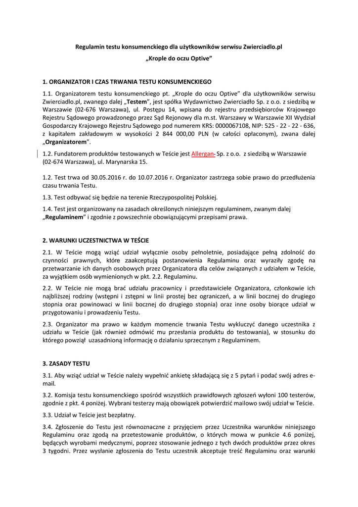Regulamin testu konsumenckiego dla użytkowników serwisu Zwierciadlo.pl „Krople do oczu Optive” 1. ORGANIZATOR I CZAS TRWANIA TESTU KONSUMENCKIEGO 1.1. Organizatorem testu konsumenckiego pt. „Krople do oczu Optive” dla użytkowników serwisu Zwierciadlo.pl, zwanego dalej „Testem”, jest spółka Wydawnictwo Zwierciadło Sp. z o.o. z siedzibą w Warszawie (02-676 Warszawa), ul. Postępu 14, wpisana do rejestru przedsiębiorców Krajowego Rejestru Sądowego prowadzonego przez Sąd Rejonowy dla m.st. Warszawy w Warszawie XII Wydział Gospodarczy Krajowego Rejestru Sądowego pod numerem KRS: 0000067108, NIP: 525 - 22 - 22 - 636, z kapitałem zakładowym w wysokości 2 844 000,00 PLN (w całości opłaconym), zwana dalej „Organizatorem”. 1.2. Fundatorem produktów testowanych w Teście jest Allergan Sp. z o.o. z siedzibą w Warszawie (02-674 Warszawa), ul. Marynarska 15. 1.2. Test trwa od 30.05.2016 r. do 10.07.2016 r. Organizator zastrzega sobie prawo do przedłużenia czasu trwania Testu. 1.3. Test odbywać się będzie na terenie Rzeczypospolitej Polskiej. 1.4. Test jest organizowany na zasadach określonych niniejszym regulaminem, zwanym dalej „Regulaminem” i zgodnie z powszechnie obowiązującymi przepisami prawa. 2. WARUNKI UCZESTNICTWA W TEŚCIE 2.1. W Teście mogą wziąć udział wyłącznie osoby pełnoletnie, posiadające pełną zdolność do czynności prawnych, które zaakceptują postanowienia Regulaminu oraz wyraziły zgodę na przetwarzanie ich danych osobowych przez Organizatora dla celów związanych z udziałem w Teście, za wyjątkiem osób wymienionych w pkt. 2.2. Regulaminu. 2.2. W Teście nie mogą brać udziału pracownicy i przedstawiciele Organizatora, członkowie ich najbliższej rodziny (wstępni i zstępni w linii prostej bez ograniczeń, a w linii bocznej do drugiego stopnia oraz powinowaci w linii bocznej do drugiego stopnia) oraz inne osoby biorące udział w przygotowaniu i prowadzeniu Testu. 2.3. Organizator ma prawo w każdym momencie trwania Testu wykluczyć danego uczestnika z udziału w Teście (jak również odmówić mu przesłania produktu do testowania), w stosunku do którego powziął uzasadnioną informację o działaniu sprzecznym z Regulaminem. 3. ZASADY TESTU 3.1. Aby wziąć udział w Teście należy wypełnić ankietę składającą się z 5 pytań i podać swój adres email. 3.2. Komisja testu konsumenckiego spośród wszystkich prawidłowych zgłoszeń wyłoni 100 testerów, zgodnie z pkt. 4 poniżej. Wybrani testerzy mają obowiązek potwierdzić mailowo swój udział w Teście. 3.3. Udział w Teście jest bezpłatny. 3.4. Zgłoszenie do Testu jest równoznaczne z przyjęciem przez Uczestnika warunków niniejszego Regulaminu oraz zgodą na przetestowanie produktów, o których mowa w punkcie 4.6 poniżej, będących wyrobami medycznymi, poprzez stosowanie jednego z tych dwóch produktów przez okres 3 tygodni. Przez wysłanie zgłoszenia do Testu uczestnik akceptuje treść Regulaminu oraz warunki Testu opublikowane w treści ogłoszenia Testu i zobowiązuje się stosować warunki i zasady określone w w/w ogłoszeniu oraz w Regulaminie. 3.5. Zgłoszenia testowe niepełne lub nieprawidłowo wypełnione nie będą brały udziału w kwalifikacji do Testu. 3.6. Warunkiem wzięcia udziału w Teście jest wypełnienie, po przetestowaniu produktu, ankiety wynikowej. Osoba testująca otrzymuje ankietę od 3 do 5 dni przed końcem Testu i jest zobowiązana udzielić odpowiedzi na zawarte w niej pytania, najpóźniej w ciągu 7 dni od dnia otrzymania ankiety drogą mailową. Niewypełnienie przez uczestnika testu ankiety wynikowej zobowiązuje go do zwrotu nienaruszonego produktu. 3.7. Uczestnik oświadcza, że wyraża zgodę na wielokrotne (nieograniczone ilościowo, czasowo i terytorialnie) oraz nieodpłatne korzystanie w całości jak i w dowolnie wybranych fragmentach z jego pracy testowej (zgłoszenia oraz ankiety wynikowej) przez Organizatora. Uczestnik Testu wyraża zgodę, aby jego praca/ankieta wynikowa zgłoszona przez niego do Testu była wykorzystywana stosownie do potrzeb Organizatora, poddawana stosownym obróbkom, adaptacji, dodawaniu tytułów i podtytułów, skrótów, adjustacji technicznej, tworzeniu opracowań oraz poprawek w dowolnej formie, w tym stylistycznych, ortograficznych, językowych, itp. 3.8. Uwaga! Testerzy, biorący udział w Teście „Krople do oczu Optive”, zobowiązują się do stosowania produktu zgodnie z zaleceniami zawartymi w ulotce dołączonej do opakowania. 4. ZASADY WYŁONIENIA TESTUJĄCYCH OFEROWANE PRODUKTY 4.1. Prawidłowe zgłoszenia będą oceniane przez jury Testu konsumenckiego, w skład którego wejdą przedstawiciele Organizatora, zwane dalej: „Jury Testu”. 4.2. Jury Testu wybierze, na podstawie wyników ankiety, 100 testerów. Kryterium wyboru testerów jest poprawność i jakość udzielonych przez nich odpowiedzi. 4.3. Organizator powiadomi testerów o wygranej drogą e-mailową, wysyłając maila zwrotnego do uczestnika Testu na adres mailowy, z którego dokonano zgłoszenia z prośbą o potwierdzenie udziału w Teście oraz przesłanie danych teleadresowych niezbędnych do wysłania produktów do testowania, tj.: imienia i nazwiska, dokładnego adresu oraz numeru telefonu. 4.4. W przypadku nieotrzymania przez Organizatora kompletnych i prawidłowych danych, o których mowa w pkt. 4.3. powyżej, w terminie 7 dni od dnia wysłania powiadomienia, osoba taka zostaje zdyskwalifikowana z Testu, zaś Jury Testu wyłoni kolejnego testera. 4.5. Lista testerów (imię i nazwisko) zostanie opublikowana na stronie internetowej www.zwierciadlo.pl w terminie do dnia 30.06.2016 r. Testerzy będą mieli 14 dni na przetestowanie otrzymanych produktów. 4.6. Produktami stosowanymi w Teście są: − Optive fusion: krople do oczu stosowane w zapobieganiu objawom zespołu suchego oka, 10 ml − Optive plus: krople do oczu stosowane w zapobieganiu objawom zespołu suchego oka z niedob