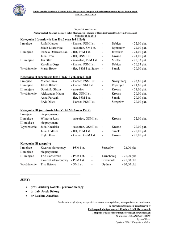 Podkarpackie Spotkania Uczniów Szkół Muzycznych I stopnia w klasie instrumentów dętych drewnianych MIELEC 28-02-2014 Wyniki konkursu Podkarpackich Spotkań Uczniów Szkół Muzycznych I stopnia w klasie instrumentów dętych drewnianych MIELEC 28-02-2014 Kategoria I (uczniowie klas IIc.6 oraz Ic4 i IIc4) I miejsce Rafał Kleszcz - klarnet, PSM I st. Jakub Litarowicz - saksofon, SM I st. II miejsce Izabela Dobrowolska - flet, PSM I st. Julia Urba - flet, OSM I st. III miejsce Jan Głaz - saksofon, PSM I st. Karolina Ozga - klarnet, PSM I st. Wyróżnienie Marta Bober - flet, PSM I st. Sanok - Dębica Rymanów Jarosław Krosno Mielec Dębica Sanok - 22,00 pkt. - 22,00 pkt. - 21,00 pkt. - 21,00 pkt. - 20,33 pkt. - 20,33 pkt. - 20,00 pkt. Kategoria II (uczniowie klas IIIc.6 i IVc6 oraz IIIc4) I miejsce Michał Jania - klarnet, PSM I st. II miejsce Jakub Babicz - klarnet, SM I st. III miejsce Dominik Glazur - saksofon Wyróżnienie Aleksander Mazur - flet, OSM I st. Anna Paryżak - flet, PSM I st. Eryk Oliwa - klarnet, PSM I st. - Nowy Targ Ropczyce Krosno Krosno Sanok Strzyżów - 23,66 pkt. - 21,66 pkt. - 21,00 pkt. - 20,00 pkt. - 20,00 pkt. - 20,00 pkt. - Krosno - 22,00 pkt. - Krosno Sanok Krosno - 20,00 pkt. - 20,00 pkt. - 20,00 pkt. Kategoria III (uczniowie klas Vc.6 i VIc6 oraz IVc4) I miejsce nie przyznano II miejsce Wiktoria Ross - saksofon, OSM I st. III miejsce nie przyznano Wyróżnienie Julia Kazalska - saksofon, OSM I st. Julia Kudasik - flet, PSM I st. Eryk Oliwa - klarnet, OSM I st. Kategoria III (zespoły) I miejsce Kwartet klarnetowy II miejsce nie przyznano III miejsce Trio klarnetowe Kwartet saksofonowy Wyróżnienie Trio fletowe - PSM I st. - Strzyżów - 22,00 pkt. - PSM I st. - PSM I st. - SM I st. - Tarnobrzeg Przeworsk Dydnia - 21,00 pkt. - 21,00 pkt - 20,00 pkt. ______________________________________ JURY: prof. Andrzej Godek – przewodniczący dr hab. Jacek Delong dr Ewelina Zawiślak Serdecznie dziękujemy wszystkich uczniom, nauczycielom, akompaniatorom i rodzicom, że przyjęli zaproszenie i uczestniczyli w Podkarpackich Spotkaniach Uczniów Szkół Muzycznych I stopnia w klasie instrumentów dętych drewnianych W imieniu ORGANIZATORÓW Ryszard Kusek Dyrektor PSM I i II stopnia w Mielcu.