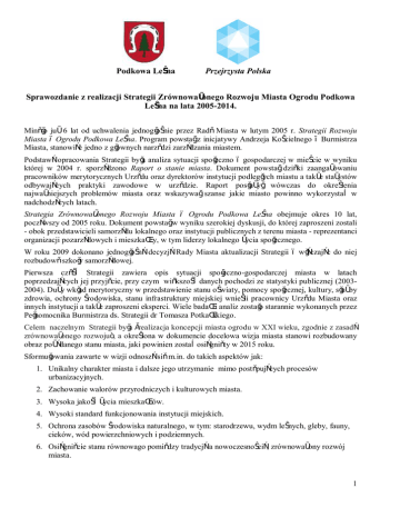 Podkowa Leśna Przejrzysta Polska Sprawozdanie z realizacji Strategii Zrównoważonego Rozwoju Miasta Ogrodu Podkowa Leśna na lata 2005-2014. Minęło już 6 lat od uchwalenia jednogłośnie przez Radę Miasta w lutym 2005 r. Strategii Rozwoju Miasta – Ogrodu Podkowa Leśna. Program powstał z inicjatywy Andrzeja Kościelnego – Burmistrza Miasta, stanowiąc jedno z głównych narzędzi zarządzania miastem. Podstawą opracowania Strategii była analiza sytuacji społeczno – gospodarczej w mieście w wyniku której w 2004 r. sporządzono Raport o stanie miasta. Dokument powstał dzięki zaangażowaniu pracowników merytorycznych Urzędu oraz dyrektorów instytucji podległych miastu a także stażystów odbywających praktyki zawodowe w urzędzie. Raport posłużył wówczas do określenia najważniejszych problemów miasta oraz wskazywał szanse jakie miasto powinno wykorzystać w nadchodzących latach. Strategia Zrównoważonego Rozwoju Miasta – Ogrodu Podkowa Leśna obejmuje okres 10 lat, począwszy od 2005 roku. Dokument powstał w wyniku szerokiej dyskusji, do której zaproszeni zostali - obok przedstawicieli samorządu lokalnego oraz instytucji publicznych z terenu miasta - reprezentanci organizacji pozarządowych i mieszkańcy, w tym liderzy lokalnego życia społecznego. W roku 2009 dokonano jednogłośną decyzją Rady Miasta aktualizacji Strategii – włączając do niej rozbudowę szkoły samorządowej. Pierwsza część Strategii zawiera opis sytuacji społeczno-gospodarczej miasta w latach poprzedzających jej przyjęcie, przy czym większość danych pochodzi ze statystyki publicznej (20032004). Duży wkład merytoryczny w przedstawienie stanu oświaty, pomocy społecznej, kultury, służby zdrowia, ochrony środowiska, stanu infrastruktury miejskiej wnieśli pracownicy Urzędu Miasta oraz innych instytucji a także zaproszeni eksperci. Wiele badań i analiz zostało starannie wykonanych przez Pełnomocnika Burmistrza ds. Strategii dr Tomasza Potkańskiego. Celem naczelnym Strategii była „realizacja koncepcji miasta ogrodu w XXI wieku, zgodnie z zasadą zrównoważonego rozwoju”, a określona w dokumencie docelowa wizja miasta stanowi rozbudowany obraz pożądanego stanu miasta, jaki powinien zostać osiągnięty w 2015 roku. Sformułowania zawarte w wizji odnoszą się m.in. do takich aspektów jak: 1. Unikalny charakter miasta i dalsze jego utrzymanie mimo postępujących procesów urbanizacyjnych. 2. Zachowanie walorów przyrodniczych i kulturowych miasta. 3. Wysoka jakość życia mieszkańców. 4. Wysoki standard funkcjonowania instytucji miejskich. 5. Ochrona zasobów środowiska naturalnego, w tym: starodrzewu, wydm leśnych, gleby, fauny, cieków, wód powierzchniowych i podziemnych. 6. Osiągnięcie stanu równowago pomiędzy tradycją a nowoczesnością, zrównoważony rozwój miasta. 1 7. Uwzględnienie potrzeb materialnych (infrastruktura drogowa, ciągi pieszo-rowerowe, kanalizacja) oraz społecznych mieszkańców (różnorodna oferta instytucji kultury, oferta sportowa, ochrona zdrowia, bezpieczeństwo, rekreacja i wypoczynek). 8. Instytucjonalne i społeczne przestrzeganie oraz egzekwowanie zapisów prawa lokalnego, w tym planu zagospodarowania przestrzennego miasta, regulaminu czystości i porządku w mieście. 9. Podnoszenie świadomości mieszkańców oraz tożsamości miejsca poprzez działalność edukacyjną. 10. Integracja mieszkańców, solidarna i zintegrowana społeczność. 11. Edukacja na wysokim poziomie, wychowanie i rozwój osobowości dzieci i młodzieży, kształtowanie postaw patriotycznych , chrześcijańskich i etycznych. 12. Poczucie bezpieczeństwa socjalnego mieszkańców. 13. Rozwijanie nowoczesnego modelu gospodarki tzw. post-przemysłowej. 14. Zapewnienie szybkich i bezpiecznych połączeń komunikacyjnych w mieście i na zewnątrz (kolej, drogi, ścieżki rowerowe). 15. Współpraca i uzgadnianie planów rozwojowych z sąsiednimi samorządami. 16. Podkowa Leśna będzie ważnym ośrodkiem edukacyjno - kulturalno-ekologicznym, wzorcowym małym miastem łączącym rozwój gospodarczy z zabezpieczeniem potrzeb społecznych. 17. Wartości i tradycje otwartości wierna realizacja idei miasta - ogrodu pozwoli uzyskać status Polskiego pomnika historii a nawet docelowo wpisania na światową listę dziedzictwa kulturowego UNESCO. Wymienione elementy wizji stały się podstawą do sformułowania celów rozwojowych miasta: strategicznych i szczegółowych. Struktura celów strategicznych łączy harmonijnie wszystkie aspekty rozwoju miasta: środowiskowy, gospodarczy i społeczny, gwarantując jego zrównoważony rozwój, zgodnie z celem naczelnym strategii jakim jest: Realizacja koncepcji miasta ogrodu XXI wieku zgodnie z zasadą zrównoważonego rozwoju. W Strategii przyjęto następujące cele strategiczne: Cel 1: Nowoczesna infrastruktura komunalna (z zastosowaniem technologii pro-ekologicznych) Cel 2: Ochrona środowiska naturalnego i układu urbanistycznego miasta-ogrodu Cel 3: Wszechstronny rozwój społeczny mieszkańców miasta-ogrodu Cel 4: Rozwój przedsiębiorczości post-przemysłowej Wymienione cele są wzajemnie ze sobą powiązane, wzajemnie się uzupełniają i mają jednakową wartość a zaniechanie realizacji któregokolwiek z nich może negatywnie oddziaływać na pozostałe. Dla poprawnego określenia czy przygotowana strategia jest realizowana oraz czy założone cele są osiągane, każdemu z celów przyporządkowano cele szczegółowe, a tym z kolei wskaźniki ich realizacji. Uzupełnieniem Strategii są Plany Realizacyjne do Strategii oraz coroczna ocena ich wykonania, dokonywana przez Urząd Miasta. Wszystkie dokumenty są dostępne na stronie internetowej (www.podkowalesna.pl) miasta w Biuletynie Informacji Publicznej oraz w zakładce samorząd. Realizatorami Strategii są Urząd Miasta i instytucje miejskie, organizacje pozarządowe i obywatele Miasta – Ogrodu a także przedsiębiorcy lokalni oraz
