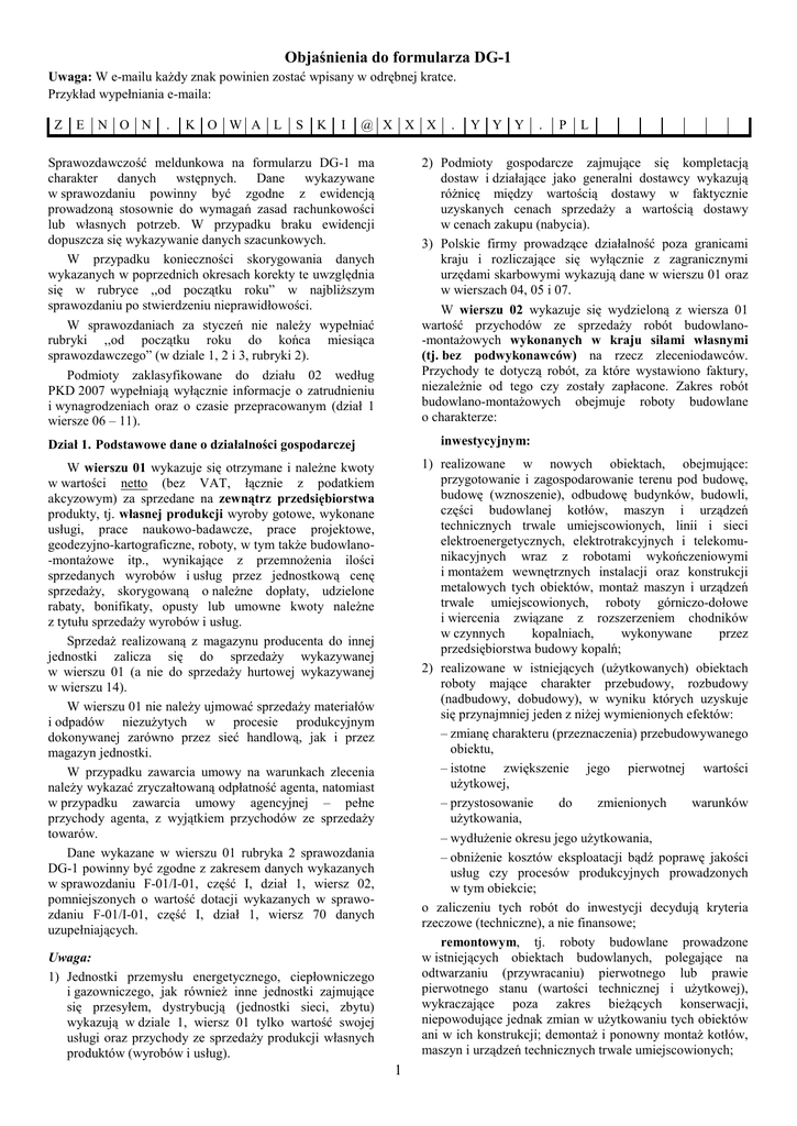 Objaśnienia do formularza DG-1 Uwaga: W e-mailu każdy znak powinien zostać wpisany w odrębnej kratce. Przykład wypełniania e-maila: Z E N O N . K O W A L S K I @ X X X Sprawozdawczość meldunkowa na formularzu DG-1 ma charakter danych wstępnych. Dane wykazywane w sprawozdaniu powinny być zgodne z ewidencją prowadzoną stosownie do wymagań zasad rachunkowości lub własnych potrzeb. W przypadku braku ewidencji dopuszcza się wykazywanie danych szacunkowych. W przypadku konieczności skorygowania danych wykazanych w poprzednich okresach korekty te uwzględnia się w rubryce ,,od początku roku” w najbliższym sprawozdaniu po stwierdzeniu nieprawidłowości. W sprawozdaniach za styczeń nie należy wypełniać rubryki ,,od początku roku do końca miesiąca sprawozdawczego” (w dziale 1, 2 i 3, rubryki 2). Podmioty zaklasyfikowane do działu 02 według PKD 2007 wypełniają wyłącznie informacje o zatrudnieniu i wynagrodzeniach oraz o czasie przepracowanym (dział 1 wiersze 06 – 11). Y Y Y . P L 2) Podmioty gospodarcze zajmujące się kompletacją dostaw i działające jako generalni dostawcy wykazują różnicę między wartością dostawy w faktycznie uzyskanych cenach sprzedaży a wartością dostawy w cenach zakupu (nabycia). 3) Polskie firmy prowadzące działalność poza granicami kraju i rozliczające się wyłącznie z zagranicznymi urzędami skarbowymi wykazują dane w wierszu 01 oraz w wierszach 04, 05 i 07. W wierszu 02 wykazuje się wydzieloną z wiersza 01 wartość przychodów ze sprzedaży robót budowlano-montażowych wykonanych w kraju siłami własnymi (tj. bez podwykonawców) na rzecz zleceniodawców. Przychody te dotyczą robót, za które wystawiono faktury, niezależnie od tego czy zostały zapłacone. Zakres robót budowlano-montażowych obejmuje roboty budowlane o charakterze: inwestycyjnym: Dział 1. Podstawowe dane o działalności gospodarczej 1) realizowane w nowych obiektach, obejmujące: przygotowanie i zagospodarowanie terenu pod budowę, budowę (wznoszenie), odbudowę budynków, budowli, części budowlanej kotłów, maszyn i urządzeń technicznych trwale umiejscowionych, linii i sieci elektroenergetycznych, elektrotrakcyjnych i telekomunikacyjnych wraz z robotami wykończeniowymi i montażem wewnętrznych instalacji oraz konstrukcji metalowych tych obiektów, montaż maszyn i urządzeń trwale umiejscowionych, roboty górniczo-dołowe i wiercenia związane z rozszerzeniem chodników w czynnych kopalniach, wykonywane przez przedsiębiorstwa budowy kopalń; 2) realizowane w istniejących (użytkowanych) obiektach roboty mające charakter przebudowy, rozbudowy (nadbudowy, dobudowy), w wyniku których uzyskuje się przynajmniej jeden z niżej wymienionych efektów: – zmianę charakteru (przeznaczenia) przebudowywanego obiektu, – istotne zwiększenie jego pierwotnej wartości użytkowej, – przystosowanie do zmienionych warunków użytkowania, – wydłużenie okresu jego użytkowania, – obniżenie kosztów eksploatacji bądź poprawę jakości usług czy procesów produkcyjnych prowadzonych w tym obiekcie; o zaliczeniu tych robót do inwestycji decydują kryteria rzeczowe (techniczne), a nie finansowe; remontowym, tj. roboty budowlane prowadzone w istniejących obiektach budowlanych, polegające na odtwarzaniu (przywracaniu) pierwotnego lub prawie pierwotnego stanu (wartości technicznej i użytkowej), wykraczające poza zakres bieżących konserwacji, niepowodujące jednak zmian w użytkowaniu tych obiektów ani w ich konstrukcji; demontaż i ponowny montaż kotłów, maszyn i urządzeń technicznych trwale umiejscowionych; W wierszu 01 wykazuje się otrzymane i należne kwoty w wartości netto (bez VAT, łącznie z podatkiem akcyzowym) za sprzedane na zewnątrz przedsiębiorstwa produkty, tj. własnej produkcji wyroby gotowe, wykonane usługi, prace naukowo-badawcze, prace projektowe, geodezyjno-kartograficzne, roboty, w tym także budowlano-montażowe itp., wynikające z przemnożenia ilości sprzedanych wyrobów i usług przez jednostkową cenę sprzedaży, skorygowaną o należne dopłaty, udzielone rabaty, bonifikaty, opusty lub umowne kwoty należne z tytułu sprzedaży wyrobów i usług. Sprzedaż realizowaną z magazynu producenta do innej jednostki zalicza się do sprzedaży wykazywanej w wierszu 01 (a nie do sprzedaży hurtowej wykazywanej w wierszu 14). W wierszu 01 nie należy ujmować sprzedaży materiałów i odpadów niezużytych w procesie produkcyjnym dokonywanej zarówno przez sieć handlową, jak i przez magazyn jednostki. W przypadku zawarcia umowy na warunkach zlecenia należy wykazać zryczałtowaną odpłatność agenta, natomiast w przypadku zawarcia umowy agencyjnej – pełne przychody agenta, z wyjątkiem przychodów ze sprzedaży towarów. Dane wykazane w wierszu 01 rubryka 2 sprawozdania DG-1 powinny być zgodne z zakresem danych wykazanych w sprawozdaniu F-01/I-01, część I, dział 1, wiersz 02, pomniejszonych o wartość dotacji wykazanych w sprawozdaniu F-01/I-01, część I, dział 1, wiersz 70 danych uzupełniających. Uwaga: 1) Jednostki przemysłu energetycznego, ciepłowniczego i gazowniczego, jak również inne jednostki zajmujące się przesyłem, dystrybucją (jednostki sieci, zbytu) wykazują w dziale 1, wiersz 01 tylko wartość swojej usługi oraz przychody ze sprzedaży produkcji własnych produktów (wyrobów i usług). . 1 Dane podaje się bez przeliczenia niepełnozatrudnionych na pełne etaty. pozostałe roboty obejmujące: 1) roboty budowlane związane z konserwacją, tj. okresowym wykonywaniem robót niezbędnych do utrzymania obiektu budowlanego i jego otoczenia w należytym stanie technicznym, obejmujących likwidację przyczyn i skutków uszkodzeń mogących spowodować przedwczesne niszczenie obiektu lub jego elementów i urządzeń; 2) roboty rozbiórkowo-porządkowe prowadzone dla uzyskania materiałów nadających się do dalszego użycia; 3) roboty w zakresie budowy i rozbió