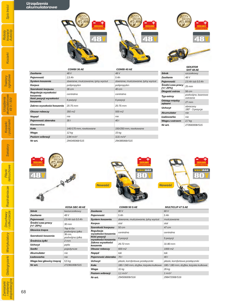 Spis treści Kosiarki Roboty koszące Autoclip 8U]ÇG]HQLD DNXPXODWRURZH Zasilanie �� � �� � Silnik SEKATOR SHT 48 AE szczotkowy 3RMHPQRĝÉ 2,� �� � �� Zasilanie �� � System koszenia zbieranie, mulczowanie, tylny wyrzut zbieranie, mulczowanie, tylny wyrzut Korpus polipropylen polipropylen 6]HURNRĝÉNRUSXVX 5HJXODFMDZ\VRNRĝFL koszenia ,ORĝÉSR]\FMLZ\VRNRĝFL koszenia �6 cm �0 cm centralna centralna 6 pozycji 6 pozycji =DNUHVZ\VRNRĝFLNRV]HQLD 2�-7� mm 2�-7� mm Obszar roboczy ��0 m2 �00 m2 2�� �� lub ��0 �� 3RMHPQRĝÉ ĜUHGQLF]DVSUDF\ 2� min �6 cm 'ĄXJRĝÉRVWU]D podwójne, laserowo Typ ostrzy ostrzone 2GVWÛSPLÛG]\ 27 mm ]ÛEDPL obracany Uchwyt 1�0� - � pozycje nie Akumulator 1DSÛG nie nie ăDGRZDUND nie 3RMHPQRĝÉ]ELHUDND �� l �0 l :DJD]RVWU]HP 2,7 kg Nr art. 27��6000���1� Kosiarki i podcinarki Urządzenia akumulatorowe 48 V / 80V Traktory ogrodowe COMBI 36 AE COMBI 40 AE Kierownica 1�0�170 mm, rowkowane 1�0�2�0 mm, rowkowane :DJD 12 kg 1� kg Poziom wibracji 2,�� m�s� �,�1 m�s� Nr art. 2�����06���1� 2�����06���1� Pilarki łańcuchowe Sekatory .RĄD Rozdrabniacze 1RZRĝÉ Zamiatarki i materiały Glebogryzarki Wertykulatory eksploatacyjne Dmuchawy i odkurzacze KOSA SBC 48 AE COMBI 50 S AE MULTICLIP 47 S AE Silnik bezszczotkowy Zasilanie �0 � �0 � Zasilanie �� � 3RMHPQRĝÉ � �� � �� 3RMHPQRĝÉ ĜUHGQLF]DVSUDF\ 2�� �� lub ��0 �� System koszenia zbieranie, mulczowanie, tylny wyrzut mulczowanie �0 min Korpus stal stal �0 cm �7 cm centralna centralna 6 pozycji � pozycji 26-72 mm �1-�0 mm 600 m2 1000 m2 ĜUHGQLFDľ\ĄNL �ap � �o podwójna żyłka �6 cm, podwójna żyłka 2 mm Uchwyt pętla Szelki pojedyncze 6]HURNRĝÉNRUSXVX 5HJXODFMD Z\VRNRĝFLNRV]HQLD ,ORĝÉSR]\FML Z\VRNRĝFLNRV]HQLD =DNUHVZ\VRNRĝFL koszenia Obszar roboczy Akumulator nie 1DSÛG tak tak ăDGRZDUND nie 3RMHPQRĝÉ]ELHUDND 70 l �0 l :DJDEH]JĄRZLF\WQÇFHM �,� kg Uchwyt płaski, komfortowe przełączniki płaski, komfortowe przełączniki Nr art. 272�6100���1� .RĄD 1�0 � 2�0 mm, dry�e�, łożyska kulkowe 1�0 � 1�0 mm, dry�e�, łożyska kulkowe :DJD �1 kg 26 kg Poziom wibracji 1,1 m�s� 1 m�s� Nr art. 2���0600���16 2���7200���16 *ĄRZLFDWQÇFD 6]HURNRĝÉNRV]HQLD 66 68 1RZRĝÉ