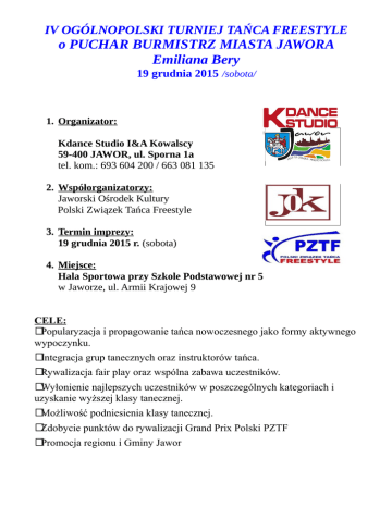 IV OGÓLNOPOLSKI TURNIEJ TAŃCA FREESTYLE o PUCHAR BURMISTRZ MIASTA JAWORA Emiliana Bery 19 grudnia 2015 /sobota/ 1. Organizator: Kdance Studio I&A Kowalscy 59-400 JAWOR, ul. Sporna 1a tel. kom.: 693 604 200 / 663 081 135 2. Współorganizatorzy: Jaworski Ośrodek Kultury Polski Związek Tańca Freestyle 3. Termin imprezy: 19 grudnia 2015 r. (sobota) 4. Miejsce: Hala Sportowa przy Szkole Podstawowej nr 5 w Jaworze, ul. Armii Krajowej 9 CELE: Popularyzacja i propagowanie tańca nowoczesnego jako formy aktywnego wypoczynku. Integracja grup tanecznych oraz instruktorów tańca. Rywalizacja fair play oraz wspólna zabawa uczestników. Wyłonienie najlepszych uczestników w poszczególnych kategoriach i uzyskanie wyższej klasy tanecznej. Możliwość podniesienia klasy tanecznej. Zdobycie punktów do rywalizacji Grand Prix Polski PZTF Promocja regionu i Gminy Jawor DYSCYPLINY; KONKURENCJE; KATEGORIE WIEKOWE KATEGORIA WIEKOWA DYSCYPLINA KONKURENCJA DISCO DANCE debiuty; kl. E, D, C, B, A, S (PZTF) są to turnieje klasyfikacyjne solo open bez duetów MODERN bez duetów Duety (PZTF) poziomy: D+E, B+C, S+A Małe grupy (3-7 osób) 12.-13 / 2003 – 2002 14.-15 / 1999 – 2000 I i II liga Dorośli: I i II liga 16.+ lat / 1999 i starsi solo Duety / małe grupy / debiuty (PZTF) open Teams (3-7 osób) I i II liga INNE FORMY Juniorzy: open Formacje (od 8 osób) BREAK DANCE Dzieci: 7.- lat / 2008 i młodsi 8.- 9 lat / 2007 - 2006 10.-11 lat / 2005 -2004 HIP-HOP JAZZ DANCE Solo Zespoły / open (od 3 osób) Formacje / Zespoły 11.- / 2004 i młodsi 12.-15 / 2003 – 2000 16.+ / 1999 i starsi O przynależności do danej kategorii wiekowej decyduje wiek najstarszego uczestnika. I i II liga Zgodnie z uchwałą Zarządu PZTF z dnia 19.12.2012 r., kategorie wiekowe mogą zostać połączone w przypadku, gdy nie ma pełnych finałów w poszczególnych przedziałach wiekowych (jeżeli jest 4 podmioty lub mniej). Kategorie open rozgrywa się tylko przy pełnych finałach (nie mniej niż 5 podmiotów w konkurencji). Ligi zespołów (charakterystyka): 1. II liga – zespoły początkujące, zespoły szkolne. Nie ma podziału na dyscypliny taneczne. Prezentacja do 4 min. Nie wymagana przynależność organizacyjna. 2. I liga – zespoły średnio zaawansowane (uczestnicy ogólnopolskich festiwali i turniejów). Podział na Street (Disco Dance, Hip Hop, Break Dance, Electric Boogie, JumpStyle); Art (Jazz, Modern, Balet, Show Dance, Belly Dance/Oriental) i Tańce Par (Caribean, Latin, SynchroDance). Prezentacje w Street do 3 min.; Art i Tańce Par do 4 min. Nie wymagana przynależność organizacyjna. 3. Ekstraliga – zespoły zaawansowane (uczestnicy MŚ, ME, PE, KM IDO, finaliści dużych festiwali). Podział na dyscypliny i kategorie – zgodnie z przepisami IDO. Nie wymagana przynależność organizacyjna. CZAS PREZENTACJI: Solo, duety / Disco Dance, Hip-Hop, Jazz, Modern, Break Dance małe Grupy Disco Dance; Hip Hop Teams Break Dance (Showcase) Uwaga! małe Grupy Disco Dance 11.- - 1.00 min. (muzyka organizatora). - 2.00 min. (muzyka organizatora). - do 3.00 min. (muzyka własna) - 1.30 min. (muzyka organizatora). Formacje Hip Hop; Disco Dance Inne Formy - do 3.00 min. (muzyka własna) - do 4.00 min. (muzyka własna). WARUNKI UCZESTNICTWA: Dokonanie zgłoszenia on-line poprzez stronę https://pztf.pl/rejestracja/listaKlubow/ do 11.12.2015r. Dla niezrzeszonych w PZTF -przesłanie karty zgłoszenia w terminie do 11.12.2015r. na adres email: [email protected] Uiszczenie opłaty startowej w wysokości 60 zł za solo i duety (od osoby) oraz 15 zł za osobę za udział w zespole(mała Grupa I i II liga; Formacje I i II liga; Inne Formy I i II liga. Uwaga! – zniżki dla tancerzy PZTF: · · solo / duety: 30 zł od osoby debiuty 20 zł od osoba W przypadku tańczenia wyłącznie w zespołach (mała Grupa, Formacje, Zespoły): 10 zł od osoby. Tancerze PZTF za udział w więcej niż 1 konkurencji – dodatkowo 10 zł za każdy start. Opłatę startową zbiorczo za wszystkich zawodników należy przesłać na konto: Izabela Kowalska nr konta: 54 1020 3017 0000 2502 0075 4796 w treści przelewu należy wpisać przykładowo: KLUB xxxx opłata startowa OTTF –Jawor. Rejestracja zespołu w dniu imprezy zgodnie z Programem Ramowym. Przygotowanie muzyki do prezentacji do własne muzyki: oddzielnie do każdej choreografii. Należy opisać nośnik w następujący sposób: nazwa zespołu, kategoria, tytuł choreografii, czas trwania. Podporządkowanie się zaleceniom organizacyjnym, przepisom BHP i PPOŻ. Podporządkowanie się przepisom szczegółowym turnieju. Tańczenie w obuwiu sportowym, które nie niszczy parkietu. Turniej został zatwierdzony przez Zarząd PZTF i zostanie rozegrany zgodnie z Regulaminem. UWAGA! 11.12.2015r. stanowi ostateczną datę wniesienia opłaty startowej. Po tym terminie organizator zastrzega sobie prawo nie przyjęcia zgłoszenia. Uczestnik ma prawo wycofać się z udziału w turnieju na każdym etapie. W takim przypadku, jak również w przypadku niezakwalifikowania się do dalszych rund, opłata startowa nie podlega zwrotowi. KOMISJA SĘDZIOWSKA: W skład Komisji Sędziowskiej wchodzi minimum 3 licencjonowanych sędziów PZTF. SPOSÓB OCENY: Finały w klasach tanecznych (solo) i na poziomach (duety), ekstraklasa/open - przy obliczaniu wyników w finale stosowany jest Skating System. Kategorie Debiuty – ocena szkolna. małe Grupy, Formacje oraz zespoły II i I liga ocena na miejsca I; II; III. RAMOWY PROGRAM TURNIEJU 7:30 Otwarcie hali od 8:00 Rejestracja 9:00 – 15.00 Disco Dance; Jazz Dance około 15.00 Przerwa obiadowa 16:00 – 21.00 Modern; Hip Hop; Break Dance; Inne Formy Program ramowy może ulec zmianie. NAGRODY: Debiuty (solo i duety) – dyplomy. Klasy taneczne – medale dla miejsc I; II; III i dyplomy dla finalistów. Małe grupy II i I liga – puchar i dyplom dla wszystkich zespołów. Formacje II i I liga – puchar i dyplom dla wszystkich zespołów. Open - puchar za I miejsce