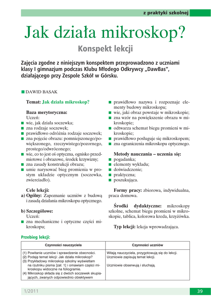 z praktyki szkolnej Jak działa mikroskop? Konspekt lekcji Zajęcia zgodne z niniejszym konspektem przeprowadzono z uczniami klasy I gimnazjum podczas Klubu Młodego Odkrywcy „DawBas”, działającego przy Zespole Szkół w Górsku. n DAWID BASAK Temat: Jak działa mikroskop? n prawidłowo nazywa i rozpoznaje ele- Baza merytoryczna: Uczeń: wie, jak działa soczewka; zna rodzaje soczewek; prawidłowo odróżnia rodzaje soczewek; zna pojęcie obrazu: pomniejszonego/powiększonego, rzeczywistego/pozornego, prostego/odwróconego; wie, co to jest oś optyczna, ognisko przedmiotowe i obrazowe, środek krzywizny; zna zasady konstrukcji obrazu; umie narysować bieg promienia w prostym układzie optycznym (soczewka, zwierciadło). n wie, jaki obraz powstaje w mikroskopie; n zna wzór na powiększenie obrazu w mi- Cele lekcji: a) Ogólny: Zapoznanie uczniów z budową i zasadą działania mikroskopu optycznego. Formy pracy: zbiorowa, indywidualna, praca domowa. menty budowy mikroskopu; n n n n n n n b) Szczegółowe: Uczeń: n zna mechaniczne i optyczne części mikroskopu; kroskopie; n odtwarza schemat biegu promieni w mi- kroskopie; n prawidłowo posługuje się mikroskopem; n zna ograniczenia mikroskopu optycznego. n n n n n Metody nauczania – uczenia się: pogadanka; elementy wykładu; doświadczenie; praktyczna; poszukująca. Środki dydaktyczne: mikroskopy szkolne, schemat biegu promieni w mikroskopie, tablica, kolorowa kreda, krzyżówka. Typ lekcji: lekcja wprowadzająca. Przebieg lekcji: Czynności nauczyciela (1) Powitanie uczniów i sprawdzenie obecności. (2) Podaję temat lekcji: Jak działa mikroskop? (3) Przykładowy mikroskop szkolny wyświetlam na rzutniku pisma [zał. 1] i omawiam części mikroskopu widoczne na foliogramie. (4) Mikroskop składa się z dwóch soczewek skupiających, zwanych odpowiednio obiektywem 1/2011 Czynności uczniów Witają nauczyciela, przygotowują się do lekcji. Uczniowie zapisują temat lekcji. Uczniowie obserwują i słuchają. 39 z praktyki szkolnej Czynności nauczyciela (5) (6) (7) (8) (9) (10) (11) (12) (13) (14) (15) (16) (17) i okularem, tubusu, śruby maro- i mikrometrycznej, rewolweru, kondensatora, lusterka. Mówię, że obraz w mikroskopie optycznym powstaje wskutek zajścia zjawisk dyfrakcji światła na powierzchni badanego przedmiotu. Stąd też istnieje fizyczne ograniczenie na zdolność rozdzielczą mikroskopów optycznych. Otóż można dostrzec szczegóły danego przedmiotu, które są nie mniejsze niż połowa długości fali stosowanego promieniowania. Postęp technologiczny spowodował, że oprócz mikroskopów optycznych są dostępne np. mikroskopy elektronowe czy skaningowe. Aby dobrze zrozumieć działanie mikroskopu, trzeba wiedzieć, jaki jest w nim przebieg promienia. Rysuję wspólnie z uczniami bieg promieni w mikroskopie na tablicy, omawiając każdą część i literę [zał. 2]. Obserwowany drobny przedmiot jest umieszczony w odległości zawartej między ogniskową i podwójną ogniskową obiektywu, jednak w pobliżu jego ogniska. Jaki obraz jest w mikroskopie? Powiększony, odwrócony i rzeczywisty obraz P’N” przedmiotu PN obserwujemy przez długą soczewkę skupiającą. Okular wytwarza pozorny obraz P”„N”” rzeczywistego obrazu P’N”. Jakie będzie całkowite powiększenie obrazu oglądanego przez mikroskop? Powiększony przez obiektyw obraz p1 razy jest jeszcze powiększany p2 razy przez okular, więc (podaję notatkę): całkowite powiększenie P oglądanego przez mikroskop obrazu wyraża iloczyn: P = p1p2. Położenie przedmiotu PN zwykle dobieramy tak, aby jego odległość od ogniskowej była w przybliżeniu równa ogniskowej f1. Z kolei odległość obrazu jest w przybliżeniu równa długości tubusu mikroskopu, którą oznaczamy jako l. Powiększenie p1 możemy obliczyć za pomocą wzoru: p1 ≈ l/f1. Rzeczywisty obraz P’N’, który wytwarza obiektyw, powstaje między ogniskiem okularu i okularem, ale blisko ogniska. Możemy więc przyjąć, że jego odległość od okularu jest w przybliżeniu równa ogniskowej f2. Powiększenie p2 możemy obliczyć ze wzoru: p2 ≈ d/f2. Proszę jednego z uczniów o wyliczenie na tablicy całkowitego powiększenia mikroskopu. Co możecie powiedzieć o tym wzorze i wielkościach go opisujących? (18) Teraz poznamy zasady mikroskopowania [zał. 3]. A następnie przystępujemy do ćwiczenia nr 1 [zał. 4]. (19) W ramach zadania domowego proszę uczniów o rozwiązanie krzyżówki [zał. 5]. (20) Pożegnanie z uczniami. 40 Czynności uczniów Uczniowie słuchają, notują. Uczniowie wykonują polecenia i zadają pytania. Uczniowie słuchają. Uczeń: powiększony, odwrócony i rzeczywisty. Uczniowie słuchają. Uczniowie zgadują. Uczniowie słuchają, notują. Uczniowie słuchają. Uczniowie słuchają. Uczniowie słuchają. Uczeń: P ≈ p1p2 ≈ l/f1 · d/f2. Uczniowie: Powiększenie całkowite mikroskopu jest odwrotnie proporcjonalne do iloczynu ogniskowych obiektywu i okularu, przy danych l i d. Uczniowie przystępują do wykonania ćwiczenia. Uczniowie słuchają. Pożegnanie z nauczycielem. biologia w szkole z praktyki szkolnej Załącznik nr 1. Mikroskop szkolny [11] Załącznik nr 2. Bieg promieni w mikroskopie 1/2011 41 z praktyki szkolnej Załącznik nr 3. Zasady mikroskopowania 1. Przed rozpoczęciem mikroskopowania mikroskop należy oczyścić ściereczką (uwaga na części optyczne). 2. Za pomocą lusterka wklęsłego kierujemy światło do mikroskopu. Następnie ustawiamy lusterko tak, aby pole widzenia było równomiernie oświetlone. 3. Preparat oglądamy najpierw w małym, a następnie coraz większym powiększeniu. Pole widzenia pod obiektywem silniejszym jest ciemniejsze, dlatego trzeba zwiększyć otwór w przesłonie. 4. Ustawiamy mikroskop na obraz śrubą makrometryczną, a następnie śrubą mikrometryczną regulujemy ostrość. Przy zmianie obiektywu na silniejszy należy podnieść nieco tubus. 5. Nie dotykamy soczewek palc