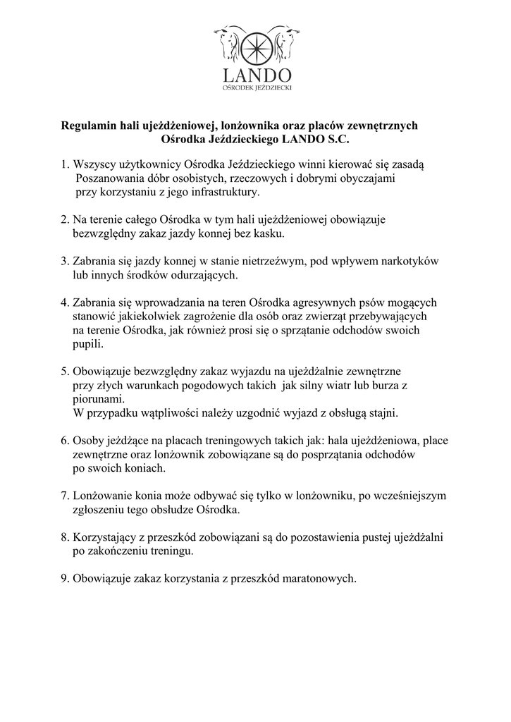 Regulamin hali ujeżdżeniowej, lonżownika oraz placów zewnętrznych Ośrodka Jeździeckiego LANDO S.C. 1. Wszyscy użytkownicy Ośrodka Jeździeckiego winni kierować się zasadą Poszanowania dóbr osobistych, rzeczowych i dobrymi obyczajami przy korzystaniu z jego infrastruktury. 2. Na terenie całego Ośrodka w tym hali ujeżdżeniowej obowiązuje bezwzględny zakaz jazdy konnej bez kasku. 3. Zabrania się jazdy konnej w stanie nietrzeźwym, pod wpływem narkotyków lub innych środków odurzających. 4. Zabrania się wprowadzania na teren Ośrodka agresywnych psów mogących stanowić jakiekolwiek zagrożenie dla osób oraz zwierząt przebywających na terenie Ośrodka, jak również prosi się o sprzątanie odchodów swoich pupili. 5. Obowiązuje bezwzględny zakaz wyjazdu na ujeżdżalnie zewnętrzne przy złych warunkach pogodowych takich jak silny wiatr lub burza z piorunami. W przypadku wątpliwości należy uzgodnić wyjazd z obsługą stajni. 6. Osoby jeżdżące na placach treningowych takich jak: hala ujeżdżeniowa, place zewnętrzne oraz lonżownik zobowiązane są do posprzątania odchodów po swoich koniach. 7. Lonżowanie konia może odbywać się tylko w lonżowniku, po wcześniejszym zgłoszeniu tego obsłudze Ośrodka. 8. Korzystający z przeszkód zobowiązani są do pozostawienia pustej ujeżdżalni po zakończeniu treningu. 9. Obowiązuje zakaz korzystania z przeszkód maratonowych. REGULAMIN Ośrodka Jeździeckiego LANDO S.C. 1. Na terenie całego Ośrodka obowiązują zasady określone Kodeksem Postępowania z Koniem. 2. Teren Ośrodka Jeździeckiego winien służyć do wypoczynku i rekreacji, przy poszanowaniu wzajemnych praw i obowiązków osób i zwierząt przebywających na w/w terenie. 3. Samochody lub pojazdy zmotoryzowane należy parkować tylko w miejscach do tego wyznaczonych. 4. W całym Ośrodku obowiązuje całkowity zakaz poruszania się samochodami, rowerami, quadami, deskorolkami, na rolkach, na hulajnogach lub innych urządzeniach przeznaczonych do poruszania się. 5. Obowiązuje nakaz poruszania się konno tylko po wyznaczonych w tym celu ścieżkach lub placach. 6. Osoby korzystające z placów treningowych takich jak: hala ujeżdżeniowa, place zewnętrzne oraz lonżownik zobowiązane są do posprzątania odchodów po swoich koniach. 7. Lonżowanie konia może odbywać się tylko w wyznaczonym do tego miejscu ( lonżownik), po wcześniejszym zgłoszeniu tego obsłudze stajni. 8. Zabrania się wprowadzania na teren Ośrodka psów agresywnych mogących stanowić jakiekolwiek zagrożenie dla osób oraz zwierząt przebywający na w/w terenie. 9. Na terenie Ośrodka prosimy o trzymanie psów na smyczy jak również o sprzątanie po swoich pupilach. 10. W celu odbywania jazd konnych lub treningów, osoby zainteresowane mogą korzystać z infrastruktury znajdującej się na terenie Ośrodka wyłącznie za uprzednim zgłoszeniem tego w biurze administracyjnym i uiszczeniu stosownej opłaty. 11. Zabrania się korzystania z padoków innych niż te, które są wyznaczone przez obsługę stajni. 12. Zaleca się pozostawienie pracownikom obsługi stajni wiadomości o wyjeździe w teren, przewidywanym czasie i trasie wyjazdu, oraz przypuszczalnej godzinie powrotu. 13. Za mienie osób przebywających na w/w terenie, Ośrodek nie ponosi odpowiedzialności. 14. Na terenie Ośrodka obowiązuje zakaz palenia, za wyjątkiem miejsc specjalnie w tym celu wyznaczonych. 15. Obsługa ma prawo doprowadzić do usunięcia z terenu Ośrodka osoby, które nie przestrzegają Regulaminu.