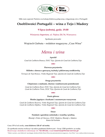Miło nam zaprosić Państwa na kolację klubową połączoną z degustacją win z Portugalii Osobliwości Portugalii – wina z Tejo i Madery 9 lipca (sobota), godz. 19.00 Winiarnia Superiore, ul. Piękna 28/34, Warszawa Spotkanie prowadzi Wojciech Giebuta – redaktor magazynu „Czas Wina” Menu i wina Aperitif Casal da Coelheira Branco, DOC Tejo, Quinta do Casal da Coelheira,Tejo Pierwsza przystawka Rillette z dorsza z gorczycą, trybulą i piklowaną rzodkiewką Terraços do Tejo Branco, Vinho Regional Tejo, Quinta do Casal da Coelheira,Tejo Druga przystawka Chipirones z małżami, chorizo i malinowymi pomidorami Casal da Coelheira Rosé, DOC Tejo, Quinta do Casal da Coelheira,Tejo Casal da Coelheira Tinto, DOC Tejo, Quinta do Casal da Coelheira,Tejo Danie główne Biodro jagnięce z kurkami i sezonowym warzywem Casal da Coelheira Reserva, Vinho Regional Tejo, Quinta do Casal da Coelheira,Tejo Casal da Coelheira Mythos, Vinho Regional Tejo, Quinta do Casal da Coelheira,Tejo Deser Fondant z gorzkiej czekolady z wanilią i praliną Blandy’s Duke of Clarence, DOC Madeira, Blandy’s, Madera Kawa lub herbata Cena 159 zł od osoby, cena klubowa 120 zł* od osoby. Za spotkanie można rozliczyć się także punktami klubowymi – licząc 1200 punktów za osobę. Rezerwacja i dodatkowe informacje: tel. 722 100 224, e-mail [email protected] * Rabat w postaci „ceny klubowej” przysługuje członkom Klubu Domu Wina oraz prenumeratorom magazynu „Czas Wina” wraz z jedną osobą towarzyszącą.