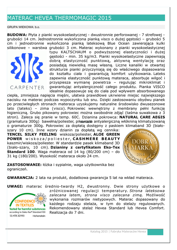 MATERAC HEVEA THERMOMAGIC 2015 GRUPA WIEKOWA: b.o. BUDOWA: Płyta z pianki wysokoelastycznej - dwustronnie perforowanej - 7 strefowej grubości 14 cm. Jednostronnie wykończona pianką visco o dużej gęstości – grubości 5 cm i jednostronnie wykończona pianką lateksową Blue Ocean zawierająca kulki silikonowe – warstwa grubości 3 cm. Materac wykonany z pianki wysokoelastycznej typu KALTSCHAUM o podwyższonej elastyczności i dużej gęstości - min. 35 kg/m3. Pianki wysokoelastyczne zapewniają dobrą elastyczność punktową, aktywną wentylację oraz posiadają niewielką masę własną. Liczne kanaliki w otwartej strukturze pianki przyczyniają się do właściwego dopasowania do kształtu ciała i gwarantują komfort użytkowania. Lateks zapewnia elastyczność punktową materaca, absorbuje wilgoć i przyspiesza wymianę powietrza – regulując mikroklimat i gwarantując antyalergiczność całego produktu. Pianka VISCO idealnie dopasowuje się do ciała pod wpływem absorbowanego ciepła, zmniejsza napięcia mięśni, ułatwia prawidłowe ukrwienie miejsc największego nacisku na materac podczas wypoczynku lub snu. Dzięki zastosowaniu obydwu pianek po przeciwległych stronach materaca uzyskujemy naturalne środowisko dwusezonowe lato (lateks) – zima (visco). Pokrowiec wewnętrzny z membrany pełni funkcję higieniczną. Grubo pikowany pokrowiec można swobodnie zdjąć (taśma suwakowa z 3 stron). Zaleca się pranie w temp. 60C. Dzianina pokrowca: NATURAL CARE AEGIS (gramatura 300g) bawełna/poliester, pikowana antyalergiczną włókniną klimatyzowaną o gramaturze 300g. Pokrowiec za dopłatą dostępny z paskiem klimaband 3D (białoszary 10 cm). Inne wzory dzianin za dopłatą wg cennika: TENCEL SILKY FEELING wiskoza/poliester, ALOE GREEN POWER w i s k o z a / p o l i e s t e r, C A S H M E R E B E A U T Y kaszmir/wiskoza/poliester. W standardzie pasek klimaband 3D (biało-szary, 10 cm). Dzianiny z certyfikatem Eko-Tex Standard 100. Waga materaca od 14 kg (80/200 cm) – do 31 kg (180/200). Wysokość materaca około 24 cm. ZASTOSOWANIE: łóżka i sypialnie, waga użytkownika bez ograniczeń. GWARANCJA: 2 lata na produkt, dodatkowa gwarancja 5 lat na wkład materaca. UWAGI: materac średnio-twardy H2, dwustronny. Dwie strony użytkowe o zróżnicowanej regulacji temperatury. Strona lateksowa zalecana latem, strona visco zalecana zimą. Możliwość wykonania rozmiarów nietypowych. Materac dopasowany do każdego rodzaju stelaża, w tym do stelaży regulowanych. Rekomendowany stelaż Hevea Standard lub Hevea Comfort. Realizacja do 7 dni. Katalog 2015 | Fabryka Materaców Hevea CENY DETALICZNE PLN oraz kody produktu: POKROWIEC AEGIS NATURAL CARE* Materac Materac Materac Materac Materac Materac Materac Fitness Fitness Fitness Fitness Fitness Fitness Fitness ThermoMagic ThermoMagic ThermoMagic ThermoMagic ThermoMagic ThermoMagic ThermoMagic 80/200 90/200 100/200 120/200 140/200 160/200 180/200 590160210234 590160210235 590160210236 590160210237 590160210238 590160210239 590160210240 1401 1507 2037 2037 2074 2369 2566 POKROWCE TENCEL SILKY FEELING, ALOE GREEN POWER, CASHMERE BEAUTY Materac Materac Materac Materac Materac Materac Materac Fitness Fitness Fitness Fitness Fitness Fitness Fitness ThermoMagic ThermoMagic ThermoMagic ThermoMagic ThermoMagic ThermoMagic ThermoMagic 80/200 90/200 100/200 120/200 140/200 160/200 180/200 590160210234 590160210235 590160210236 590160210237 590160210238 590160210239 590160210240 SF/AG/CB SF/AG/CB SF/AG/CB SF/AG/CB SF/AG/CB SF/AG/CB SF/AG/CB 1466 1572 2102 2217 2164 2459 2656 *cena pokrowca bez paska klimaband 3D Katalog 2015 | Fabryka Materaców Hevea Katalog 2015 | Fabryka Materaców Hevea