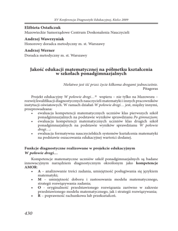 XV Konferencja Diagnostyki Edukacyjnej, Kielce 2009 Elżbieta Ostaficzuk Mazowieckie Samorządowe Centrum Doskonalenia Nauczycieli Andrzej Wawrzyniak Honorowy doradca metodyczny m. st. Warszawy Andrzej Werner Doradca metodyczny m. st. Warszawy Jakość edukacji matematycznej na półmetku kształcenia w szkołach ponadgimnazjalnych Niełatwo jest iść przez życie kilkoma drogami jednocześnie. Pitagoras Projekt edukacyjny W połowie drogi…® wspiera – nie tylko na Mazowszu – rozwój kwalifikacji diagnostycznych nauczycieli matematyki i innych pracowników instytucji oświatowych. W ramach działań W połowie drogi… jest, między innymi, przeprowadzana: • ewaluacja kompetencji matematycznych uczniów klas pierwszych szkół ponadgimnazjalnych na podstawie wyników sprawdzianu Po gimnazjum; • ewaluacja kompetencji matematycznych uczniów klas drugich szkół ponadgimnazjalnych na podstawie wyników sprawdzianu W połowie drogi…; • ewaluacja formatywna nauczycielskich systemów kształcenia matematyki na podstawie oszacowania edukacyjnej wartości dodanej. Funkcje diagnostyczne realizowane w projekcie edukacyjnym W połowie drogi… Kompetencje matematyczne uczniów szkół ponadgimnazjalnych są badane innowacyjnym narzędziem diagnostycznym określonym jako kompetencje AMOR: • A – analizowanie treści zadania, umiejętność posługiwania się językiem matematyki; • M – umiejętność doboru i zastosowania modelu matematycznego, strategii rozwiązywania zadania; • O - oryginalność przedstawionego rozwiązania zarówno w zakresie przedstawionego modelu matematycznego, jak i strategii rozwiązywania; • R – poprawność rachunkowa lub przekształceń. 430 Badania międzynarodowe i wzory zagraniczne w diagnostyce edukacyjnej Strategię holistycznego oceniania uczniowskich rozwiązań zadań wzmacnia również system automatycznego kodowania błędów uczniowskich polegających na: • nieznajomości definicji, pojęć, obiektów, nieumiejętności zapisania treści zadania w postaci opisu matematycznego; • nieznajomości własności, reguły, twierdzenia, metody rozwiązania; • pomyłkach w obliczeniach, przekształceniach algebraicznych, graficznych. Edukacyjna wartość dodana na półmetku kształcenia w szkołach ponadgimnazjalnych Model szacowania edukacyjnej wartości dodanej w projekcie edukacyjnym W połowie drogi… oznacza zarówno metodę, jak i wskaźnik liczbowy wyznaczony zgodnie z tą metodą. Model szacowania EWD opracowano w 2008 roku i po aktualizacji zastosowano go również w 2009 roku, gdy na podstawie wyników sprawdzianów 2007 – Po gimnazjum oraz 2009 – W połowie drogi…; wykorzystując metodę najmniejszych kwadratów, wyznaczono krzywą przewidywanego wyniku w postaci regresji liniowej. Tabela 1. Uczestnicy badania jakości kształcenia – wyniki sprawdzianów zastosowane do oszacowanie EWD 2009 Liczba uczniów 2350 Liczba klas 112 Liczba szkół 26 Rysunek 1. Regresja liniowa – przewidywania 2009 431 XV Konferencja Diagnostyki Edukacyjnej, Kielce 2009 Liczba uczniów Średnia A - 2007 Średnia A - 2009 EWD 13,7 St. VIII 8,04 St. VIII 30 24,2 St. IX Od. stand. EWD Przedz. ufności w sk. centyl. 2,76 90 94 Rysunek 2. Przykład wysokiej jakości systemu kształcenia - EWD dla klasy A Uczniowie klasy A (rys. 2.) uzyskali wysokie wyniki na sprawdzianie Po gimnazjum i również uzyskali wysokie – powyżej przewidywanych – wyniki ze sprawdzianu W połowie drogi. Do klasy A trafili po gimnazjum wyjątkowo dobrzy uczniowie. Wszyscy uzyskali na drugim sprawdzianie wyniki wyższe niż przewidywane, co pozwoliło na uzyskanie wysokiej wartości EWD. Na przykładzie klasy A widać, że szkoły przyjmujące najlepszych uczniów mogą również stymulować rozwój tych uczniów na bardzo wysokim poziomie. Uczniowie klasy B (rys. 3.) uzyskali wysokie wyniki na sprawdzianie Po gimnazjum, jednak ze sprawdzianu W połowie drogi… prawie wszyscy uzyskali wyniki poniżej przewidywanych, stąd niska wartość EWD. Nasuwa się wniosek, że szkoła, uspokojona wysokimi wynikami z pierwszego sprawdzianu, nie pracowała dość efektywnie z uczniami o znacznym potencjale. Liczba uczniów Średnia B - 2007 Średnia B - 2009 EWD 11,2 St. VII -4,82 St. III 11 9,2 St. V Od. stand. EWD Przedz. ufności w sk. centyl. 3,53 7 Rysunek 3. Przykład niskiej jakości systemu kształcenia - EWD dla klasy B 432 30 Badania międzynarodowe i wzory zagraniczne w diagnostyce edukacyjnej Liczba uczniów Średnia C - 2007 Średnia C - 2009 EWD 1,8 St. II -2,54 St. IV 21 3,3 St. III Od. stand. EWD Przedz. ufności w sk. centyl. 3,65 21 58 Rysunek 4. Przykład mało efektywnego systemu kształcenia - EWD dla klasy C Uczniowie klasy C (rys. 4.) uzyskali niskie wyniki na sprawdzianie Po gimnazjum i niskie – prawie wszyscy poniżej przewidywań – wyniki ze sprawdzianu W połowie drogi…, co spowodowało również dość niską wartość EWD. Szkoła nie potrafiła dostatecznie zmodyfikować systemu kształcenia po diagnozie kompetencji na podstawie wyników sprawdzianu początkowego. Podobny obraz w badaniach podłużnych EWD wystawiłby szkole najgorsze świadectwo jakości. Uczniowie klasy D (rys. 5.) uzyskali niskie wyniki na sprawdzianie Po gimnazjum i prawie wszyscy wysokie – powyżej przewidywań – wyniki ze sprawdzianu W połowie drogi. W ten sposób w klasie D osiągnięto wysoki poziom rozwoju uczniów, czyli jakości kształcenia, o czym informuje wysoka wartość wskaźnika EWD. Rozwój uczniów w klasie D jest sukcesem szkoły – świadczy o wysokiej efektywności systemu nauczania młodzieży zagrożonej uprzednio niepowodzeniami szkolnymi. Liczba uczniów Średnia D - 2007 Średnia D - 2009 18 2,4 St. III 9,9 St. VI EWD 3,6 St. VII Od. stand. EWD Przedz. ufności w sk. centyl. 4,72 62 87 Rysunek 5. Przykład wysokiej jakości systemu kształcenia - EWD dla klasy D 433 XV Konferencja Diagnostyki Edukacyjnej, Kielce 2009 Analiza diagnostyczna