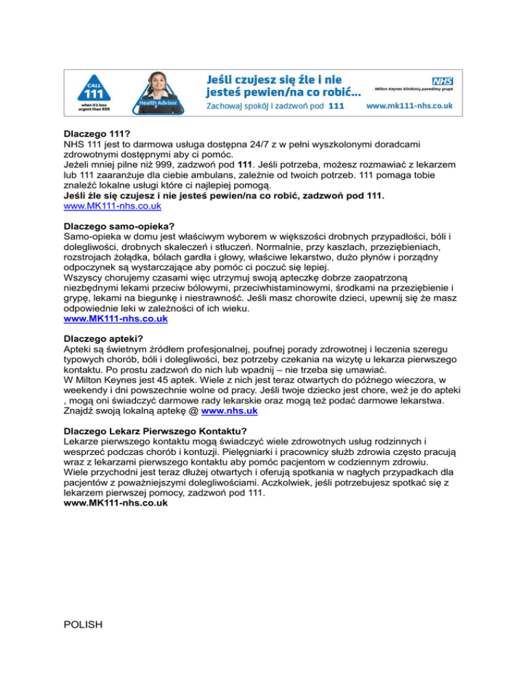 Dlaczego 111? NHS 111 jest to darmowa usługa dostępna 24/7 z w pełni wyszkolonymi doradcami zdrowotnymi dostępnymi aby ci pomóc. Jeżeli mniej pilne niż 999, zadzwoń pod 111. Jeśli potrzeba, możesz rozmawiać z lekarzem lub 111 zaaranżuje dla ciebie ambulans, zależnie od twoich potrzeb. 111 pomaga tobie znaleźć lokalne usługi które ci najlepiej pomogą. Jeśli źle się czujesz i nie jesteś pewien/na co robić, zadzwoń pod 111. www.MK111-nhs.co.uk Dlaczego samo-opieka? Samo-opieka w domu jest właściwym wyborem w większości drobnych przypadłości, bóli i dolegliwości, drobnych skaleczeń i stłuczeń. Normalnie, przy kaszlach, przeziębieniach, rozstrojach żołądka, bólach gardła i głowy, właściwe lekarstwo, dużo płynów i porządny odpoczynek są wystarczające aby pomóc ci poczuć się lepiej. Wszyscy chorujemy czasami więc utrzymuj swoją apteczkę dobrze zaopatrzoną niezbędnymi lekami przeciw bólowymi, przeciwhistaminowymi, środkami na przeziębienie i grypę, lekami na biegunkę i niestrawność. Jeśli masz chorowite dzieci, upewnij się że masz odpowiednie leki w zależności of ich wieku. www.MK111-nhs.co.uk Dlaczego apteki? Apteki są świetnym źródłem profesjonalnej, poufnej porady zdrowotnej i leczenia szeregu typowych chorób, bóli i dolegliwości, bez potrzeby czekania na wizytę u lekarza pierwszego kontaktu. Po prostu zadzwoń do nich lub wpadnij – nie trzeba się umawiać. W Milton Keynes jest 45 aptek. Wiele z nich jest teraz otwartych do późnego wieczora, w weekendy i dni powszechnie wolne od pracy. Jeśli twoje dziecko jest chore, weź je do apteki , mogą oni świadczyć darmowe rady lekarskie oraz mogą też podać darmowe lekarstwa. Znajdź swoją lokalną aptekę @ www.nhs.uk Dlaczego Lekarz Pierwszego Kontaktu? Lekarze pierwszego kontaktu mogą świadczyć wiele zdrowotnych usług rodzinnych i wesprzeć podczas chorób i kontuzji. Pielęgniarki i pracownicy służb zdrowia często pracują wraz z lekarzami pierwszego kontaktu aby pomóc pacjentom w codziennym zdrowiu. Wiele przychodni jest teraz dłużej otwartych i oferują spotkania w nagłych przypadkach dla pacjentów z poważniejszymi dolegliwościami. Aczkolwiek, jeśli potrzebujesz spotkać się z lekarzem pierwszej pomocy, zadzwoń pod 111. www.MK111-nhs.co.uk POLISH