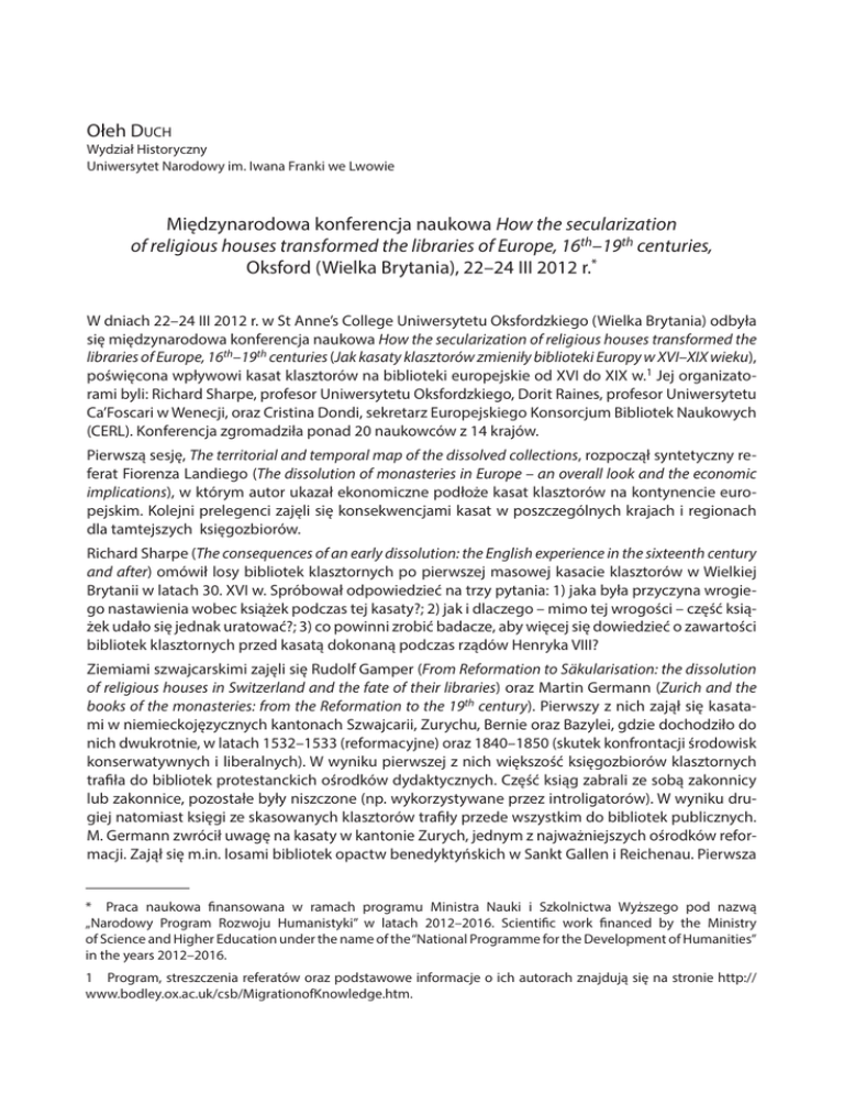 Ołeh Duch Wydział Historyczny Uniwersytet Narodowy im. Iwana Franki we Lwowie Międzynarodowa konferencja naukowa How the secularization of religious houses transformed the libraries of Europe, 16th–19th centuries, Oksford (Wielka Brytania), 22–24 III 2012 r.* W dniach 22–24 III 2012 r. w St Anne’s College Uniwersytetu Oksfordzkiego (Wielka Brytania) odbyła się międzynarodowa konferencja naukowa How the secularization of religious houses transformed the libraries of Europe, 16th–19th centuries (Jak kasaty klasztorów zmieniły biblioteki Europy w XVI–XIX wieku), poświęcona wpływowi kasat klasztorów na biblioteki europejskie od XVI do XIX w.1 Jej organizatorami byli: Richard Sharpe, profesor Uniwersytetu Oksfordzkiego, Dorit Raines, profesor Uniwersytetu Ca’Foscari w Wenecji, oraz Cristina Dondi, sekretarz Europejskiego Konsorcjum Bibliotek Naukowych (CERL). Konferencja zgromadziła ponad 20 naukowców z 14 krajów. Pierwszą sesję, The territorial and temporal map of the dissolved collections, rozpoczął syntetyczny referat Fiorenza Landiego (The dissolution of monasteries in Europe – an overall look and the economic implications), w którym autor ukazał ekonomiczne podłoże kasat klasztorów na kontynencie europejskim. Kolejni prelegenci zajęli się konsekwencjami kasat w poszczególnych krajach i regionach dla tamtejszych księgozbiorów. Richard Sharpe (The consequences of an early dissolution: the English experience in the sixteenth century and after) omówił losy bibliotek klasztornych po pierwszej masowej kasacie klasztorów w Wielkiej Brytanii w latach 30. XVI w. Spróbował odpowiedzieć na trzy pytania: 1) jaka była przyczyna wrogiego nastawienia wobec książek podczas tej kasaty?; 2) jak i dlaczego – mimo tej wrogości – część książek udało się jednak uratować?; 3) co powinni zrobić badacze, aby więcej się dowiedzieć o zawartości bibliotek klasztornych przed kasatą dokonaną podczas rządów Henryka VIII? Ziemiami szwajcarskimi zajęli się Rudolf Gamper (From Reformation to Säkularisation: the dissolution of religious houses in Switzerland and the fate of their libraries) oraz Martin Germann (Zurich and the books of the monasteries: from the Reformation to the 19th century). Pierwszy z nich zajął się kasatami w niemieckojęzycznych kantonach Szwajcarii, Zurychu, Bernie oraz Bazylei, gdzie dochodziło do nich dwukrotnie, w latach 1532–1533 (reformacyjne) oraz 1840–1850 (skutek konfrontacji środowisk konserwatywnych i liberalnych). W wyniku pierwszej z nich większość księgozbiorów klasztornych trafiła do bibliotek protestanckich ośrodków dydaktycznych. Część ksiąg zabrali ze sobą zakonnicy lub zakonnice, pozostałe były niszczone (np. wykorzystywane przez introligatorów). W wyniku drugiej natomiast księgi ze skasowanych klasztorów trafiły przede wszystkim do bibliotek publicznych. M. Germann zwrócił uwagę na kasaty w kantonie Zurych, jednym z najważniejszych ośrodków reformacji. Zajął się m.in. losami bibliotek opactw benedyktyńskich w Sankt Gallen i Reichenau. Pierwsza * Praca naukowa finansowana w ramach programu Ministra Nauki i Szkolnictwa Wyższego pod nazwą „Narodowy Program Rozwoju Humanistyki” w latach 2012–2016. Scientific work financed by the Ministry of Science and Higher Education under the name of the “National Programme for the Development of Humanities” in the years 2012–2016. 1 Program, streszczenia referatów oraz podstawowe informacje o ich autorach znajdują się na stronie http:// www.bodley.ox.ac.uk/csb/MigrationofKnowledge.htm. 330 Kronika naukowa po bitwie pod Villmergen (1712) została obrabowana przez protestantów, a znaczna jej część trafiła do Zurychu. Dopiero w 2006 r. księgozbiór ten powrócił do Sankt Gallen. Druga po kasacie opactwa w 1862 r. w większości trafiła do Biblioteki Państwowej w Zurychu (obecnie Głównej). María Luisa López-Vidriero Abelló (Dissolved monastic collections in Spain from Philip II’s suppression to the 19th-century „Desamortización”) szczególną uwagę zwróciła na ustawodawstwo antykościelne Juana Álvareza Mendizábala (1835–1836), które przyczyniło się do kasaty licznych klasztorów hiszpańskich. Tuomas Heikkilä (The Fate of the Medieval Libraries in the Swedish Realm during the Reformation) podkreślił tragiczny wpływ reformacji na losy średniowiecznych księgozbiorów w Szwecji. W wyniku kasaty klasztorów ich księgi liturgiczne straciły praktyczne zastosowanie, dlatego wykorzystywane były do różnych celów, m.in. do oprawy nowych książek, głównie finansowych. Jego zdaniem w większości wypadków przyczyny zniszczeń miały charakter nie tyle dogmatyczny, ile praktyczny. Udało mu się odnaleźć w archiwach oraz bibliotekach Szwecji i Finlandii ponad 7000 średniowiecznych rękopisów, większość w postaci fragmentów pergaminowych, a nie kodeksów. Jeffrey Garrett (The expropriation of monastic libraries in Central Europe, 1773–1814) skupił uwagę na niemieckojęzycznej części środkowej Europy, przedstawiając losy bibliotek klasztornych w Austrii oraz w południowych Niemczech, od likwidacji zakonu jezuitów w 1773 r. do kasat w Bawarii na początku XIX w. Według niego konfiskat bibliotek klasztornych w okresie reform józefińskich nie da się określić pojęciem „kasaty”; są one raczej podobne do tradycyjnych reform w średniowiecznym znaczeniu renovatio. Decydujący wpływ na losy europejskich bibliotek klasztornych, szczególnie na terenie Niemiec południowych, miała natomiast rewolucja francuska. Konieczność uporządkowania nagromadzonych po kasatach klasztorów ksiąg stymulowała rozwój bibliotekarstwa. Znaczną rolę odegrał tu m.in. były benedyktyn Martin Schrettinger, bibliotekarz Bayerische Staatsbibliothek. Drugą sesję, State policy toward book collections, rozpoczęło wystąpienie jednej z organizatorów konferencji, Dorit Raines, któ