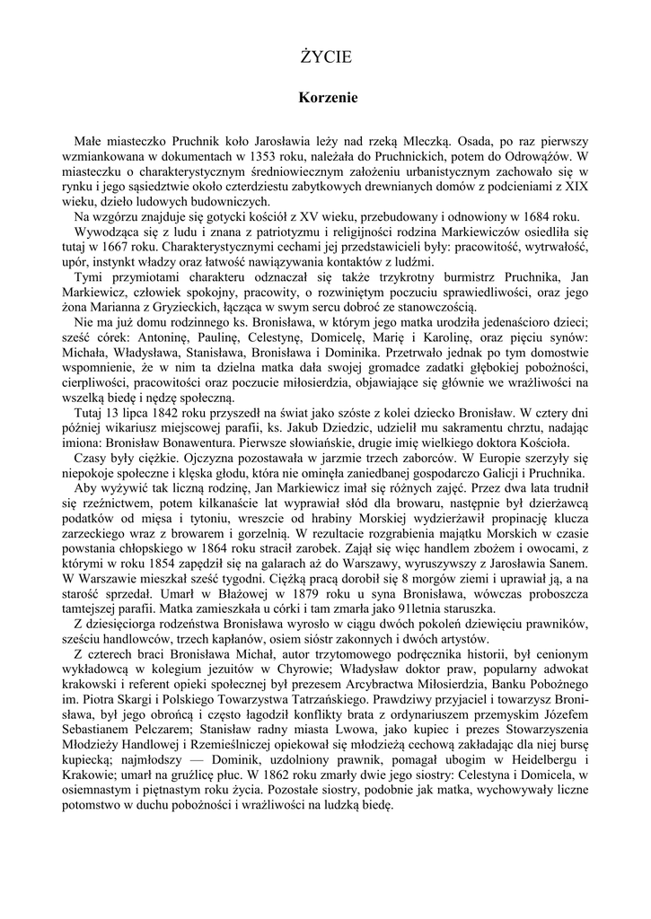 ŻYCIE Korzenie Małe miasteczko Pruchnik koło Jarosławia leży nad rzeką Mleczką. Osada, po raz pierwszy wzmiankowana w dokumentach w 1353 roku, należała do Pruchnickich, potem do Odrowąźów. W miasteczku o charakterystycznym średniowiecznym założeniu urbanistycznym zachowało się w rynku i jego sąsiedztwie około czterdziestu zabytkowych drewnianych domów z podcieniami z XIX wieku, dzieło ludowych budowniczych. Na wzgórzu znajduje się gotycki kościół z XV wieku, przebudowany i odnowiony w 1684 roku. Wywodząca się z ludu i znana z patriotyzmu i religijności rodzina Markiewiczów osiedliła się tutaj w 1667 roku. Charakterystycznymi cechami jej przedstawicieli były: pracowitość, wytrwałość, upór, instynkt władzy oraz łatwość nawiązywania kontaktów z ludźmi. Tymi przymiotami charakteru odznaczał się także trzykrotny burmistrz Pruchnika, Jan Markiewicz, człowiek spokojny, pracowity, o rozwiniętym poczuciu sprawiedliwości, oraz jego żona Marianna z Gryzieckich, łącząca w swym sercu dobroć ze stanowczością. Nie ma już domu rodzinnego ks. Bronisława, w którym jego matka urodziła jedenaścioro dzieci; sześć córek: Antoninę, Paulinę, Celestynę, Domicelę, Marię i Karolinę, oraz pięciu synów: Michała, Władysława, Stanisława, Bronisława i Dominika. Przetrwało jednak po tym domostwie wspomnienie, że w nim ta dzielna matka dała swojej gromadce zadatki głębokiej pobożności, cierpliwości, pracowitości oraz poczucie miłosierdzia, objawiające się głównie we wrażliwości na wszelką biedę i nędzę społeczną. Tutaj 13 lipca 1842 roku przyszedł na świat jako szóste z kolei dziecko Bronisław. W cztery dni później wikariusz miejscowej parafii, ks. Jakub Dziedzic, udzielił mu sakramentu chrztu, nadając imiona: Bronisław Bonawentura. Pierwsze słowiańskie, drugie imię wielkiego doktora Kościoła. Czasy były ciężkie. Ojczyzna pozostawała w jarzmie trzech zaborców. W Europie szerzyły się niepokoje społeczne i klęska głodu, która nie ominęła zaniedbanej gospodarczo Galicji i Pruchnika. Aby wyżywić tak liczną rodzinę, Jan Markiewicz imał się różnych zajęć. Przez dwa lata trudnił się rzeźnictwem, potem kilkanaście lat wyprawiał słód dla browaru, następnie był dzierżawcą podatków od mięsa i tytoniu, wreszcie od hrabiny Morskiej wydzierżawił propinację klucza zarzeckiego wraz z browarem i gorzelnią. W rezultacie rozgrabienia majątku Morskich w czasie powstania chłopskiego w 1864 roku stracił zarobek. Zajął się więc handlem zbożem i owocami, z którymi w roku 1854 zapędził się na galarach aż do Warszawy, wyruszywszy z Jarosławia Sanem. W Warszawie mieszkał sześć tygodni. Ciężką pracą dorobił się 8 morgów ziemi i uprawiał ją, a na starość sprzedał. Umarł w Błażowej w 1879 roku u syna Bronisława, wówczas proboszcza tamtejszej parafii. Matka zamieszkała u córki i tam zmarła jako 91letnia staruszka. Z dziesięciorga rodzeństwa Bronisława wyrosło w ciągu dwóch pokoleń dziewięciu prawników, sześciu handlowców, trzech kapłanów, osiem sióstr zakonnych i dwóch artystów. Z czterech braci Bronisława Michał, autor trzytomowego podręcznika historii, był cenionym wykładowcą w kolegium jezuitów w Chyrowie; Władysław doktor praw, popularny adwokat krakowski i referent opieki społecznej był prezesem Arcybractwa Miłosierdzia, Banku Pobożnego im. Piotra Skargi i Polskiego Towarzystwa Tatrzańskiego. Prawdziwy przyjaciel i towarzysz Bronisława, był jego obrońcą i często łagodził konflikty brata z ordynariuszem przemyskim Józefem Sebastianem Pelczarem; Stanisław radny miasta Lwowa, jako kupiec i prezes Stowarzyszenia Młodzieży Handlowej i Rzemieślniczej opiekował się młodzieżą cechową zakładając dla niej bursę kupiecką; najmłodszy — Dominik, uzdolniony prawnik, pomagał ubogim w Heidelbergu i Krakowie; umarł na gruźlicę płuc. W 1862 roku zmarły dwie jego siostry: Celestyna i Domicela, w osiemnastym i piętnastym roku życia. Pozostałe siostry, podobnie jak matka, wychowywały liczne potomstwo w duchu pobożności i wrażliwości na ludzką biedę. Dzieciństwo i młodość Nic też dziwnego, że wyrastający w takiej atmosferze Bronisław, człowiek o umyśle czynnym, praktycznym, obdarzony bystrym zmysłem obserwacji, starał się dorównać rodzeństwu. W istocie rzeczy jeśli chodzi o oddanie się w służbę Bogu i ludziom nawet je przerósł. Najpierw uczył się w szkole elementarnej w Pruchniku, potem uczęszczał do gimnazjum w Przemyślu. Mieszkał wspólnie ze starszymi braćmi na stancji u profesora Leona Królikowskiego, gdzie dorabiał korepetycjami ucząc bogatszych kolegów, biedniejszym pomagał bezinteresownie. Od młodości wykazywał szerokie zainteresowania. Być może, że wpływ niektórych nauczycieli, uleganie tendencjom światłego absolutyzmu i lektura dzieł Kanta, Pichtego, Schellinga wywołały w czasach gimnazjalnych Bronisława silny kryzys wiary, oceniany zresztą przez samego Markiewicza w różnych okresach życia w różny sposób: raz jako utrata wiary, ciemności wewnętrzne umysłu, szamotanie się; innym razem jako odstępstwo od praktyk religijnych w kilku dłuższych lub krótszych okresach. W pewnym miejscu wspomina, że niepokój ten trwał półtora roku. Ale w zasadniczym dokumencie, zeznaniu do procesu ks. Jana Bosco, wspomina, że był to okres od 1857 do 8 grudnia 1863 roku. Z kryzysu wiary wyszedł młody Markiewicz zwycięsko pod wpływem lektury pisarzy polskich, zwłaszcza Józefa Korzeniowskiego. Ów powieściopisarz, dramaturg i nowelista, a zarazem pedagog i minister oświaty w rządzie Wielopolskiego, przedstawia konsekwencje określonego systemu wychowania. Uważa, że człowiek, od dziecka wychowywany w marzeniach, nie dochodzi do niczego: hoduje bowiem w sobie nierealność. Tylko ludzie pracy i mający ukształtowany charakter zdolni są do wielki