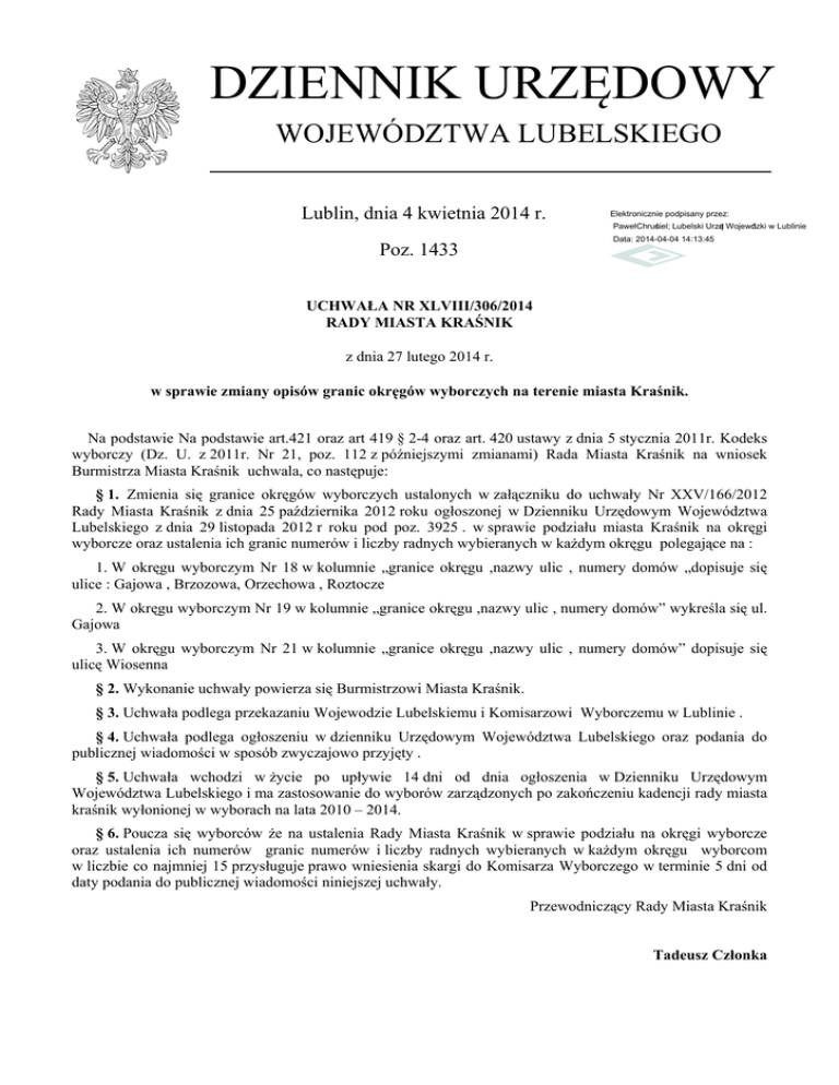 DZIENNIK URZĘDOWY WOJEWÓDZTWA LUBELSKIEGO Lublin, dnia 4 kwietnia 2014 r. Elektronicznie podpisany przez: Paweł Chruściel; Lubelski Urząd Wojewódzki w Lublinie Data: 2014-04-04 14:13:45 Poz. 1433 UCHWAŁA NR XLVIII/306/2014 RADY MIASTA KRAŚNIK z dnia 27 lutego 2014 r. w sprawie zmiany opisów granic okręgów wyborczych na terenie miasta Kraśnik. Na podstawie Na podstawie art.421 oraz art 419 § 2-4 oraz art. 420 ustawy z dnia 5 stycznia 2011r. Kodeks wyborczy (Dz. U. z 2011r. Nr 21, poz. 112 z późniejszymi zmianami) Rada Miasta Kraśnik na wniosek Burmistrza Miasta Kraśnik uchwala, co następuje: § 1. Zmienia się granice okręgów wyborczych ustalonych w załączniku do uchwały Nr XXV/166/2012 Rady Miasta Kraśnik z dnia 25 października 2012 roku ogłoszonej w Dzienniku Urzędowym Województwa Lubelskiego z dnia 29 listopada 2012 r roku pod poz. 3925 . w sprawie podziału miasta Kraśnik na okręgi wyborcze oraz ustalenia ich granic numerów i liczby radnych wybieranych w każdym okręgu polegające na : 1. W okręgu wyborczym Nr 18 w kolumnie „granice okręgu ,nazwy ulic , numery domów „dopisuje się ulice : Gajowa , Brzozowa, Orzechowa , Roztocze 2. W okręgu wyborczym Nr 19 w kolumnie „granice okręgu ,nazwy ulic , numery domów” wykreśla się ul. Gajowa 3. W okręgu wyborczym Nr 21 w kolumnie „granice okręgu ,nazwy ulic , numery domów” dopisuje się ulicę Wiosenna § 2. Wykonanie uchwały powierza się Burmistrzowi Miasta Kraśnik. § 3. Uchwała podlega przekazaniu Wojewodzie Lubelskiemu i Komisarzowi Wyborczemu w Lublinie . § 4. Uchwała podlega ogłoszeniu w dzienniku Urzędowym Województwa Lubelskiego oraz podania do publicznej wiadomości w sposób zwyczajowo przyjęty . § 5. Uchwała wchodzi w życie po upływie 14 dni od dnia ogłoszenia w Dzienniku Urzędowym Województwa Lubelskiego i ma zastosowanie do wyborów zarządzonych po zakończeniu kadencji rady miasta kraśnik wyłonionej w wyborach na lata 2010 – 2014. § 6. Poucza się wyborców że na ustalenia Rady Miasta Kraśnik w sprawie podziału na okręgi wyborcze oraz ustalenia ich numerów granic numerów i liczby radnych wybieranych w każdym okręgu wyborcom w liczbie co najmniej 15 przysługuje prawo wniesienia skargi do Komisarza Wyborczego w terminie 5 dni od daty podania do publicznej wiadomości niniejszej uchwały. Przewodniczący Rady Miasta Kraśnik Tadeusz Członka