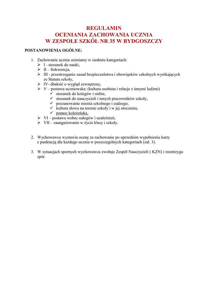 REGULAMIN OCENIANIA ZACHOWANIA UCZNIA W ZESPOLE SZKÓŁ NR 35 W BYDGOSZCZY POSTANOWIENIA OGÓLNE: 1. Zachowanie ucznia oceniamy w siedmiu kategoriach: I - stosunek do nauki, II – frekwencja, III - przestrzeganie zasad bezpieczeństwa i obowiązków szkolnych wynikających ze Statutu szkoły, IV- dbałość o wygląd zewnętrzny, V – postawa uczniowska: (kultura osobista i relacje z innymi ludźmi) stosunek do kolegów i siebie, stosunek do nauczycieli i innych pracowników szkoły, poszanowanie mienia szkolnego i cudzego, kultura słowa na terenie szkoły i w jej otoczeniu, pomoc koleżeńska, VI – postawa wobec nałogów i uzależnień, VII – zaangażowanie w życie klasy i szkoły. 2. Wychowawca wystawia ocenę za zachowanie po uprzednim wypełnieniu karty z punktacją dla każdego ucznia w poszczególnych kategoriach (zał. 3). 3. W sytuacjach spornych wychowawca zwołuje Zespół Nauczycieli ( KZN) i rozstrzyga spór. I. STOSUNEK DO NAUKI Nauczyciele uczący w danej klasie otrzymują od wychowawcy kartę ( zał. nr 1) w ramach, której dokonują indywidualnej oceny punktowej każdego ucznia w tym zakresie. Wychowawca na tej podstawie wylicza średnią( zał. nr 2), która jest podstawą do przyznania uczniowi odpowiedniej ilości punktów w tej kategorii. 4pkt. 3pkt. 2pkt. 1pkt. 0pkt. II. 4pkt. 3pkt. 2pkt. 1pkt. 0pkt. III. 4pkt. 3pkt. 2pkt. 1pkt. 0pkt. Uczeń jest zawsze przygotowany do lekcji ( ma odrobione zadanie domowe, aktywnie uczestniczy w lekcji), wywiązuje się z powierzonych mu zadań dodatkowych, sam podejmuje dodatkowe obowiązki. Uczeń jest przygotowany do lekcji, zwykle ma odrobione zadanie domowe i dotrzymuje ustalonych terminów, czasem samodzielnie zgłasza się do danego zadania. Uczeń rzadko przygotowuje się do lekcji, ale stara się uzupełnić wiedzę, zdarza się, że nie dotrzymuje terminów, niechętnie lub tylko częściowo wykonuje powierzone mu zadania i prace ( w tym zad. domowe) Uczeń bardzo rzadko przygotowuje się do lekcji, nie jest zainteresowany zdobywaniem wiedzy, nie dotrzymuje terminów, nie wywiązuje się z powierzonych mu zadań, nie odrabia zadań domowych. Uczeń nie uczy się , nie interesują go zajęcia szkolne, nie dotrzymuje terminów, nie podejmuje żadnych zadań dodatkowych, unika lekcji z danego przedmiotu. FREKWENCJA Uczeń nie ma nieusprawiedliwionych nieobecności i spóźnień. Uczeń ma 2 godziny nieusprawiedliwione lub 3 spóźnienia. Uczeń ma od 3- 6 nieusprawiedliwionych godzin lub od 4 –6 spóźnień. Uczeń ma od 7 -10 nieusprawiedliwionych godzin lub od 7-10 spóźnień. Uczeń ma powyżej 10 godzin nieusprawiedliwionych lub powyżej 10 spóźnień. PRZESTRZEGANIE ZASAD BEZPIECZEŃSTWA I OBOWIĄZKÓW WYNIKAJĄCYCH ZE STATUTU SZKOŁY Uczeń przestrzega zasad bezpieczeństwa i prawidłowo reaguje na występujące zagrożenia podczas lekcji i na terenie szkoły. Uczeń nie opuszcza terenu szkoły w czasie przerw, nie łamie zakazu używania telef. komórkowego w czasie lekcji. Zdarzyło się, że uczeń 1 raz nieumyślnie spowodował zagrożenie bezpieczeństwa lub zlekceważył takie zagrożenie, ale zareagował na zwróconą uwagę i wyraził chęć poprawy. Uczeń raz opuścił teren szkoły w czasie przerw, co zostało potwierdzone wpisem do klasowego zeszytu uwag. Uczeń 2 razy złamał zakaz używania telef. komórkowego w czasie lekcji z każdorazowym wpisem do zeszytu klasowego. Uczniowi wpisano 2 uwagi o zachowaniu zagrażającym bezpieczeństwu jego lub innych na terenie szkoły, podczas przerw i zajęć szkolnych. Uczeń wychodzi poza teren szkoły w czasie przerw i ma z tego powodu od 2 – 3 pisemnych uwag w zeszycie klasowym. Uczeń od 2-3 razy złamał zakaz używania telef. komórkowego w czasie lekcji z każdorazowym wpisem do klasowego zeszytu . Uczniowi wpisano 3 uwagi o zachowaniu zagrażającym bezpieczeństwu jego lub innych osób przebywających na terenie szkoły. Uczeń wychodzi poza teren szkoły w czasie przerw i ma z tego powodu 4 pisemne uwagi w zeszycie klasowym. Uczeń 4-krotnie złamał zakaz używania telefonu komórkowego w czasie lekcji, co odnotowano w zeszycie klasowym . Bardzo często swoim zachowaniem zagraża bezpieczeństwu na terenie szkoły potwierdzone uwagami pisemnymi. Ma powyżej 4 pisemnych uwag o opuszczaniu terenu szkoły w czasie przerw, nagminnie łamie zakaz używania telef. komórkowego w czasie lekcji potwierdzone wpisami do zeszytu klasowego. IV. 4pkt. 3pkt. 2pkt. 1pkt. 0pkt. V. 4pkt. 3pkt. 2pkt. 1pkt. 0pkt. WYGLĄD ZEWNĘTRZNY-obowiązuje regulamin stroju szkolnego (zał. 5) Uczennica: nie stosuje makijażu, przesadnej biżuterii (kolczyki tylko w uszach), nie maluje paznokci, nie farbuje włosów. Ubiera się stosownie do regulaminu szkoły( ubiór codzienny, ubiór galowy) Uczeń: Nie farbuje włosów, nie nosi na terenie szkoły żadnych nakryć głowy ( kaptur, czapka) Ubiera się stosownie do regulaminu szkoły ( ubiór codzienny, ubiór galowy) Uczeń/uczennica dba o swój wygląd zewnętrzny, nie maluje się, nie farbuje włosów, nie zakłada przesadnej biżuterii, kolczyki tylko w uszach, nie nosi nakrycia głowy na terenie szkoły. Ubiera się stosownie do regulaminu. Uczniowi/Uczennicy od 1 – 2 razy w semestrze odnotowano w zeszycie klasowym używanie wyzywającego makijażu i noszenie przesadnej biżuterii. (włosy, paznokcie to dwie oddzielne uwagi), noszenia czapki na terenie szkoły. Uwagi dotyczące stosownego ubioru rozpatrywane są według regulaminu szkoły. Uczniowi/Uczennicy od 3-4 razy w semestrze odnotowano w zeszycie klasowym używanie wyzywającego makijażu i noszenie przesadnej biżuterii. (włosy, paznokcie to dwie oddzielne uwagi), noszenia czapki na terenie szkoły. Uwagi dotyczące stosownego ubioru rozpatrywane są według regulaminu szkoły. Uczniowi/Uczennicy 5 razy w semestrze odnotowano w zeszycie klasowym używanie wyzywającego makijażu i noszenie przesadnej biżuterii. (włosy, paznokcie to dwie oddzielne uwagi) 