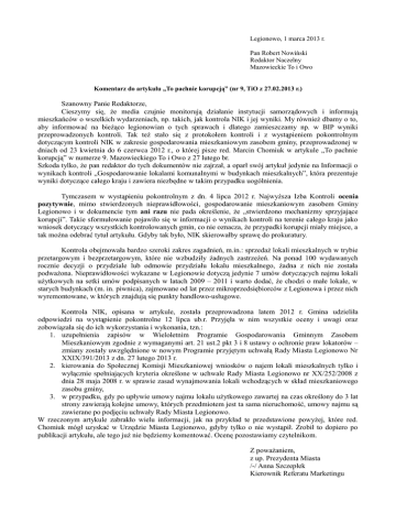 Legionowo, 1 marca 2013 r. Pan Robert Nowiński Redaktor Naczelny Mazowieckie To i Owo Komentarz do artykułu „To pachnie korupcją” (nr 9, TiO z 27.02.2013 r.) Szanowny Panie Redaktorze, Cieszymy się, że media czujnie monitorują działanie instytucji samorządowych i informują mieszkańców o wszelkich wydarzeniach, np. takich, jak kontrola NIK i jej wyniki. My również dbamy o to, aby informować na bieżąco legionowian o tych sprawach i dlatego zamieszczamy np. w BIP wyniki przeprowadzonych kontroli. Tak też stało się z protokołem kontroli i z wystąpieniem pokontrolnym dotyczącym kontroli NIK w zakresie gospodarowania mieszkaniowym zasobem gminy, przeprowadzonej w dniach od 23 kwietnia do 6 czerwca 2012 r., o której pisze red. Marcin Chomiuk w artykule „To pachnie korupcją” w numerze 9. Mazowieckiego To i Owo z 27 lutego br. Szkoda tylko, że pan redaktor do tych dokumentów nie zajrzał, a oparł swój artykuł jedynie na Informacji o wynikach kontroli „Gospodarowanie lokalami komunalnymi w budynkach mieszkalnych”, która prezentuje wyniki dotyczące całego kraju i zawiera niezbędne w takim przypadku uogólnienia. Tymczasem w wystąpieniu pokontrolnym z dn. 4 lipca 2012 r. Najwyższa Izba Kontroli ocenia pozytywnie, mimo stwierdzonych nieprawidłowości, gospodarowanie mieszkaniowym zasobem Gminy Legionowo i w dokumencie tym ani razu nie pada określenie, że „stwierdzono mechanizmy sprzyjające korupcji”. Takie sformułowanie pojawiło się w informacji o wynikach kontroli na terenie całego kraju jako wniosek dotyczący wszystkich kontrolowanych gmin, co nie oznacza, że przypadki korupcji miały miejsce, a tak można odebrać tytuł artykułu. Gdyby tak było, NIK skierowałby sprawę do prokuratury. Kontrola obejmowała bardzo szeroki zakres zagadnień, m.in.: sprzedaż lokali mieszkalnych w trybie przetargowym i bezprzetargowym, które nie wzbudziły żadnych zastrzeżeń. Na ponad 100 wydawanych rocznie decyzji o przydziale lub odmowie przydziału lokalu mieszkalnego, żadna z nich nie została podważona. Nieprawidłowości wykazane w Legionowie dotyczą jedynie 7 umów dotyczących najmu lokali użytkowych na setki umów podpisanych w latach 2009 – 2011 i warto dodać, że chodzi o małe lokale, w starych budynkach (m. in. piwnica), zajmowane od lat przez mikroprzedsiębiorców z Legionowa i przez nich wyremontowane, w których znajdują się punkty handlowo-usługowe. Kontrola NIK, opisana w artykule, została przeprowadzona latem 2012 r. Gmina udzieliła odpowiedzi na wystąpienie pokontrolne 12 lipca ub.r. Przyjęła w nim wszystkie oceny i uwagi oraz zobowiązała się do ich wykorzystania i wykonania, tzn.: 1. uzupełnienia zapisów w Wieloletnim Programie Gospodarowania Gminnym Zasobem Mieszkaniowym zgodnie z wymaganymi art. 21 ust.2 pkt 3 i 8 ustawy o ochronie praw lokatorów – zmiany zostały uwzględnione w nowym Programie przyjętym uchwałą Rady Miasta Legionowo Nr XXIX/391/2013 z dn. 27 lutego 2013 r. 2. kierowania do Społecznej Komisji Mieszkaniowej wniosków o najem lokali mieszkalnych tylko i wyłącznie spełniających kryteria określone w uchwale Rady Miasta Legionowo nr XX/252/2008 z dnia 28 maja 2008 r. w sprawie zasad wynajmowania lokali wchodzących w skład mieszkaniowego zasobu gminy, 3. w przypadku, gdy po upływie umowy najmu lokalu użytkowego zawartej na czas określony do 3 lat strony zawierają kolejne umowy, których przedmiotem jest ta sama nieruchomość, umowy najmu są zawierane po podjęciu uchwały Rady Miasta Legionowo. W rzeczonym artykule zabrakło wielu informacji, jak na przykład te przedstawione powyżej, które red. Chomiuk mógł uzyskać w Urzędzie Miasta Legionowo, gdyby tylko o nie wystąpił. Zrobił to dopiero po publikacji artykułu, ale tego już nie będziemy komentować. Ocenę pozostawiamy czytelnikom. Z poważaniem, z up. Prezydenta Miasta /-/ Anna Szczepłek Kierownik Referatu Marketingu