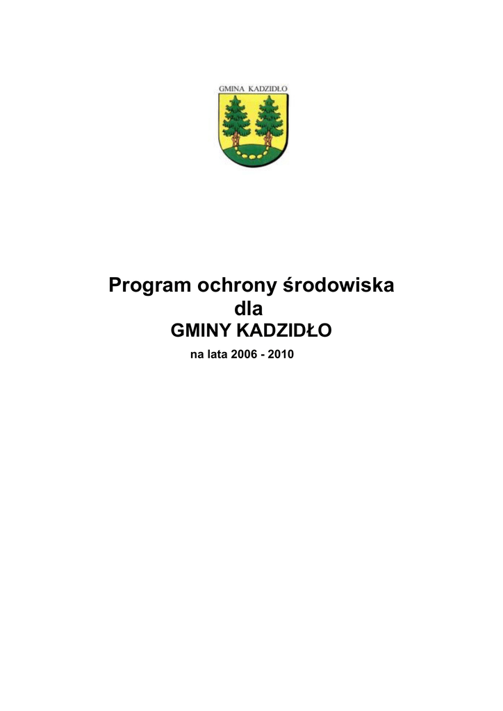 Program ochrony środowiska dla GMINY KADZIDŁO na lata 2006 - 2010 SPIS TREŚCI PROGRAM OCHRONY ŚRODOWISKA..................................................1 DLA .........................................................................................................1 GMINY KADZIDŁO..................................................................................1 NA LATA 2006 - 2010 ...........................................................................1 1.WSTĘP..................................................................................................5 1.1 WPROWADZENIE....................................................................................5 1.2 PODSTAWA OPRACOWANIA........................................................................5 1.3 GŁÓWNE ZAŁOŻENIA PROGRAMU.................................................................5 1.4 CEL PROGRAMU.....................................................................................6 1.5 ZAWARTOŚĆ PROGRAMU...........................................................................6 2.CHARAKTERYSTYKA I OCENA AKTUALNEGO STANU ŚRODOWISKA, ZASOBÓW NATURALNYCH ORAZ TECHNICZNEJ INFRASTRUKTURY OCHRONY ŚRODOWISKA....7 2.1 KRAJOBRAZ, KLIMAT I FORMY UŻYTKOWANIA TERENU .......................................7 2.2 ZASOBY I RÓŻNORODNOŚĆ PRZYRODNICZA OBSZARU GMINY...............................9 2.2.1 Zasoby wodne..........................................................................9 2.2.2 Zasoby leśne..........................................................................10 2.2.3 Zasoby surowców naturalnych...............................................10 2.2.4 Krajobraz naturalny................................................................11 2.3 TECHNICZNA INFRASTRUKTURA OCHRONY ŚRODOWISKA...................................14 2.3.1 Zaopatrzenie w wodę.............................................................14 2.3.2 Kanalizacja i oczyszczanie ścieków.......................................15 2.3.3 Składowiska odpadów stałych i ich utylizacja........................15 2.3.4 Urządzenia ochrony powietrza...............................................16 3. OCENA AKTUALNEGO STANU ŚRODOWISKA I ZASOBÓW NATURALNYCH ORAZ ZAGROŻENIA ŚRODOWISKA PRZYRODNICZEGO GMINY............................................................17 3.1ZANIECZYSZCZENIA WÓD.........................................................................17 3.1.1 Zanieczyszczenia wód pochodzące z rolnictwa.......................17 3.2ZANIECZYSZCZENIA POWIERZCHNI ZIEMI.......................................................19 3.3ZANIECZYSZCZENIA POWIETRZA.................................................................19 3.4INNE ZAGROŻENIA ŚRODOWISKA.................................................................20 3.4.1 Hałas........................................................................................20 3.4.2 Emitowanie pól elektromagnetycznych...................................20 3.4.3 Nadzwyczajne zagrożenia środowiska ....................................21 4.ZAŁOŻENIA WYJŚCIOWE PROGRAMU OCHRONY ......................22 2 ŚRODOWISKA..................................................................................22 4.1 ANALIZA OBOWIĄZUJĄCEGO STANU PRAWNEGO...........................................22 4.1.1 Wprowadzenie..........................................................................22 4.1.2 Prawodawstwo w zakresie ochrony środowiska i jego dostosowanie do wymogów Unii Europejskiej.......................24 4.1.3 Konwencje i porozumienia międzynarodowe..........................25 4.1.4 Programy sektorowe i regionalne............................................25 4.2 STAN I KIERUNKI ROZWOJU GOSPODARCZEGO............................................26 4.3 ZAŁOŻENIA POLITYKI EKOLOGICZNEJ W ODNIESIENIU DO GMINY.......................31 4.3.1 Wprowadzenie .......................................................................31 4.3.2 Kierunki działań strategicznych oraz główne zadania do realizacji.................................................................................32 5. CELE I PRIORYTETOWE DZIAŁANIA EKOLOGICZNE ..................34 5.1 WPROWADZENIE................................................................................34 5.2CELE OPERACYJNE DO 2011 ROKU WRAZ Z KIERUNKAMI DZIAŁAŃ......................34 5.2.1Ograniczenie emisji do środowiska...........................................34 35 Cel operacyjny: Osiągnięcie lepszej jakości powietrza. ..................35 Cel operacyjny: Ograniczenie hałasu i promieniowania elektromagnetycznego do obowiązujących norm..................35 5.2.2Ochrona zasobów środowiska przyrodniczego i krajobrazu.....36 5.2.3Racjonalne gospodarowanie środowiskiem..............................37 5.2.4 Podniesienie stanu świadomości ekologicznej społeczeństwa oraz zwiększenie jego aktywności na rzecz chronienia środowiska.............................................................................38 6. HARMONOGRAM REALIZACJI PRZEDSIĘWZIĘĆ I URUCHAMIANIA ŚRODKÓW FINANSOWYCH .............................40 6.1PROGRAM ZADANIOWY............................................................................40 6.1.1Cel szczegółowy: Ograniczenie emisji do środowiska..............40 6.1.2 Cel szczegółowy: Ochrona zasobów środowiska przyrodniczego i krajobrazu...................................................43 6.1.3 Cel szczegółowy: Racjonalne gospodarowanie środowiskiem 45 6.1.4 Cel szczegółowy: Podniesienie stanu świadomości ekologicznej społeczeństwa .....................................................................46 7. WYTYCZNE DO SPORZĄDZANIA GMINNYCH PROGRAMÓW OCHRONY ŚRODOWISKA..............................................................49 7.1 ZASADY OGÓLNE................................................................................49 7.2 LIMITY KRAJOWE UJĘTE W „II POLITYCE EKOLOGICZNEJ PAŃSTWA”....