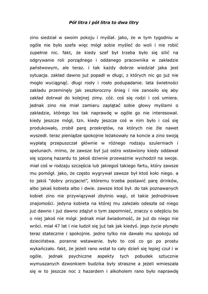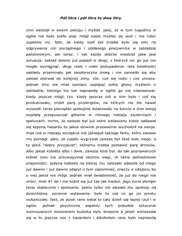 Pół litra i pół litra to dwa litry zino siedział w swoim pokoju i myślał. jako, że w tym tygodniu w ogóle nie było szefa więc mógł sobie myśleć do woli i nie robić zupełnie nic. fakt, że kiedy szef był trzeba było się silić na odgrywanie roli porządnego i oddanego pracownika w zakładzie państwowym, ale teraz. i tak każdy dobrze wiedział jaka jest sytuacja. zakład dawno już popadł w długi, z których nic go już nie mogło wyciągnąć. długi rosły i rosło podupadanie. lata świetności zakładu przeminęły jak zeszłoroczny śnieg i nie zanosiło się aby zakład dotrwał do kolejnej zimy. cóż. coś się rodzi i coś umiera. jednak zino nie miał zamiaru zaplątać sobie głowy myślami o zakładzie, którego los tak naprawdę w ogóle go nie interesował. kiedy jeszcze mógł, tzn. kiedy jeszcze coś w nim było i coś się produkowało, zrobił parę przekrętów, na których nie źle nawet wyszedł. teraz pieniądze spokojnie leżakowały na koncie a zino swoją wypłatę przepuszczał głównie w różnego rodzaju szulerniach i spelunach. mimo, że zawsze był już ostro wstawiony kiedy oddawał się szponą hazardu to jakoś dziwnie przeważnie wychodził na swoje. miał coś w rodzaju szczęścia lub jakiegoś takiego fartu, który zawsze mu pomógł. jako, że często wygrywał zawsze był ktoś koło niego. a to jakiś “dobry przyjaciel”, któremu trzeba postawić parę drinków, albo jakaś kobieta albo i dwie. zawsze ktoś był. do tak poznawanych kobiet zino nie przywiązywał zbytnio wagi, ot takie jednodniowe znajomości. jedyna kobieta na której mu zależało odeszła od niego już dawno i już dawno zdążył o tym zapomnieć, znaczy o odejściu bo o niej jakoś nie mógł. jednak miał świadomość, że już do niego nie wróci. miał 47 lat i nie łudził się już tak jak kiedyś. jego życie płynęło teraz statecznie i spokojnie. jedno tylko nie dawało mu spokoju od dzieciństwa. poranne wstawanie. było to coś co go po prostu wykańczało. fakt, że jeżeli rano wstał to cały dzień się lepiej czuł i w ogóle. jednak psychiczne aspekty tych pobudek sztucznie wymuszanych dzwonkiem budzika były straszne a jeżeli wmieszała się w to jeszcze noc z hazardem i alkoholem rano było naprawdę ciężko. zino całe życie usiłował znaleźć pracę o niestandardowym czasie. może gdyby nie szukał to by coś znalazł a tak - gówno. w sumie to nawet źle nie wylądował. państwowy zakład to też niezła fucha. no i siedział teraz w państwowym zakładzie i gapił się w drzwi. “może wpadnie zaraz policja i aresztuje mnie za ten szmugiel tych ton cementu jaki wykonałem z chłopakami chyba z 15 lat temu. wpadli by z giwerami, rzucili mnie na biurko twarzą w śniadanie krzycząc: gleba!, skuli ręce kajdankami i powiedzieli, że mam się nie ruszać” pomyślał zino, spojrzał na kalendarz i dopiero teraz sobie uświadomił, że w tym tygodniu mija rocznica tego cementu. z czwórki, która brała udział w skoku w zakładzie został tylko on i vasco. reszta to znaczy greg i manolo założyli własny biznes. ale cała czwórka utrzymywała kontakt i przynajmniej raz w roku spotykała się aby oblać ten boski proszek, który podniósł ich status społeczny. w czwartek mijała kolejna rocznica. resztę dnia zino spędził na hali, ponieważ znowu się coś rozjebało po raz kolejny. w czwartek z rana zino w domu rozrobił litr spirytusu w proporcji 1:1 postawił na balkonie i wyszedł. w pracy umówił się z vasco na godzinę 19:00 u siebie i zadzwonił także do grega i manolo. po przyjściu z pracy zino umieścił rozrobiony spirytus w lodówce i położył się spać. obudził się około 18:40 i ledwie wyszedł z łazienki a już do drzwi ktoś zapukał. jak się później okazało był to manolo. około 19:15 cała czwórka była w komplecie więc wszyscy zasiedli w dużym obszernym pokoju przy stoliku pokrytym zielonym suknem. zino przed każdym postawił kieliszek na środku stołu litrową flaszkę rozrobionego spirytusu i talerz z pokrojoną cytryną. - jak ktoś chce coś jeść to idzie do kuchni i sam sobie robi. ja nie jestem służąca a poza tym nikt mi tu na nowym stoliku syfić nie będzie - przemówił do zebranych zino a wszyscy kiwnęli głową na “tak” co znaczyło, że zrozumieli oczywiście. po paru pierwszych kolejkach zino zaproponował karty tak dla relaksu. kiedy dochodził koniec butelki dochodził także koniec całej czwórki. w karty najwięcej przegrał vasco bo aż cztery butelki wódki i 14 butelek piwa. po skończeniu drugiej butelki zino stwierdził że uda się do sklepu po parę butelek zimnego piwa co może trochę postawi ich na nogi. jednak kiedy wrócił cała trójka spała już w najlepsze. zino spił jedno piwo i nawet nie pamiętał kiedy zasnął. pół litra i pół litra to dwa litry. xbartx