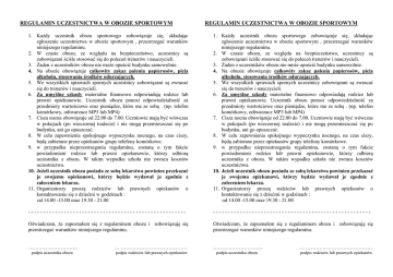 REGULAMIN UCZESTNICTWA W OBOZIE SPORTOWYM REGULAMIN UCZESTNICTWA W OBOZIE SPORTOWYM 1. Każdy uczestnik obozu sportowego zobowiązuje się, składając zgłoszenie uczestnictwa w obozie sportowym , przestrzegać warunków niniejszego regulaminu. 2. W czasie obozu, ze względu na bezpieczeństwo, uczestnicy są zobowiązani ściśle stosować się do poleceń trenerów i nauczycieli. 3. Żaden z uczestników obozu nie może opuścić budynku samowolnie. 4. Na obozie obowiązuje całkowity zakaz palenia papierosów, picia alkoholu, stosowania środków odurzających. 5. We wszystkich sprawach spornych uczestnicy zobowiązani są zwracać się do trenerów i nauczycieli. 6. Za umyślne szkody materialne finansowo odpowiadają rodzice lub prawni opiekunowie. Uczestnik obozu ponosi odpowiedzialność za przedmioty wartościowe oraz pieniądze, które ma ze sobą . (np. telefon komórkowy, odtwarzacz MP3 lub MP4) 7. Cisza nocna obowiązuje od 22.00 do 7.00. Uczniowie mają być wówczas w pokojach (po wieczornej toalecie) i nie mogą przemieszczać się po budynku, ani go opuszczać. 8. W celu zapewnienia spokojnego wypoczynku nocnego, na czas ciszy, będą zabierane przez opiekunów grupy telefony komórkowe. 9. w przypadku nieprzestrzegania regulaminu, zostaną o tym fakcie powiadomieni rodzice lub prawni opiekunowie, którzy odbiorą uczestnika z obozu. W takim wypadku szkoła nie zwraca kosztów uczestnictwa. 10. Jeżeli uczestnik obozu posiada ze sobą lekarstwa powinien przekazać je swojemu opiekunowi, którzy będzie wydawał je zgodnie z zaleceniem lekarza. 11. Organizatorzy proszą rodziców lub prawnych opiekunów o kontaktowanie się z dziećmi w godzinach : od 14.00 -15.00 oraz 19.30 - 21.00 1. Każdy uczestnik obozu sportowego zobowiązuje się, składając zgłoszenie uczestnictwa w obozie sportowym , przestrzegać warunków niniejszego regulaminu. 2. W czasie obozu, ze względu na bezpieczeństwo, uczestnicy są zobowiązani ściśle stosować się do poleceń trenerów i nauczycieli. 3. Żaden z uczestników obozu nie może opuścić budynku samowolnie. 4. Na obozie obowiązuje całkowity zakaz palenia papierosów, picia alkoholu, stosowania środków odurzających. 5. We wszystkich sprawach spornych uczestnicy zobowiązani są zwracać się do trenerów i nauczycieli. 6. Za umyślne szkody materialne finansowo odpowiadają rodzice lub prawni opiekunowie. Uczestnik obozu ponosi odpowiedzialność za przedmioty wartościowe oraz pieniądze, które ma ze sobą . (np. telefon komórkowy, odtwarzacz MP3 lub MP4) 7. Cisza nocna obowiązuje od 22.00 do 7.00. Uczniowie mają być wówczas w pokojach (po wieczornej toalecie) i nie mogą przemieszczać się po budynku, ani go opuszczać. 8. W celu zapewnienia spokojnego wypoczynku nocnego, na czas ciszy, będą zabierane przez opiekunów grupy telefony komórkowe. 9. w przypadku nieprzestrzegania regulaminu, zostaną o tym fakcie powiadomieni rodzice lub prawni opiekunowie, którzy odbiorą uczestnika z obozu. W takim wypadku szkoła nie zwraca kosztów uczestnictwa. 10. Jeżeli uczestnik obozu posiada ze sobą lekarstwa powinien przekazać je swojemu opiekunowi, którzy będzie wydawał je zgodnie z zaleceniem lekarza. 11. Organizatorzy proszą rodziców lub prawnych opiekunów o kontaktowanie się z dziećmi w godzinach : od 14.00 -15.00 oraz 19.30 - 21.00 ----------------------------------------------------- ----------------------------------------------------- Oświadczam, że zapoznałem się z regulaminem obozu i zobowiązuję się przestrzegać warunków niniejszego regulaminu. Oświadczam, że zapoznałem się z regulaminem obozu i zobowiązuję się przestrzegać warunków niniejszego regulaminu. ……………………….. … ………………………………… ……………………….. … ………………………………… podpis uczestnika obozu podpis rodziców lub prawnych opiekunów podpis uczestnika obozu podpis rodziców lub prawnych opiekunów