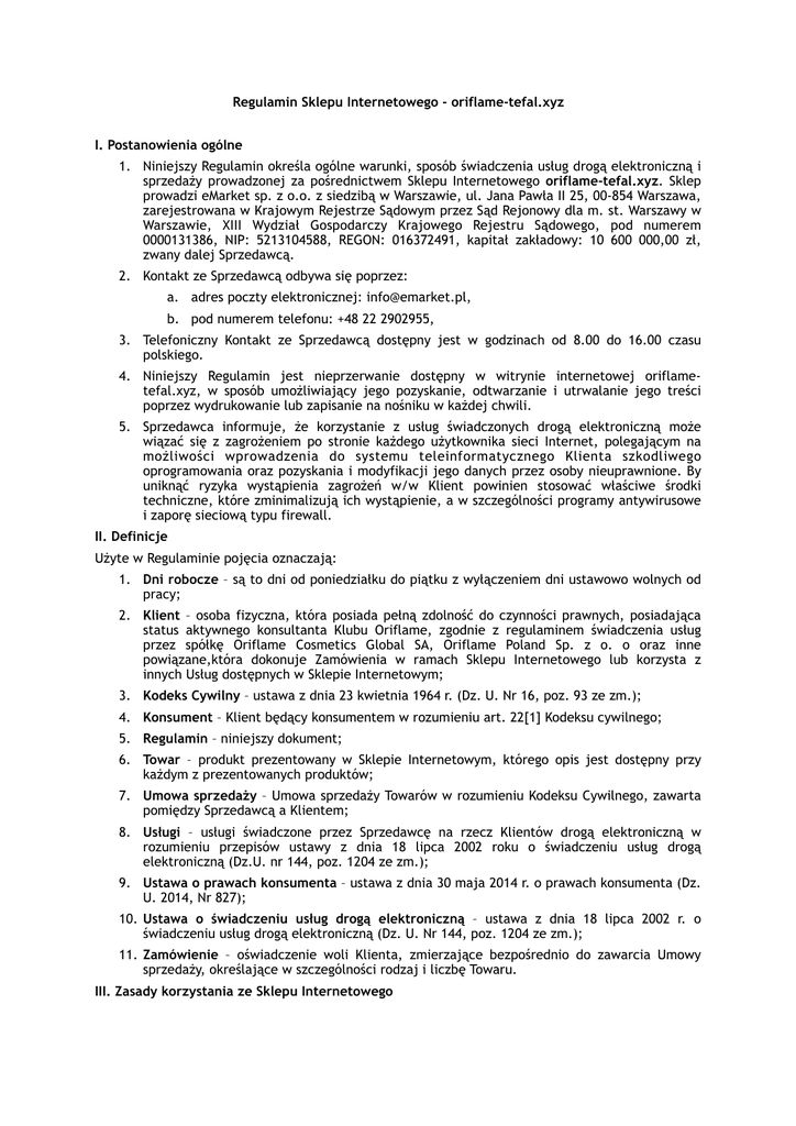 01. Regulamin sklepu internetoweg o oriflame-tefal.xyz