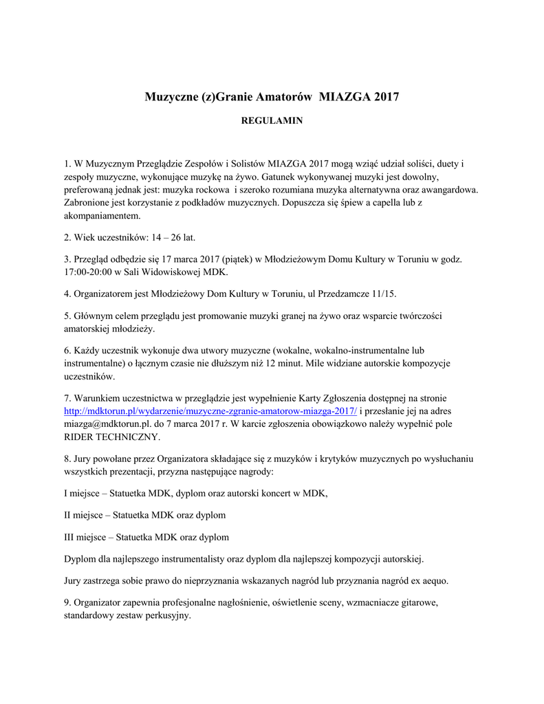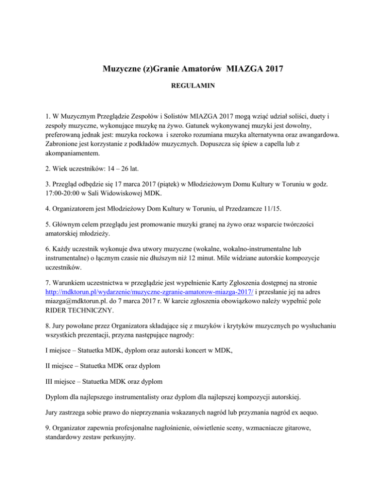 Muzyczne (z)Granie Amatorów MIAZGA 2017 REGULAMIN 1. W Muzycznym Przeglądzie Zespołów i Solistów MIAZGA 2017 mogą wziąć udział soliści, duety i zespoły muzyczne, wykonujące muzykę na żywo. Gatunek wykonywanej muzyki jest dowolny, preferowaną jednak jest: muzyka rockowa i szeroko rozumiana muzyka alternatywna oraz awangardowa. Zabronione jest korzystanie z podkładów muzycznych. Dopuszcza się śpiew a capella lub z akompaniamentem. 2. Wiek uczestników: 14 – 26 lat. 3. Przegląd odbędzie się 17 marca 2017 (piątek) w Młodzieżowym Domu Kultury w Toruniu w godz. 17:00-20:00 w Sali Widowiskowej MDK. 4. Organizatorem jest Młodzieżowy Dom Kultury w Toruniu, ul Przedzamcze 11/15. 5. Głównym celem przeglądu jest promowanie muzyki granej na żywo oraz wsparcie twórczości amatorskiej młodzieży. 6. Każdy uczestnik wykonuje dwa utwory muzyczne (wokalne, wokalno-instrumentalne lub instrumentalne) o łącznym czasie nie dłuższym niż 12 minut. Mile widziane autorskie kompozycje uczestników. 7. Warunkiem uczestnictwa w przeglądzie jest wypełnienie Karty Zgłoszenia dostępnej na stronie http://mdktorun.pl/wydarzenie/muzyczne-zgranie-amatorow-miazga-2017/ i przesłanie jej na adres [email protected]. do 7 marca 2017 r. W karcie zgłoszenia obowiązkowo należy wypełnić pole RIDER TECHNICZNY. 8. Jury powołane przez Organizatora składające się z muzyków i krytyków muzycznych po wysłuchaniu wszystkich prezentacji, przyzna następujące nagrody: I miejsce – Statuetka MDK, dyplom oraz autorski koncert w MDK, II miejsce – Statuetka MDK oraz dyplom III miejsce – Statuetka MDK oraz dyplom Dyplom dla najlepszego instrumentalisty oraz dyplom dla najlepszej kompozycji autorskiej. Jury zastrzega sobie prawo do nieprzyznania wskazanych nagród lub przyznania nagród ex aequo. 9. Organizator zapewnia profesjonalne nagłośnienie, oświetlenie sceny, wzmacniacze gitarowe, standardowy zestaw perkusyjny. 10. Obowiązkiem uczestników jest posiadanie własnych instrumentów, pałek i innego sprzętu muzycznego potrzebnego do prezentacji. 11. Prezentowane utwory muzyczne nie mogą godzić w porządek prawny ani obrażać uczuć religijnych. 12. Istnieje możliwość prób akustycznych dla uczestników. Próby odbędą się w dniu przesłuchań w godz. 12:00-15:00 w MDK na Sali Widowiskowej według harmonogramu dostępnego na stronie www.mdktorun.pl oraz przesłanego w formie elektronicznej do uczestników. 13. Wszelkie kwestie sporne rozstrzyga Organizator. Warunkiem uczestnictwa w przeglądzie jest akceptacja regulaminu MDK. Zgodnie z regulaminem uczestnicy przeglądu wyrażają zgodę na wykorzystanie ich wizerunku utrwalonego na zdjęciach i filmach zrealizowanych podczas przeglądu przez osobę posiadającą upoważnienie organizatora w materiałach o charakterze informacyjnym, promocyjnym oraz na stronach internetowych. 14. Dodatkowych informacji udziela organizator przeglądu Paweł Kociszewski: [email protected]