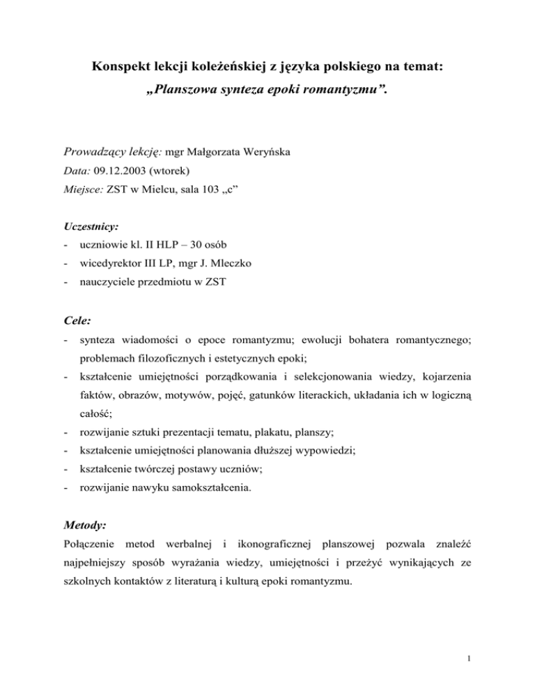Konspekt lekcji koleŜeńskiej z języka polskiego na temat: „Planszowa synteza epoki romantyzmu”. Prowadzący lekcję: mgr Małgorzata Weryńska Data: 09.12.2003 (wtorek) Miejsce: ZST w Mielcu, sala 103 „c” Uczestnicy: - uczniowie kl. II HLP – 30 osób - wicedyrektor III LP, mgr J. Mleczko - nauczyciele przedmiotu w ZST Cele: - synteza wiadomości o epoce romantyzmu; ewolucji bohatera romantycznego; problemach filozoficznych i estetycznych epoki; - kształcenie umiejętności porządkowania i selekcjonowania wiedzy, kojarzenia faktów, obrazów, motywów, pojęć, gatunków literackich, układania ich w logiczną całość; - rozwijanie sztuki prezentacji tematu, plakatu, planszy; - kształcenie umiejętności planowania dłuŜszej wypowiedzi; - kształcenie twórczej postawy uczniów; - rozwijanie nawyku samokształcenia. Metody: Połączenie metod werbalnej i ikonograficznej planszowej pozwala znaleźć najpełniejszy sposób wyraŜania wiedzy, umiejętności i przeŜyć wynikających ze szkolnych kontaktów z literaturą i kulturą epoki romantyzmu. 1 Przebieg lekcji: I. Czynności organizacyjne - powitanie zaproszonych gości - lista obecności - zajęcie miejsc w grupach (6 grup pięcioosobowych) II. Zapisanie na tablicy tematu lekcji. „Planszowa synteza epoki romantyzmu III. Przypomnienie zasad pracy przy tworzeniu planszowej syntezy. Metoda nie jest uczniom obca. JuŜ w klasie pierwszej została wprowadzona, wykorzystano ją m.in. przy syntezie (bardzo udanej) epoki średniowiecza. Zasady tworzenia syntez: • pomyśl, zanim napiszesz, namalujesz, z jakimi obrazami, motywami, utworami, bohaterami, gatunkami, pojęciami kojarzy ci się wylosowane hasło; • wykaŜ związki między róŜnymi skojarzonymi elementami; • zobacz w wyobraźni swoją pracę; • zaplanuj ją na planszy; • porozmawiaj z kolegami, wymień pomysły, wraŜenia, propozycje kierunku pracy • myśl obrazami i pokaŜ to na swojej planszy; • wyeksponuj rzeczy waŜne, do zapamiętania, na które koniecznie naleŜy zwrócić uwagę; • pamiętaj, Ŝe to, co stworzysz, musi być czytelne dla kolegów innej grupy, nawet dla kogoś, kto nie brał udziału w pracy, ale zechce z twojej syntezy skorzystać; • oceń swoją prace lub pracę grupy; • sformułuj wnioski, uwagi na przyszłość, propozycje. IV. Liderzy grupy losują (moŜe na wzór zasad głosowania w loŜy masońskiej) hasła do przygotowania prezentacji, np.: 2 a) Artysta i jego dzieło b) Dobro i Zło (teodycea) c) Wolność d) Pielgrzymowanie e) Gusła, czary, zjawy, duchy... f) Historia (prowidencjonalizm) V. Praca w grupach nad stworzeniem plakatu i ustną prezentacją planszy – 20 min. UWAGA! Uczniowie na 2 tygodnie przed dzisiejszą lekcją mieli zadane, by indywidualnie powtórzyć materiał literacki z zakresu epoki romantyzmu według wskazanych problemów, przygotowali na kartkach stosowne, waŜne według nich cytaty. VI. Prezentacja planszowej syntezy epoki romantyzmu. VII. Ocena pracy w grupach. VIII. Zadanie domowe 1) Przygotować pisemną prezentację plakatu, dokonać estetycznej obróbki planszy 2) *Przygotować multimedialną prezentację planszowej syntezy epoki romantyzmu. 3