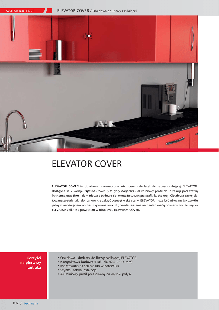 kuchenną oraz Box - aluminiowa obudowa do montażu wewnątrz szafki kuchennej. Obudowa zaprojektowana została tak, aby całkowicie zakryć osprzęt elektryczny. ELEVATOR może być używany jak zwykle