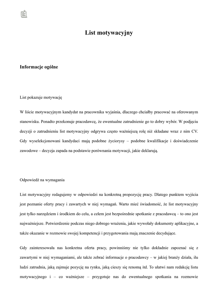 List motywacyjny Informacje ogólne List pokazuje motywację W liście motywacyjnym kandydat na pracownika wyjaśnia, dlaczego chciałby pracować na oferowanym stanowisku. Ponadto przekonuje pracodawcę, że ewentualne zatrudnienie go to dobry wybór. W podjęciu decyzji o zatrudnieniu list motywacyjny odgrywa często ważniejszą rolę niż składane wraz z nim CV. Gdy wyselekcjonowani kandydaci mają podobne życiorysy – podobne kwalifikacje i doświadczenie zawodowe – decyzja zapada na podstawie porównania motywacji, jakie deklarują. Odpowiedź na wymagania List motywacyjny redagujemy w odpowiedzi na konkretną propozycję pracy. Dlatego punktem wyjścia jest poznanie oferty pracy i zawartych w niej wymagań. Warto mieć świadomość, że list motywacyjny jest tylko narzędziem i środkiem do celu, a celem jest bezpośrednie spotkanie z pracodawcą – to ono jest najważniejsze. Potwierdzenie podczas niego dobrego wrażenia, jakie wywołały dokumenty aplikacyjne, a także okazanie w rozmowie swojej kompetencji i przygotowania mają znaczenie decydujące. Gdy zainteresowała nas konkretna oferta pracy, powinniśmy nie tylko dokładnie zapoznać się z zawartymi w niej wymaganiami, ale także zebrać informacje o pracodawcy – w jakiej branży działa, ilu ludzi zatrudnia, jaką zajmuje pozycję na rynku, jaką cieszy się renomą itd. To ułatwi nam redakcję listu motywacyjnego i – co ważniejsze – przygotuje nas do ewentualnego spotkania na rozmowie kwalifikacyjnej. Jak napisać list List motywacyjny powinien być dokumentem zwięzłym (najlepiej, gdy jego objętość nie przekracza jednej strony formatu A4) i czytelnym, sporządzonym na białym papierze. GP RADZI Styl listu powinien być rzeczowy i informacyjny, a nie gawędziarski i emocjonalny. Wyrafinowane popisy pisarskie, które zazwyczaj zabierają dużo miejsca, nie są dobrze odbierane. Ale jeśli dokument napisany jest językiem za bardzo formalnym, „urzędowym”, może niedostatecznie pokazać motywację kandydata do podjęcia pracy. Potrzebna jest odrobina entuzjazmu i zapału. Obok rzeczowych informacji powinien odzwierciedlać nastawienia kandydata – jego zdecydowanie, zapał do podjęcia pracy i przekonanie, że to on będzie ją wykonywał zgodnie z oczekiwaniami pracodawcy, a nawet wzniesie się ponad te oczekiwania. Krok 1 DANE KANDYDATA. Osoba składająca aplikację powinna w liście podać swoje dane, wraz z telefonami – najlepiej bezpośrednim telefonem stacjonarnym i komórkowym – oraz adresem emailowym. Krok 2 DANE ADRESATA. List należy skierować do konkretnej osoby, na ręce której składamy dokumenty aplikacyjne. PUŁAPKI W liście motywacyjnym nie można powtarzać zapisów umieszczonych w CV, powinno się je natomiast interpretować. Krok 3 MOTYWACJA. Właściwe umotywowanie listu jest jednym z dwóch najważniejszych składników całego dokumentu. Należy tu: wskazać źródło informacji o ofercie pracy, np. „w odpowiedzi na ogłoszenie rekrutacyjne nr ... zamieszczone w ..... z ...”, zadeklarować swoją gotowość do podjęcia oferowanej pracy oraz nadmienić, że przez dotychczasowe doświadczenie zawodowe i zdobyte kwalifikacje kandydat jest dobrze przygotowany do skutecznego jej wykonywania, wskazać na te czynniki i okoliczności, które czynią kandydata szczególnie przydatnym na proponowanym stanowisku. GP RADZI Najpoważniejszym błędem, który dyskwalifikuje, jest niewolnicze trzymanie się gotowych wzorów listów motywacyjnych. Warto z nich korzystać jako z pomocy, ale jednocześnie pamiętać, że całość musi mieć charakter oryginalnej wypowiedzi. Kandydat powinien pokazać, że jest człowiekiem konkretnym i stanowczym. Nie należy sprawiać pozorów niezdecydowania – raczej wskazać na czynniki, które przemawiają „za” i poprosić o rozpatrzenie dokumentów. Należy przy tym wystrzegać się tonu proszącego – tu idzie o biznes, a nie o akcję charytatywną. Krok 4 UZASADNIENIE. To część dokumentu, w której kandydat przekonuje pracodawcę, że jest tym właściwym pracownikiem, którego poszukuje. Warto wymienić tu swoje umiejętności i akcentować przygotowanie do podjęcia danej pracy, co powinno dobitnie wskazywać, że dokładnie spełnia się stawiane przez pracodawcę wymagania. Warto podawać konkretne przykłady z dotychczasowej kariery zawodowej potwierdzające dobre przygotowanie do podjęcia oferowanej pracy. Powinno się szerzej opisać te z dotychczas pełnionych obowiązków, które pozwoliły poznać charakter oferowanej pracy. Krok 5 ZAKOŃCZENIE I PODPIS. W końcowej części pisma dobrze jest odesłać adresata do CV oraz innych dokumentów aplikacyjnych (np. kopii zrealizowanych projektów), które potwierdzają wspomniane w liście umiejętności i nabyte doświadczenie. Można wspomnieć o chęci zaprezentowania swojej osoby w bezpośrednim spotkaniu i zakończyć całość podziękowaniem za okazane zainteresowanie. Całość zamyka własnoręczny podpis. Formalności Liczy się szybkość Ważne jest, by list motywacyjny i CV dostarczyć w odpowiedzi na ogłoszenie naboru możliwie jak najszybciej, nawet jeśli nie mija jeszcze podany w ofercie termin końcowy przyjmowania dokumentów aplikacyjnych. Największe szanse mają często ci, którzy zgłoszą się pierwsi. Dlatego warto mieć do dyspozycji 3–4 warianty własnego CV, by skrócić czas przygotowywania dokumentów aplikacyjnych do szczegółowego przyjrzenia się ofercie, wybrania stosownej wersji CV i zredagowania listu motywacyjnego, a następnie wysłania lub doręczenia całości. Krzysztof Polak