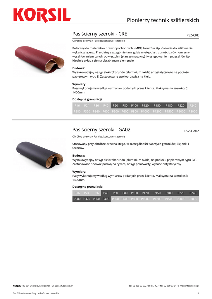 KORSIL Pionierzy technik szlifierskich Pas ścierny szeroki - CRE PSZ-CRE Obróbka drewna / Pasy bezkońcowe - szerokie Polecany do materiałów drewnopochodnych - MDF, fornirów, itp. Głównie do szlifowania wykańczającego. Przydatny szczególnie tam, gdzie występują trudności z równomiernym wyszlifowaniem całych powierzchni (starsze maszyny) i występowaniem przeszlifów itp. Idealnie układa się na obrabianym elemencie. Budowa: Wysokowydajny nasyp elektrokorundu (aluminium oxide) antystatycznego na podłożu papierowym typu E. Zastosowane spoiwo: żywica na kleju. Wymiary: Pasy wykonujemy według wymiarów podanych przez klienta. Maksymalna szerokość: 1400mm. Dostępne granulacje: P16 P24 P36 P40 P60 P80 P100 P120 P150 P180 P220 P240 P280 P320 P360 P400 P500 P600 P800 P1000 P1200 P1500 P2000 P3000 Pas ścierny szeroki - GA02 PSZ-GA02 Obróbka drewna / Pasy bezkońcowe - szerokie Stosowany przy obróbce drewna litego, w szczególności twardych gatunków, klejonki i fornirów. Budowa: Wysokowydajny nasyp elektrokorundu (aluminium oxide) na podłożu papierowym typu E/F. Zastosowane spoiwo: podwójna żywica, nasyp półotwarty, wysoce antystatyczny. Wymiary: Pasy wykonujemy według wymiarów podanych przez klienta. Maksymalna szerokość: 1400mm. Dostępne granulacje: P16 KORSIL · 86-031 Osielsko, Myślęcinek · ul. Szosa Gdańska 27 Obróbka drewna / Pasy bezkońcowe - szerokie P24 P36 P40 P60 P80 P100 P120 P150 P180 P220 P240 P280 P320 P360 P400 P500 P600 P800 P1000 P1200 P1500 P2000 P3000 tel. 52 360 53 53, 721 877 427 · fax 52 360 53 51 · e-mail: [email protected] 1 KORSIL Pionierzy technik szlifierskich Pas ścierny szeroki - GA03 PSZ-GA03 Obróbka drewna / Pasy bezkońcowe - szerokie Stosowany przy obróbce drewna litego iglastego, zażywiczonego, z dużą ilością szpachla. Materiał wysoce odporny na zaklejanie powierzchni. Budowa: Wysokowydajny nasyp elektrokorundu (aluminium oxide) na podłożu papierowym typu F. Zastosowane spoiwo: podwójna żywica, nasyp otwarty, wysoce antystatyczny. Wymiary: Pasy wykonujemy według wymiarów podanych przez klienta. Maksymalna szerokość: 1400mm. Dostępne granulacje: P16 P24 P36 P40 P60 P80 P100 P120 P150 P180 P220 P240 P280 P320 P360 P400 P500 P600 P800 P1000 P1200 P1500 P2000 P3000 Pas ścierny szeroki - SES PSZ-SES Obróbka drewna / Pasy bezkońcowe - szerokie Stosowany przy szlifowaniu poliestrów, szpachli, melaminy, twardych lakierów. Produkt stworzony do pracy na liniach UV. Budowa: Wysokowydajny nasyp elektrokorundu (aluminium oxide) na podłożu papierowym typu E. Zastosowane spoiwo: żywica+klej, nasyp półotwarty, antystatyczny, bardzo agresywny, pokryty warstwą stearyny znacznie wydłużającą żywotność. Wymiary: Pasy wykonujemy według wymiarów podanych przez klienta. Maksymalna szerokość: 1400mm. Dostępne granulacje: P16 KORSIL · 86-031 Osielsko, Myślęcinek · ul. Szosa Gdańska 27 Obróbka drewna / Pasy bezkońcowe - szerokie P24 P36 P40 P60 P80 P100 P120 P150 P180 P220 P240 P280 P320 P360 P400 P500 P600 P800 P1000 P1200 P1500 P2000 P3000 tel. 52 360 53 53, 721 877 427 · fax 52 360 53 51 · e-mail: [email protected] 2 KORSIL Pionierzy technik szlifierskich Pas ścierny szeroki - SESN PSZ-SESN Obróbka drewna / Pasy bezkońcowe - szerokie Stosowany przy szlifowaniu poliestrów, szpachli, melaminy, twardych lakierów i skóry. Stosowany na liniach UV, jak i szlifierkach wolnostojących. Budowa: Wysokowydajny nasyp elektrokorundu (aluminium oxide) na podłożu papierowym typu E. Zastosowane spoiwo: żywica+klej, nasyp półotwarty, antystatyczny, bardzo agresywny. Wymiary: Pasy wykonujemy według wymiarów podanych przez klienta. Maksymalna szerokość: 1850mm. Dostępne granulacje: P16 P24 P36 P40 P60 P80 P100 P120 P150 P180 P220 P240 P280 P320 P360 P400 P500 P600 P800 P1000 P1200 P1500 P2000 P3000 Pas ścierny szeroki - SE PSZ-SE Obróbka drewna / Pasy bezkońcowe - szerokie Stosowany przy szlifowaniu lakierów, głównie poliestrowych, wszędzie tam, gdzie wymagane jest uzyskanie połysku lub półpołysku. Budowa: Wysokowydajny nasyp węglika krzemu na podłożu papierowym typu E. Zastosowane spoiwo: żywica+klej, nasyp zamknięty, antystatyczny, pokryty stearyną. Wymiary: Pasy wykonujemy według wymiarów podanych przez klienta. Maksymalna szerokość: 1400mm. Dostępne granulacje: P16 KORSIL · 86-031 Osielsko, Myślęcinek · ul. Szosa Gdańska 27 Obróbka drewna / Pasy bezkońcowe - szerokie P24 P36 P40 P60 P80 P100 P120 P150 P180 P220 P240 P280 P320 P360 P400 P500 P600 P800 P1000 P1200 P1500 P2000 P3000 tel. 52 360 53 53, 721 877 427 · fax 52 360 53 51 · e-mail: [email protected] 3 KORSIL Pionierzy technik szlifierskich Pas ścierny szeroki - SD PSZ-SD Obróbka drewna / Pasy bezkońcowe - szerokie Stosowany przy szlifowaniu lakierów akrylowych, poliuretanowych, syntetycznych, wodnych, nitro, wszędzie tam, gdzie wymagane jest uzyskanie połysku lub półpołysku. Materiał elastyczny, dobrze układający się na elementach, zmniejszający występowanie przeszlifów. Budowa: Wysokowydajny nasyp węglika krzemu na podłożu papierowym typu D. Zastosowane spoiwo: żywica+klej, nasyp zamknięty, antystatyczny, pokryty stearyną. Wymiary: Pasy wykonujemy według wymiarów podanych przez klienta. Maksymalna szerokość: 1400mm. Dostępne granulacje: P16 P24 P36 P40 P60 P80 P100 P120 P150 P180 P220 P240 P280 P320 P360 P400 P500 P600 P800 P1000 P1200 P1500 P2000 P3000 Pas ścierny szeroki - CSER PSZ-CSER Obróbka drewna / Pasy bezkońcowe - szerokie Stosowany przy szlifowaniu wyrobów drewnopochodnych (MDF, HDF), lakierów, głównie poliestrowych, wszędzie tam, gdzie wymagane jest uzyskanie połysku lub półpołysku. Budowa: Wysokowydajny nasyp węglika krzemu na podłożu papierowym typu E. Zastosowane spoiwo: żywica+klej, nasyp zamknięty, antystatyczny. Wymiary: Pasy wykonujemy według wymiarów podanych przez klienta. Maksymalna szerokość: 1400mm. Dostępne granulacje: P16 KORSIL