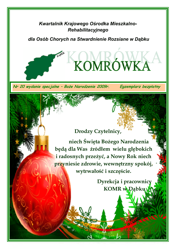 Kwartalnik Krajowego Ośrodka MieszkalnoRehabilitacyjnego dla Osób Chorych na Stwardnienie Rozsiane w Dąbku Nr 20 wydanie specjalne – Boże Narodzenie 2009r. Egzemplarz bezpłatny Drodzy Czytelnicy, niech Święta Bożego Narodzenia będą dla Was źródłem wielu głębokich i radosnych przeżyć, a Nowy Rok niech przyniesie zdrowie, wewnętrzny spokój, wytrwałość i szczęście. Dyrekcja i pracownicy KOMR w Dąbku KOMRÓWKA – Boże Narodzenie 2009r. Zawsze, ilekroć się uśmiechasz do swojego brata i wyciągasz do niego rękę zawsze wtedy jest BOŻE NARODZENIE Zawsze, ilekroć milkniesz, by innych wysłuchać, Zawsze, kiedy rezygnujesz z zasad, które jak żelazna obręcz uciskają ludzi w ich samotności. Zawsze, kiedy dajesz odrobinę nadziei załamanym Zawsze, kiedy rozpoznajesz w pokorze jak bardzo znikome są twoje możliwości i jak wielka jest Twoja słabość. Zawsze, ilekroć pozwolisz, by Bóg pokochał innych przez Ciebie ZAWSZE WTEDY JEST BOŻE NARODZENIE Matka Teresa z Kalkuty *** ... Gdy siądziecie na ławie zebrani społem, czy zostanie nam trochę miejsca za stołem ? Gdy podzieli się kołem cała gromadka, czy zostanie nam aby okruch opłatka ?! Kazimiera Iłłakowiczówna KOMRÓWKA – Boże Narodzenie 2009r. EZYDERATA Przechodź spokojnie przez hałas i pośpiech, i pamiętaj, jaki spokój można znaleźć w ciszy. O ile to możliwe, bez wyrzekania się siebie bądź na dobrej stopie ze wszystkimi. Wypowiadaj swoją prawdę jasno i spokojnie, wysłuchaj innych, nawet tępych i nieświadomych, oni też mają swoja opowieść. Unikaj głośnych i napastliwych - są udręką ducha. Porównując się z innymi możesz stać się próżny i zgorzkniały, bowiem zawsze znajdziesz lepszych i gorszych od siebie. Niech twoje osiągnięcia zarówno jak plany będą dla Ciebie źródłem radości. Wykonaj swą pracę z sercem - jakakolwiek byłaby skromna, ją jedynie posiadasz w zmiennych kolejach losu. Bądź ostrożny w interesach, na świecie bowiem pełno oszustwa. Niech Ci to jednak nie zasłoni prawdziwej cnoty; wielu ludzi dąży do wzniosłych ideałów i wszędzie życie pełne jest heroizmu. Bądź sobą, zwłaszcza nie udawaj uczucia. Ani też nie podchodź cynicznie do miłości, albowiem wobec oschłości i rozczarowań ona jest wieczna jak trawa. Przyjmij spokojnie co Ci lata doradzają z wdziękiem wyrzekając się spraw młodości. Rozwijaj siłę ducha, aby mogła cię osłonić w nagłym nieszczęściu. Lecz nie dręcz się tworami wyobraźni. Wiele obaw rodzi się ze znużenia i samotności. Obok zdrowej dyscypliny bądź dla siebie łagodny. Jesteś dzieckiem wszechświata nie mniej niż drzewa i gwiazdy, masz prawo być tutaj. I czy to jest dla ciebie jasne, czy nie - wszechświat bez wątpienia jest na dobrej drodze. KOMRÓWKA – Boże Narodzenie 2009r. Tak więc żyj w zgodzie z Bogiem, czymkolwiek On ci się wydaje, czymkolwiek się trudzisz i jakiekolwiek są twoje pragnienia, w zgiełkliwym pomieszaniu życia zachowaj spokój ze swą duszą. Przy całej swej złudności, znoju i rozwianych marzeniach jest to piękny świat. Bądź pogodny. Dąż do szczęścia. Max Ehrmann (od łac. desideratum, w liczbie mnogiej desiderata – to, co pożądane, upragnione, potrzebne) to poemat napisany przez Maksa Ehrmanna, zawierający wskazówki na temat dobrego życia. Utwór powstał w 1927. W 1933 autor złożył go w formie życzeń na Boże Narodzenie dla przyjaciół. W 1948 wdowa po Ehrmannie opublikowała go w tomiku The poems of Max Ehrmann, skąd dwa lata później, w 1950, trafił do cotygodniowej gazetki parafialnej, publikowanej przez pastora anglikańskiego Starego Kościoła pod wezwaniem Św. Pawła w Baltimore (Old St. Paul Church). Dopiero tą drogą Dezyderata dostała się do kultury masowej. Pogłoska na temat anonimowego autora i błędna data powstania utworu – 1692 – pochodzą stąd, że pierwsza strona owej gazetki, na której znajdował się tekst "dezyderaty", miała stopkę z informacją: "Stary kościół św. Pawła" i datą 1692 (w rzeczywistości to data powstania parafii i budowy pierwszego już nieistniejącego kościoła). Wskutek częstego kopiowania jedynie tej strony, informacja zaczęła być błędnie odczytywana. Dezyderata posłużyła jako tekst znanej piosenki Lesa Crane'a z muzyką Freda Wernera (po raz pierwszy nagranej w 1970 przez brytyjską grupę Every Which Way) oraz popularnej w Polsce piosenki kabaretu Piwnica pod Baranami. Na jej podstawie utwór napisał również polski raper Sokół z zespołu WWO, pochodzi on z płyty Masz i pomyśl. Wersja Lesa Crane'a została sparodiowana jako "Deteriorata" przez National Lampoon w 1972. KOMRÓWKA – Boże Narodzenie 2009r. jest dniem poprzedzającym Boże Narodzenie. Słowo wigilia pochodzi od łacińskiego vigilare, co znaczy: czuwać, być czujnym. W Kościele od starożytności obchodzono wigilie, czyli czuwano, aby o północy godnie powitać nadejście dnia świątecznego. W wigilię Bożego Narodzenia gromadzimy się w gronie najbliższych, by oczekiwać przyjścia Jezusa. Polska tradycja nakazuje zasiąść do wieczerzy, gdy zabłyśnie pierwsza gwiazdka na niebie. Gwiazdka ta jest symbolem Gwiazdy Betlejemskiej. Zgodnie z obowiązującym obecnie prawem kościelnym nie ma w tym dniu obowiązku zachowania postu, jednak dawna tradycja każe powstrzymać się w tym dniu od potraw mięsnych. Były i są różne zwyczaje dotyczące ilości i zawartości potraw wigilijnych. Symbolem wigilii są potrawy z ryby, zwłaszcza karpia. W starożytności ryba symbolizowała Jezusa. Zwyczajowo podaje się także barszcz z uszkami, potem grzyby z kapustą, ryby gotowane lub pieczone, kluski z makiem, kompot z suszonych owoców, itd. Na ogół przygotowuje się 7, 9 względnie 12 potraw. Przyjęło się pozostawienie wolnego nakrycia przy stole dla ewentualnego gościa lub też symbolicznie dla Chrystusa. Pozostawiając wolne miejsce przy stole wyrażamy równie