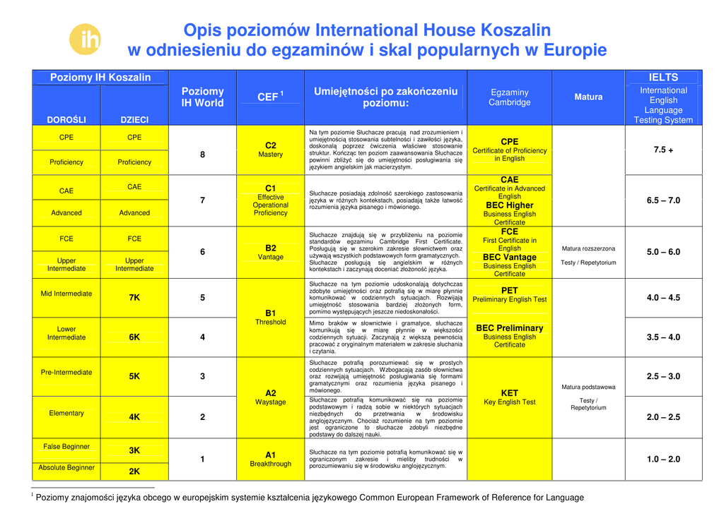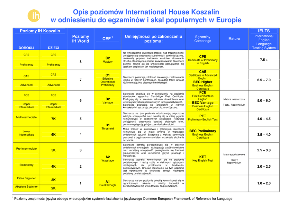 Opis poziomów International House Koszalin w odniesieniu do egzaminów i skal popularnych w Europie Poziomy IH Koszalin IELTS Poziomy IH World DOROŚLI DZIECI CPE CPE CEF 1 C2 8 Proficiency CAE Proficiency Advanced Advanced FCE FCE Upper Intermediate Upper Intermediate C1 6 7K Effective Operational Proficiency B2 Vantage 5 B1 Threshold Lower Intermediate Pre-Intermediate 6K 5K False Beginner 3K 1 2K Słuchacze znajdują się w przybliżeniu na poziomie standardów egzaminu Cambridge First Certificate. Posługują się w szerokim zakresie słownictwem oraz używają wszystkich podstawowych form gramatycznych. Słuchacze posługują się angielskim w różnych kontekstach i zaczynają doceniać złożoność języka. Słuchacze na tym poziomie udoskonalają dotychczas zdobyte umiejętności oraz potrafią się w miarę płynnie komunikować w codziennych sytuacjach. Rozwijają umiejętność stosowania bardziej złożonych form, pomimo występujących jeszcze niedoskonałości. 3 Słuchacze potrafią porozumiewać się w prostych codziennych sytuacjach. Wzbogacają zasób słownictwa oraz rozwijają umiejętność posługiwania się formami gramatycznymi oraz rozumienia języka pisanego i mówionego. 2 1 Absolute Beginner Matura CPE International English Language Testing System 7.5 + Certificate of Proficiency in English A1 Breakthrough Certificate in Advanced English 6.5 – 7.0 BEC Higher Business English Certificate 4 A2 4K Słuchacze posiadają zdolność szerokiego zastosowania języka w różnych kontekstach, posiadają także łatwość rozumienia języka pisanego i mówionego. Mimo braków w słownictwie i gramatyce, słuchacze komunikują się w miarę płynnie w większości codziennych sytuacji. Zaczynają z większą pewnością pracować z oryginalnym materiałem w zakresie słuchania i czytania. Waystage Elementary Na tym poziomie Słuchacze pracują nad zrozumieniem i umiejętnością stosowania subtelności i zawiłości języka, doskonalą poprzez ćwiczenia właściwe stosowanie struktur. Kończąc ten poziom zaawansowania Słuchacze powinni zbliżyć się do umiejętności posługiwania się językiem angielskim jak macierzystym. Egzaminy Cambridge CAE CAE 7 Mid Intermediate Mastery Umiejętności po zakończeniu poziomu: Słuchacze potrafią komunikować się na poziomie podstawowym i radzą sobie w niektórych sytuacjach niezbędnych do przetrwania w środowisku anglojęzycznym. Chociaż rozumienie na tym poziomie jest ograniczone to słuchacze zdobyli niezbędne podstawy do dalszej nauki. FCE First Certificate in English BEC Vantage Business English Certificate Matura rozszerzona 5.0 – 6.0 Testy / Repetytorium PET 4.0 – 4.5 Preliminary English Test BEC Preliminary 3.5 – 4.0 Business English Certificate 2.5 – 3.0 KET Key English Test Matura podstawowa Testy / Repetytorium Słuchacze na tym poziomie potrafią komunikować się w ograniczonym zakresie i mieliby trudności w porozumiewaniu się w środowisku anglojęzycznym. Poziomy znajomości języka obcego w europejskim systemie kształcenia językowego Common European Framework of Reference for Language 2.0 – 2.5 1.0 – 2.0