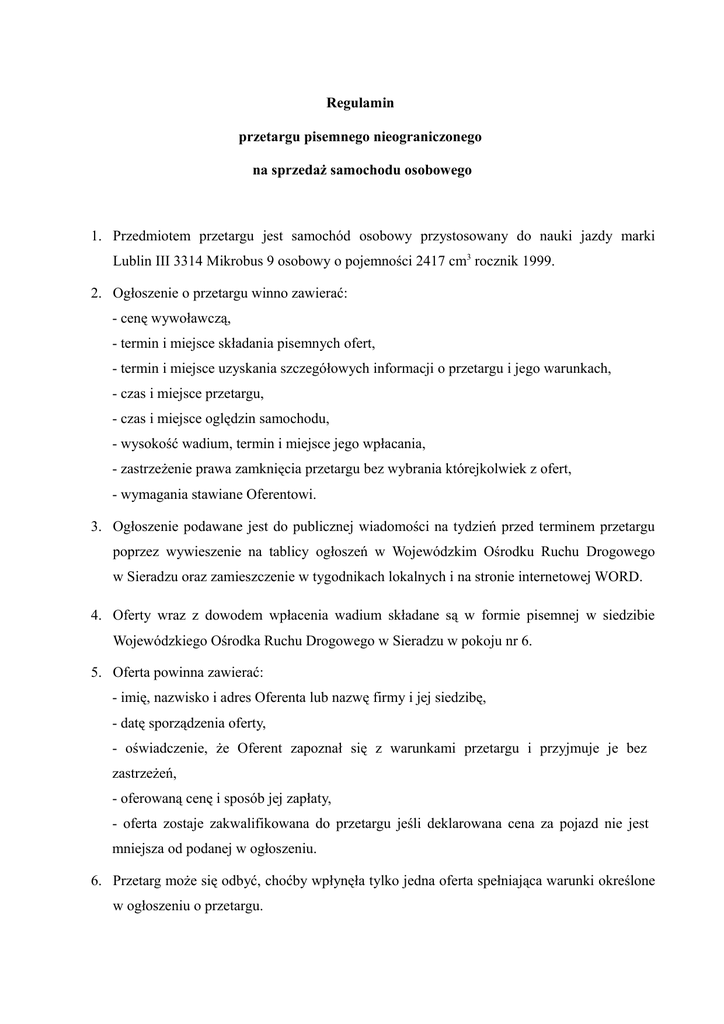Regulamin przetargu pisemnego nieograniczonego na sprzedaż samochodu osobowego 1. Przedmiotem przetargu jest samochód osobowy przystosowany do nauki jazdy marki Lublin III 3314 Mikrobus 9 osobowy o pojemności 2417 cm3 rocznik 1999. 2. Ogłoszenie o przetargu winno zawierać: - cenę wywoławczą, - termin i miejsce składania pisemnych ofert, - termin i miejsce uzyskania szczegółowych informacji o przetargu i jego warunkach, - czas i miejsce przetargu, - czas i miejsce oględzin samochodu, - wysokość wadium, termin i miejsce jego wpłacania, - zastrzeżenie prawa zamknięcia przetargu bez wybrania którejkolwiek z ofert, - wymagania stawiane Oferentowi. 3. Ogłoszenie podawane jest do publicznej wiadomości na tydzień przed terminem przetargu poprzez wywieszenie na tablicy ogłoszeń w Wojewódzkim Ośrodku Ruchu Drogowego w Sieradzu oraz zamieszczenie w tygodnikach lokalnych i na stronie internetowej WORD. 4. Oferty wraz z dowodem wpłacenia wadium składane są w formie pisemnej w siedzibie Wojewódzkiego Ośrodka Ruchu Drogowego w Sieradzu w pokoju nr 6. 5. Oferta powinna zawierać: - imię, nazwisko i adres Oferenta lub nazwę firmy i jej siedzibę, - datę sporządzenia oferty, - oświadczenie, że Oferent zapoznał się z warunkami przetargu i przyjmuje je bez zastrzeżeń, - oferowaną cenę i sposób jej zapłaty, - oferta zostaje zakwalifikowana do przetargu jeśli deklarowana cena za pojazd nie jest mniejsza od podanej w ogłoszeniu. 6. Przetarg może się odbyć, choćby wpłynęła tylko jedna oferta spełniająca warunki określone w ogłoszeniu o przetargu. 7. Przetarg odbywa się w obecności Oferentów a Komisja przetargowa winna: - ustalić liczbę otrzymanych ofert, - otworzyć koperty i zakwalifikować je do przetargu lub je odrzucić, - przyjąć wyjaśnienia lub oświadczenia zgłoszone przez Oferentów, - stwierdzić zgodność złożonych ofert z warunkami przetargu. 8. Komisja przetargowa odmawia zakwalifikowania ofert do dalszego postępowania, jeśli: - nie odpowiadają warunkom przetargu, - nie zostały złożone w terminie, - nie zawierają wymaganych danych, - są nieczytelne lub budzą wątpliwości co do ich treści. 9. Przy wyborze ofert Komisja przetargowa kieruje się wysokością zaoferowanej ceny. 10. Komisja dokonuje wyboru 1 oferty z najwyższą ceną. 11. Oferentom nie zakwalifikowanym do zakupu samochodu wadium zostanie zwrócone na ich wniosek. 12. Oferent, który zaproponował najwyższą cenę i wygrał przetarg, podpisuje umowę kupnasprzedaży i uiszcza pełną zadeklarowaną kwotę w ciągu 14 dni od dnia przetargu. 13. Jeżeli oferent nie podpisze umowy lub nie wniesie pełnej kwoty podanej w przetargu w terminie 14 dni, traci wniesione wadium na rzecz Wojewódzkiego Ośrodka Ruchu Drogowego w Sieradzu. 14. Oferentowi, który zawarł umowę i uiścił pełną wpłatę w terminie 14 dni wadium zostanie zaliczone na poczet ceny. 15. Przetarg uważa się za zamknięty z chwilą podpisania protokołu i przedłożenia go Dyrektorowi Wojewódzkiego Ośrodka Ruchu Drogowego w Sieradzu do akceptacji. 16. Dyrektor Wojewódzkiego Ośrodka Ruchu Drogowego w Sieradzu zawiadamia na piśmie uczestników przetargu o jego wyniku.