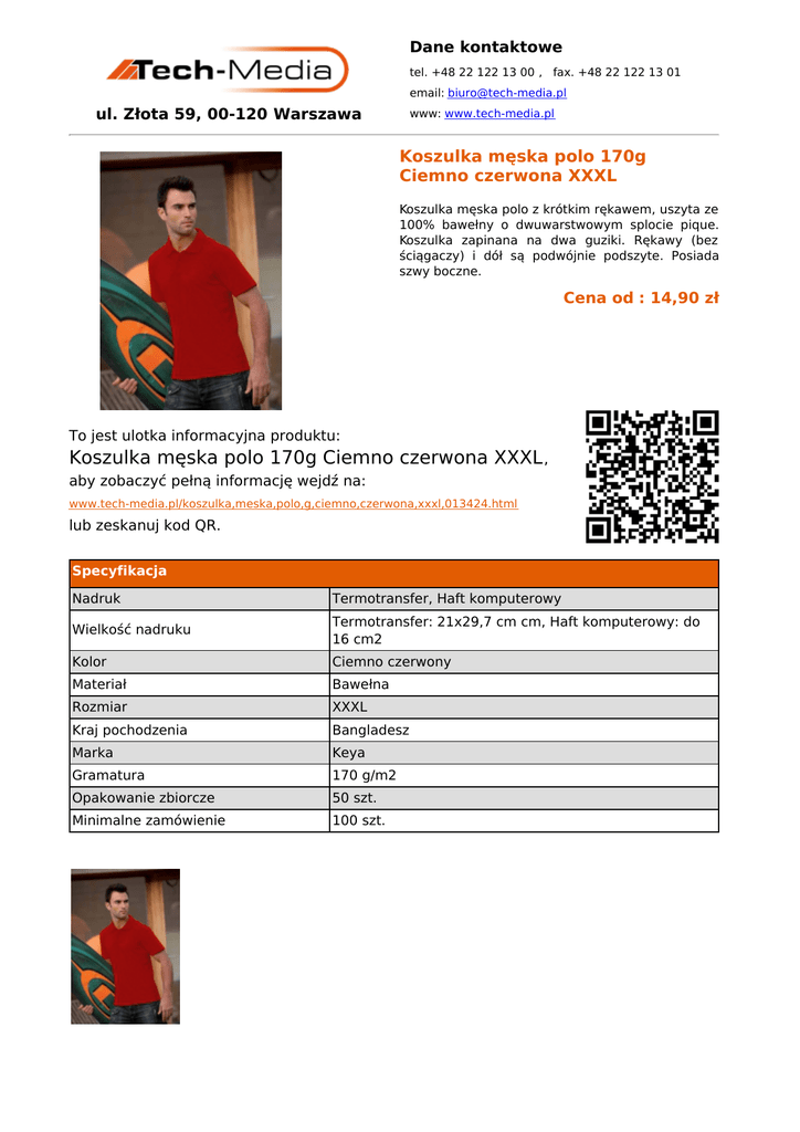 Dane kontaktowe tel. +48 22 122 13 00 , fax. +48 22 122 13 01 email: [email protected] ul. Złota 59, 00-120 Warszawa www: www.tech-media.pl Koszulka męska polo 170g Ciemno czerwona XXXL Koszulka męska polo z krótkim rękawem, uszyta ze 100% bawełny o dwuwarstwowym splocie pique. Koszulka zapinana na dwa guziki. Rękawy (bez ściągaczy) i dół są podwójnie podszyte. Posiada szwy boczne. Cena od : 14,90 zł To jest ulotka informacyjna produktu: Koszulka męska polo 170g Ciemno czerwona XXXL , aby zobaczyć pełną informację wejdź na: www.tech-media.pl/koszulka,meska,polo,g,ciemno,czerwona,xxxl,013424.html lub zeskanuj kod QR. Specyfikacja Nadruk Termotransfer, Haft komputerowy Wielkość nadruku Termotransfer: 21x29,7 cm cm, Haft komputerowy: do 16 cm2 Kolor Ciemno czerwony Materiał Bawełna Rozmiar XXXL Kraj pochodzenia Bangladesz Marka Keya Gramatura 170 g/m2 Opakowanie zbiorcze 50 szt. Minimalne zamówienie 100 szt.